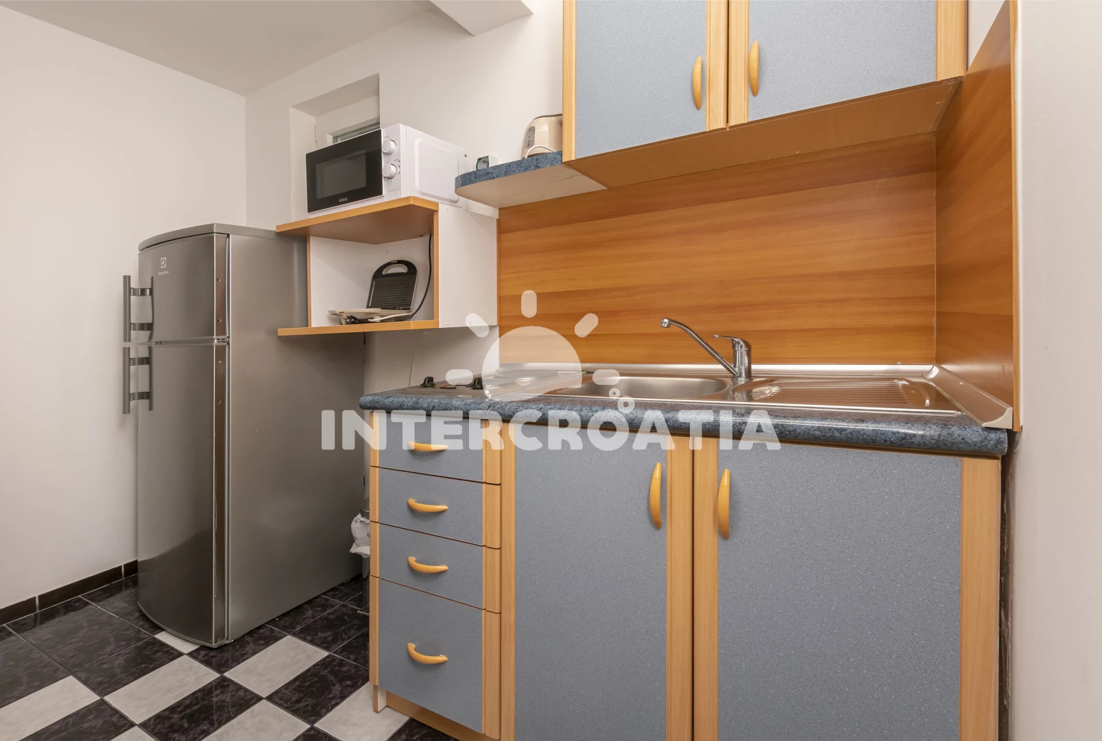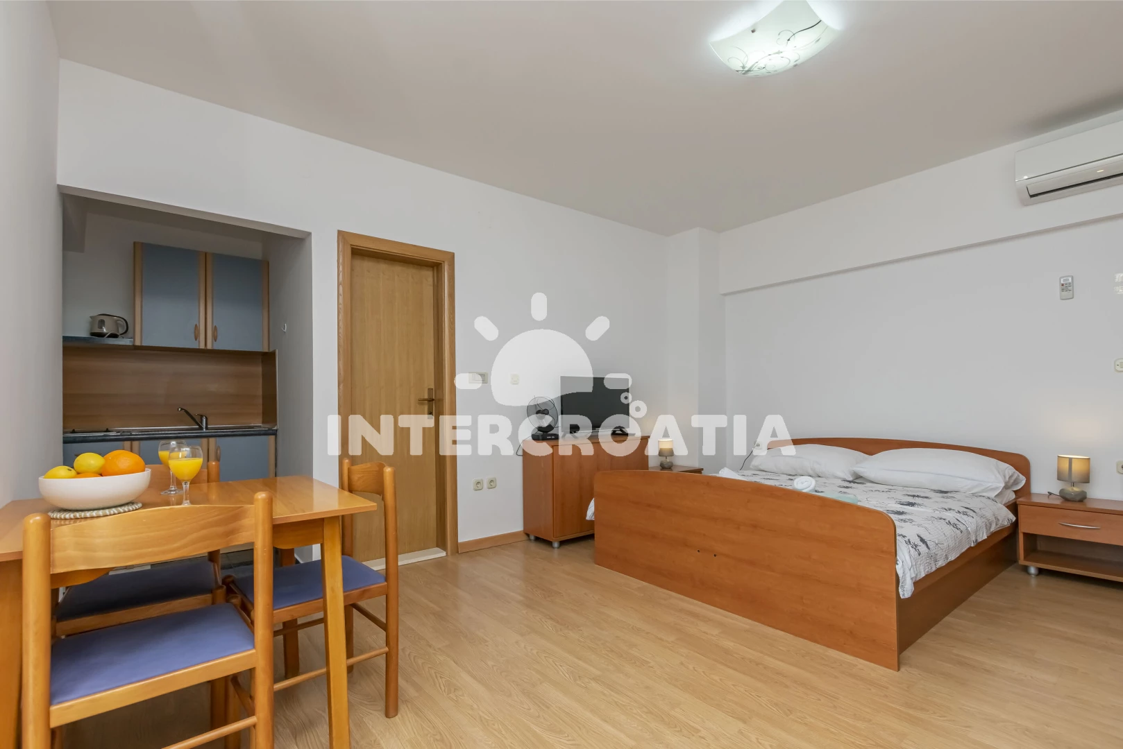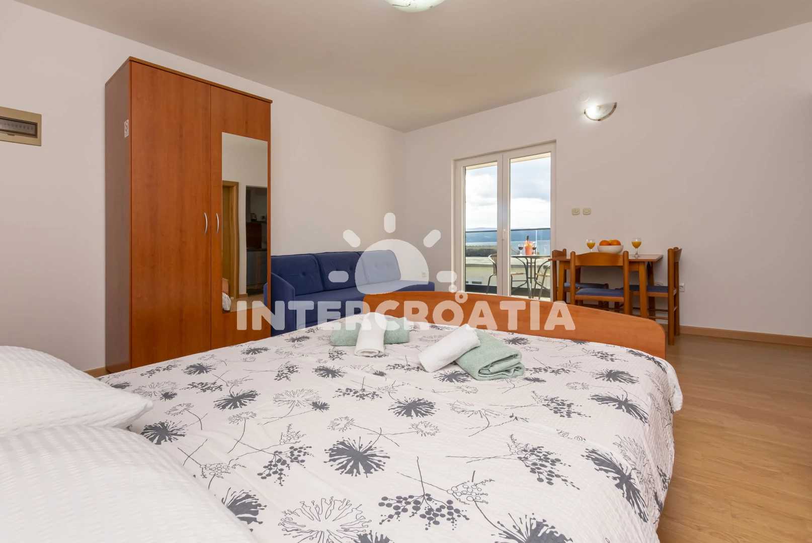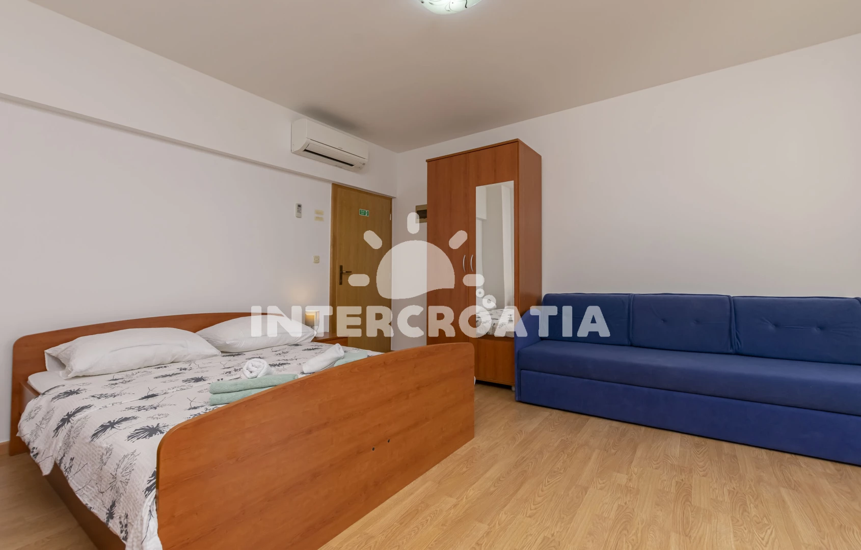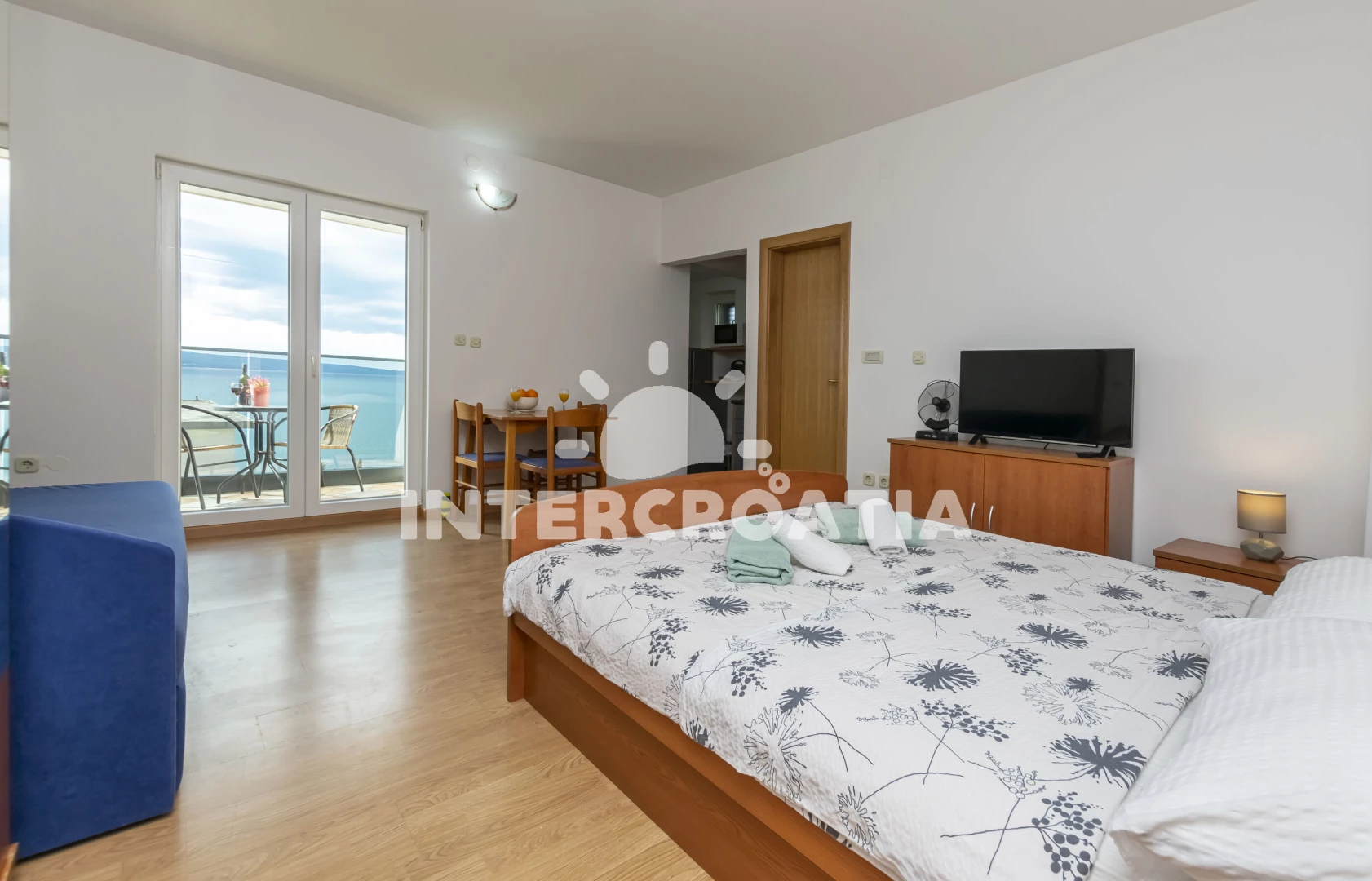 Apartmán (20 m2) typu studio s balkonem, a výhledem na moře. Nachází se ve 2. patře objektu. Kuchyňská linka je vybavena varnou deskou, toustovačem, mikrovlnnou troubou, rychlovarnou konvicí, nádobím, lednicí, mrazákem. K dispozici dvoulůžko, televize, žehlička. Koupelna se sprchovým koutem, umyvadlem, fénem a WC.