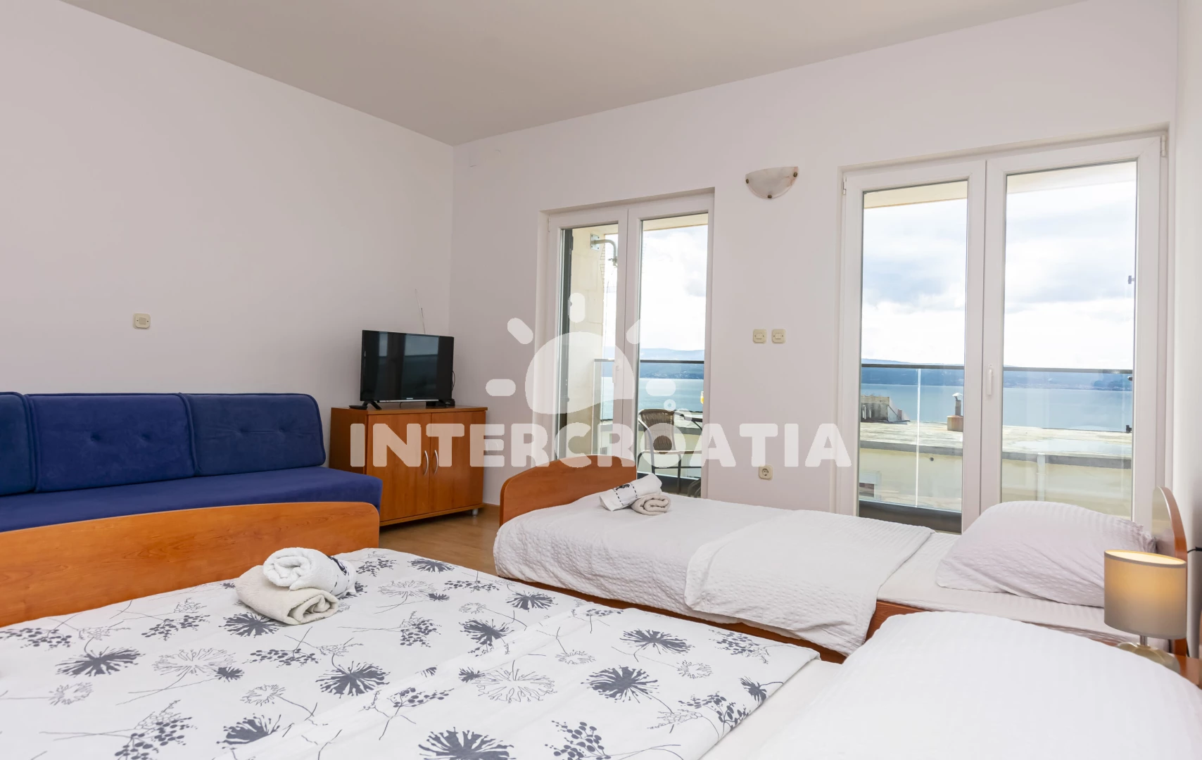 Apartmán (35 m2) typu studio s balkonem, a výhledem na moře. Nachází se ve 2. patře objektu. Kuchyňská linka je vybavena varnou deskou, toustovačem, mikrovlnnou troubou, rychlovarnou konvicí, nádobím, lednicí, mrazákem. K dispozici dvoulůžko, televize, žehlička. Koupelna se sprchovým koutem, umyvadlem, fénem a WC.