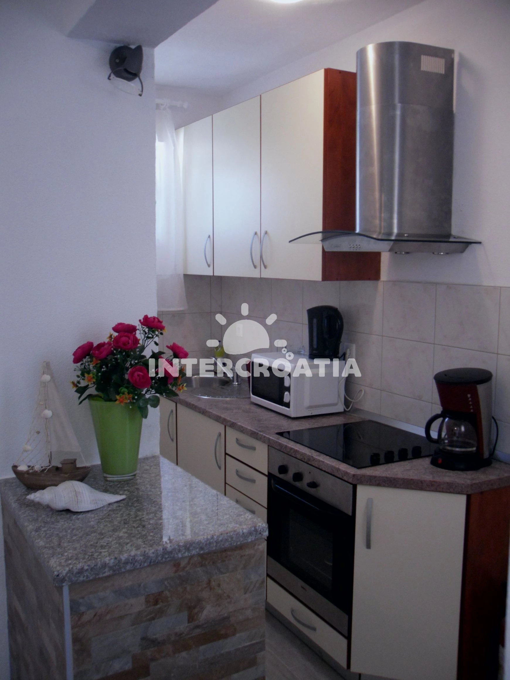 Apartmán se nachází 250 m od moře a pláže. Pláž je oblázková a větší kamení. U objektu je k dispozici společná zahrada s posezením a grilem. Parkování je před domem.