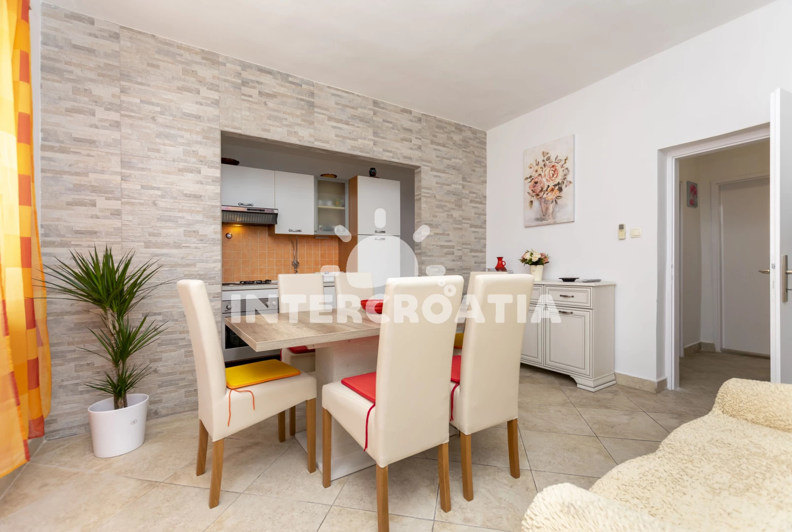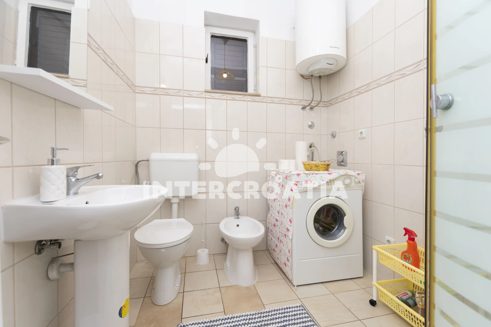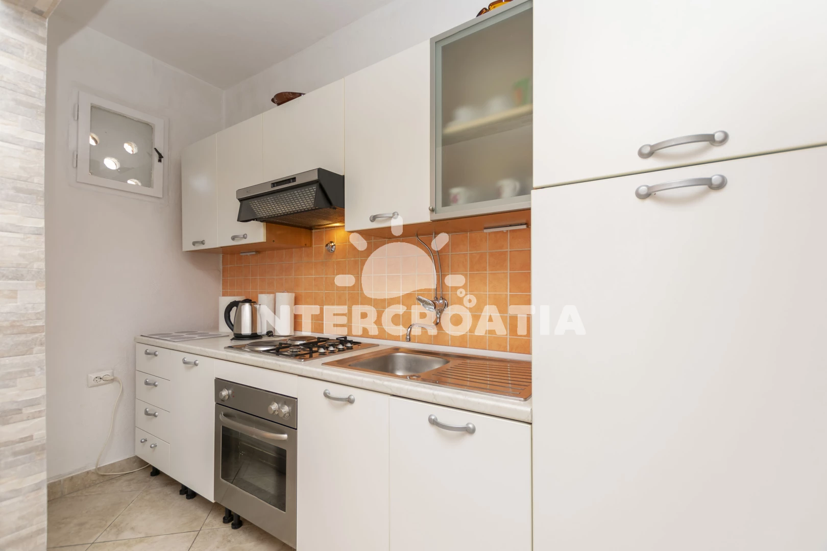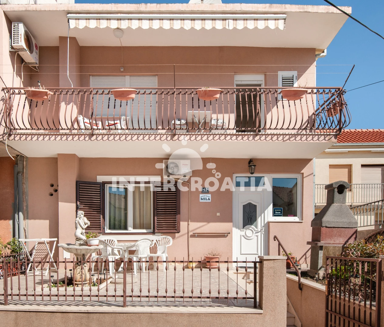 Vzdálenosti: Moře 50 m, pláž 100 m (oblázky), supermarket 50 m, restaurace 50 m, bar 50 m, veřejná doprava 50 m, banka 100 m, centrum 100 m, směnárna 100 m, pošta 500 m, letiště (Split) 3 km, trajekt (Split) 15 km,