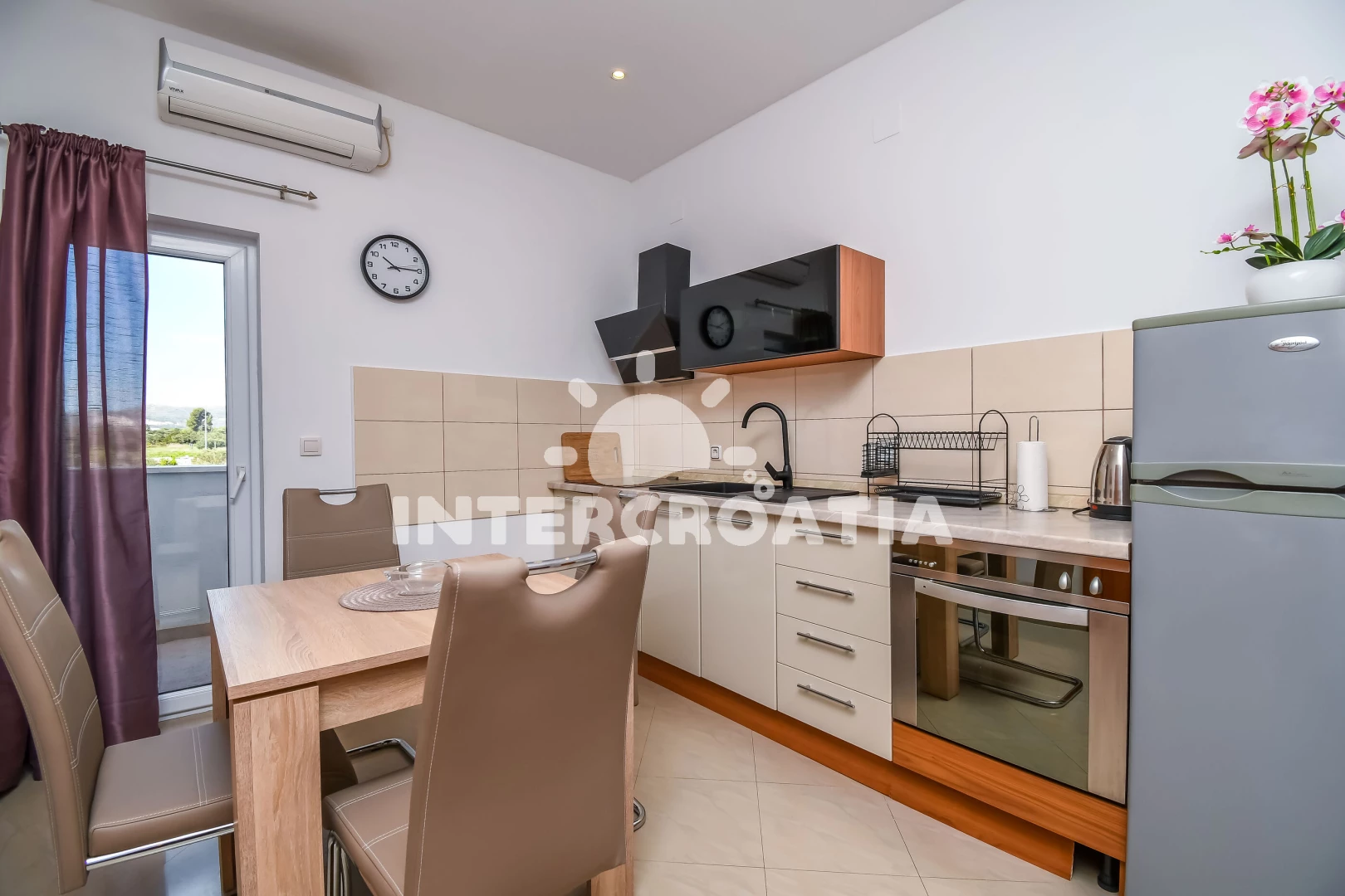 Vzdálenosti: Moře 500 m, pláž 500 m (oblázky), supermarket 100 m, bar 300 m, veřejná doprava 300 m, restaurace 400 m, centrum 500 m, banka 1 km, pošta 1 km, tenisové kurty 2 km, směnárna 2 km, čerpací stanice 2 km, letiště (Split) 3 km, ambulance 3 km, lékárna 3 km, marina 5 km, trajekt (Split) 15 km, park Plitvice 64 km,