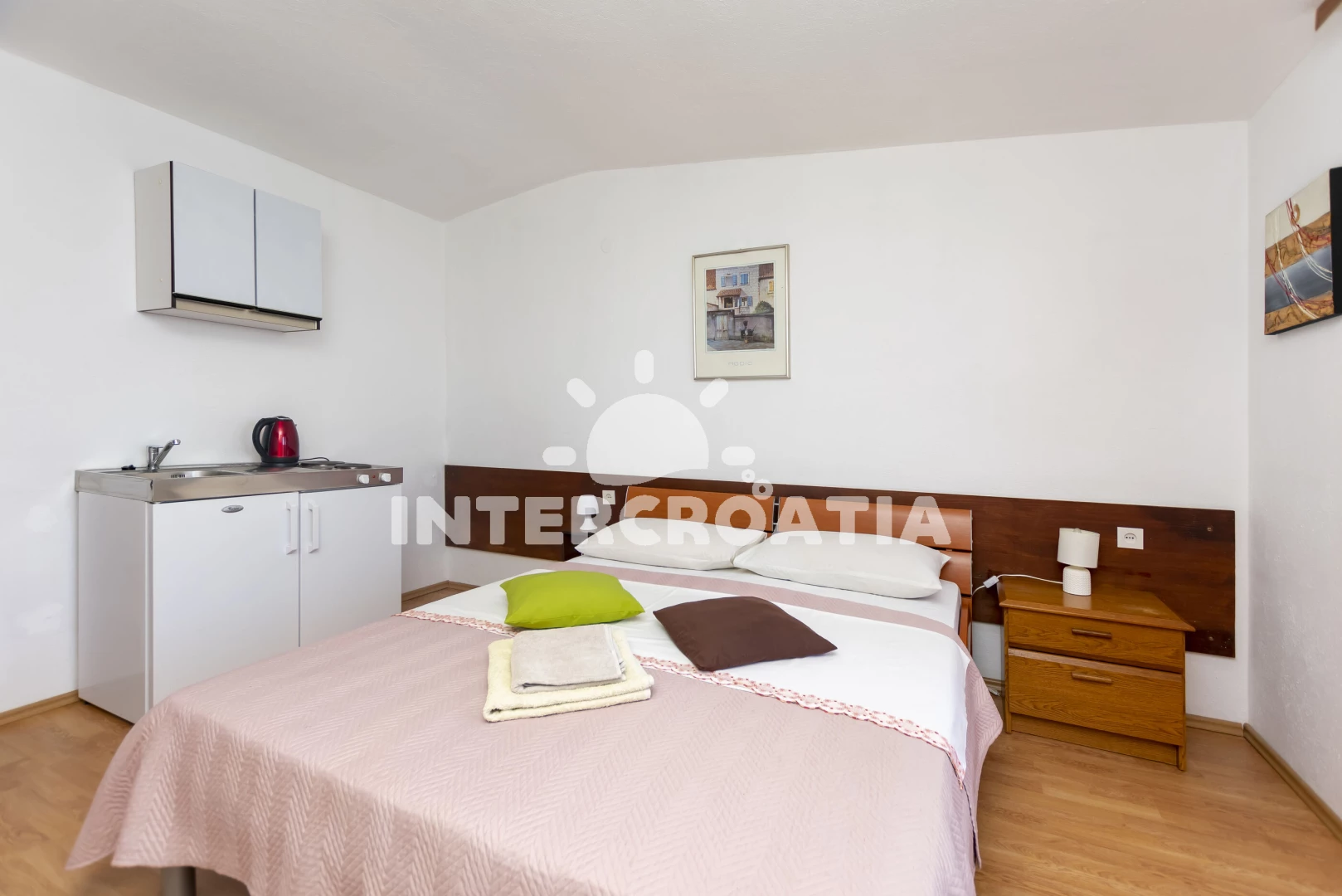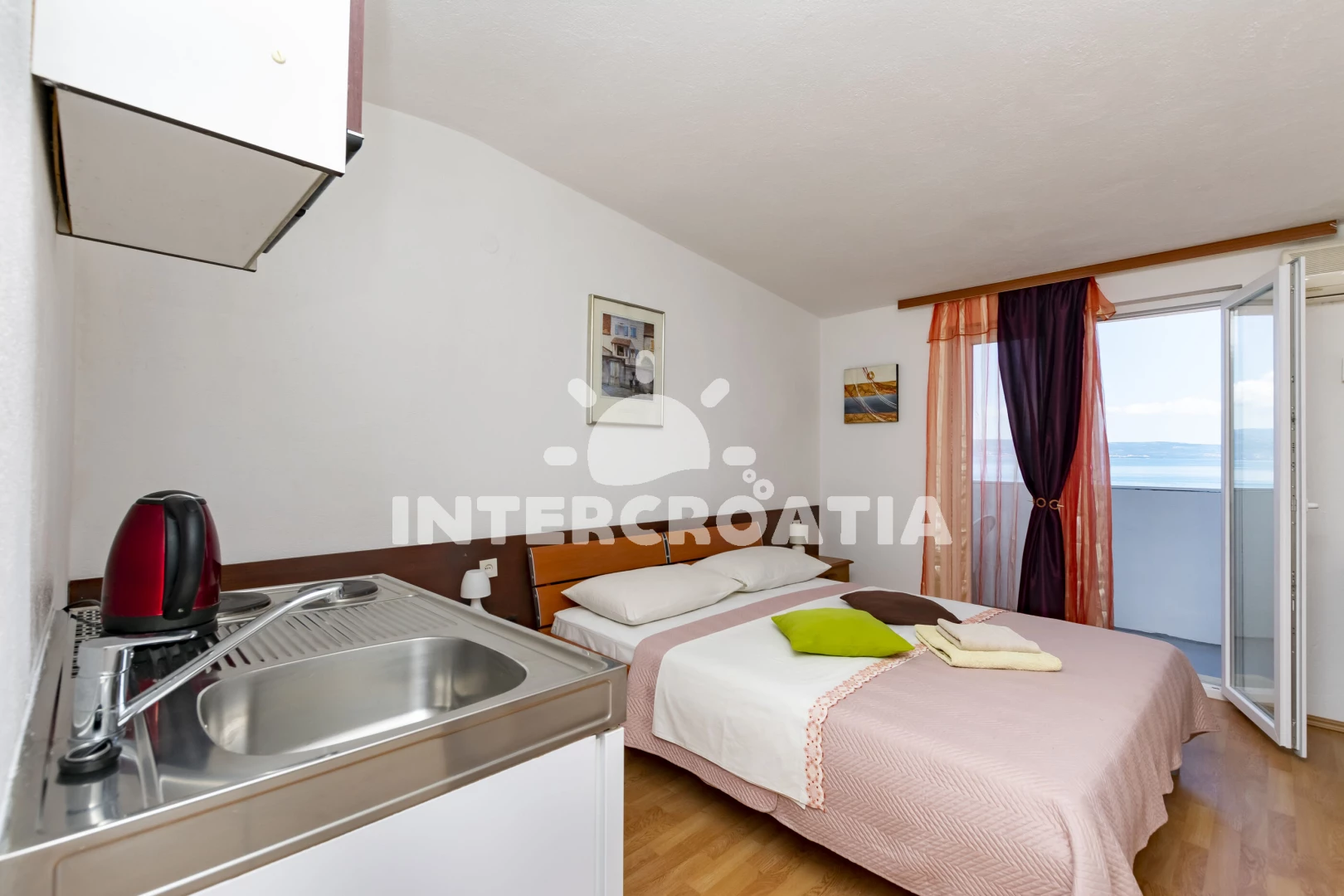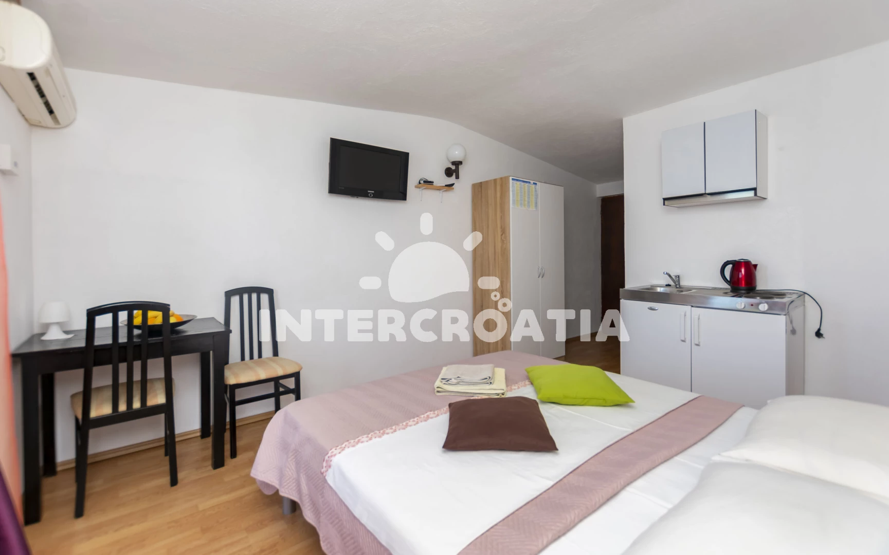 Apartmán typu studio (30 m2) s balkonem, a výhledem na moře. Nachází se ve 2. patře objektu. Kuchyňská linka je vybavena varnou deskou, rychlovarnou konvicí, nádobím, mini lednicí. K dispozici dvoulůžko, televize, žehlička. Koupelna se sprchovým koutem, umyvadlem, fénem a WC.