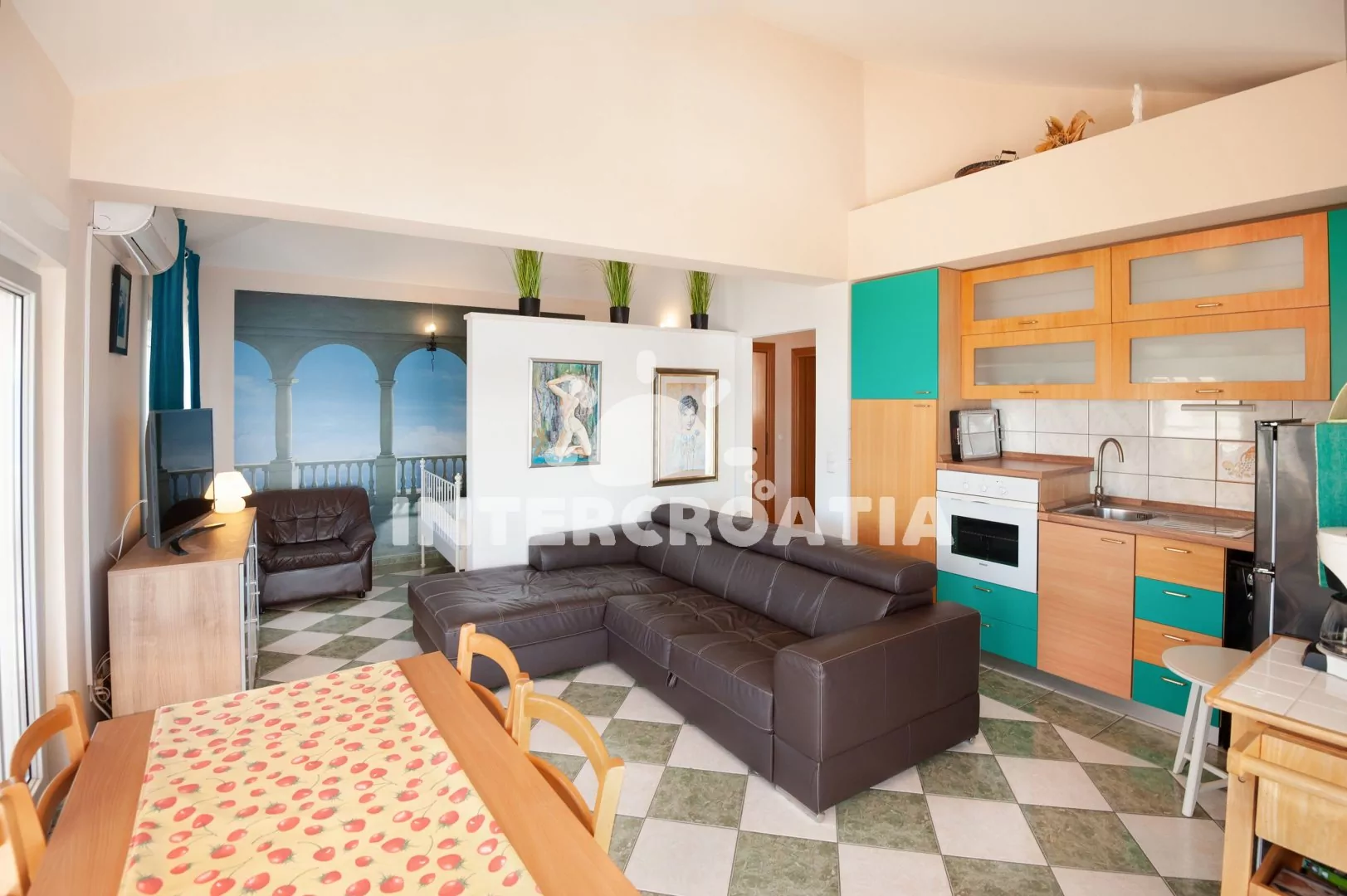 Komfortně zařízený apartmán s terasou, nacházející se v 2. patře domu. Vstup, obývací pokoj spojený s kuchyní. Kuchyňská linka se sklokeramickou varnou deskou, troubou, lednicí s mrazákem, kávovarem,…