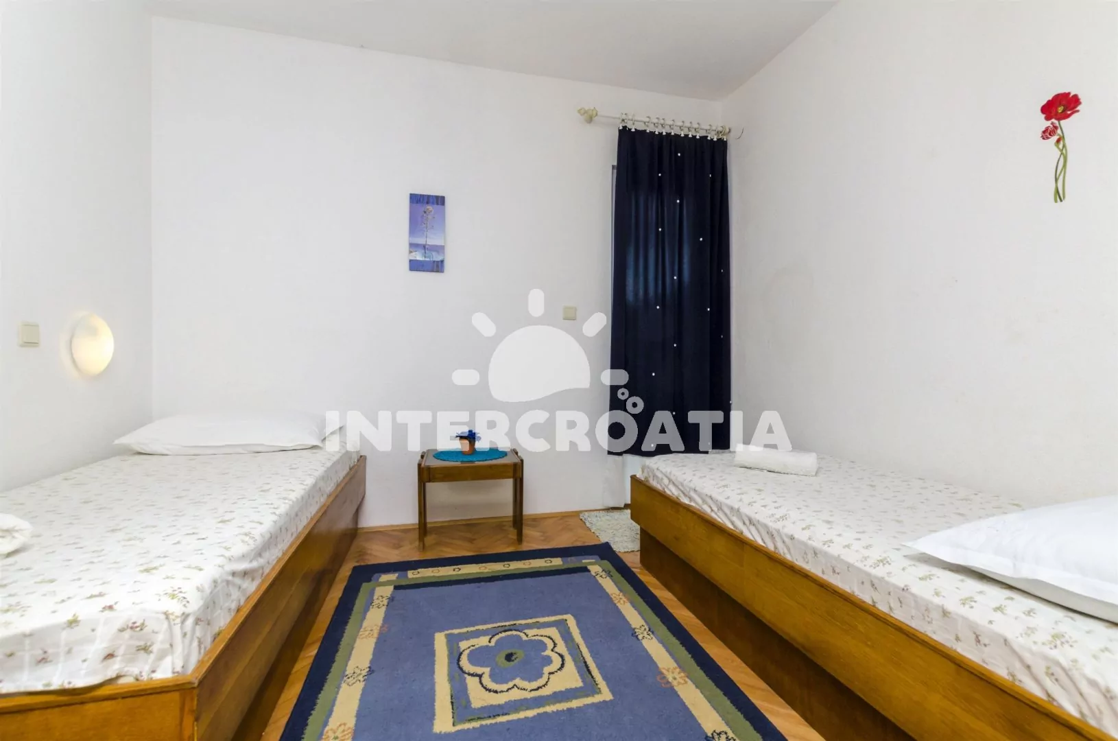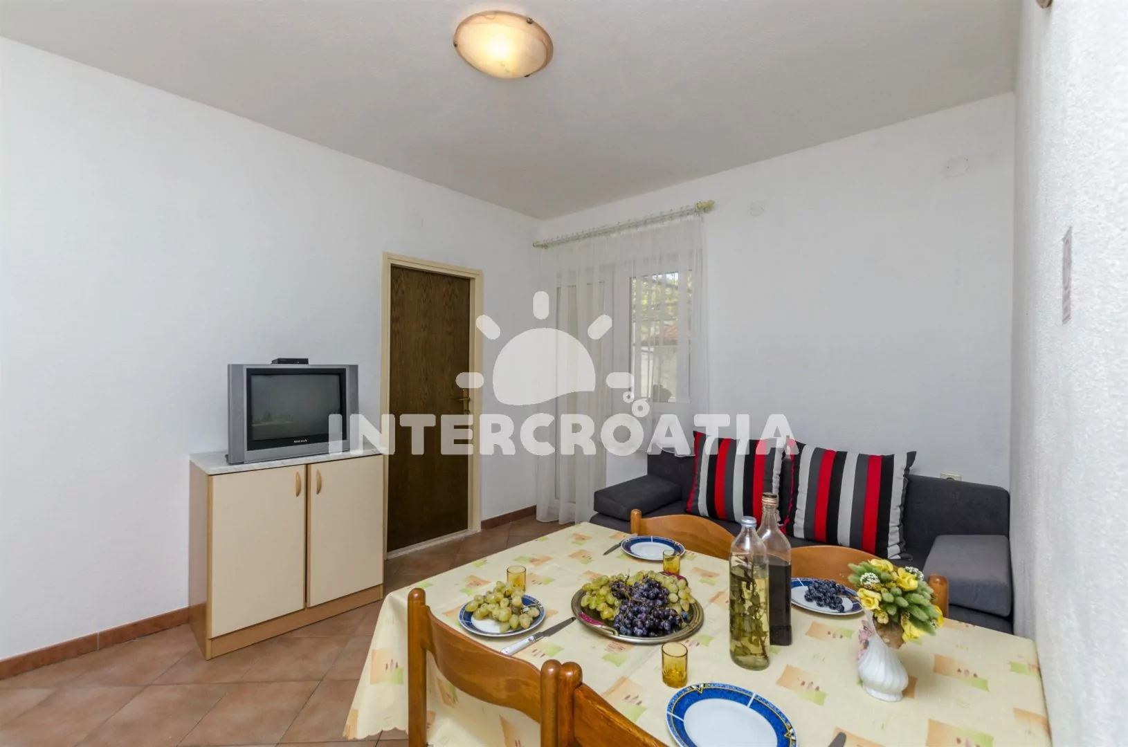 Apartmán se třemi pokoji a krytou terasou, nacházející se v 1. patře domu. Obývací pokoj spojený s kuchyní. Kuchyňská linka s dvouplotýnkovým elektrickým vařičem, lednicí s mrazákem, rychlovarnou konvicí a nádobím. V pokoji jídelní stůl pro 4 osoby, pohovka (rozkládací na extra lůžko pro 2 osoby) a televize se satelitem. Ložnice s dvoulůžkem. Druhá ložnice s dvěma jednolůžky. Koupelna se sprchovým koutem, umyvadlem a wc. Hosté mají k dispozici terasu s posezením a v zahradě společný gril. Parkování u objektu.