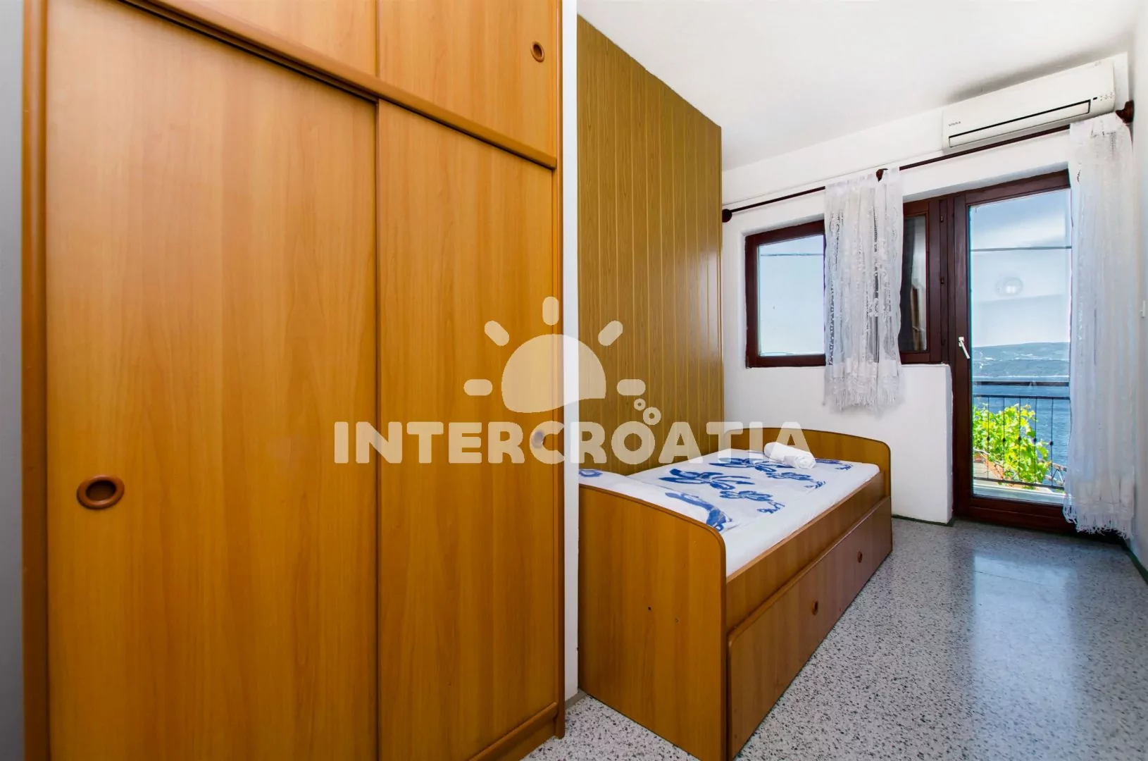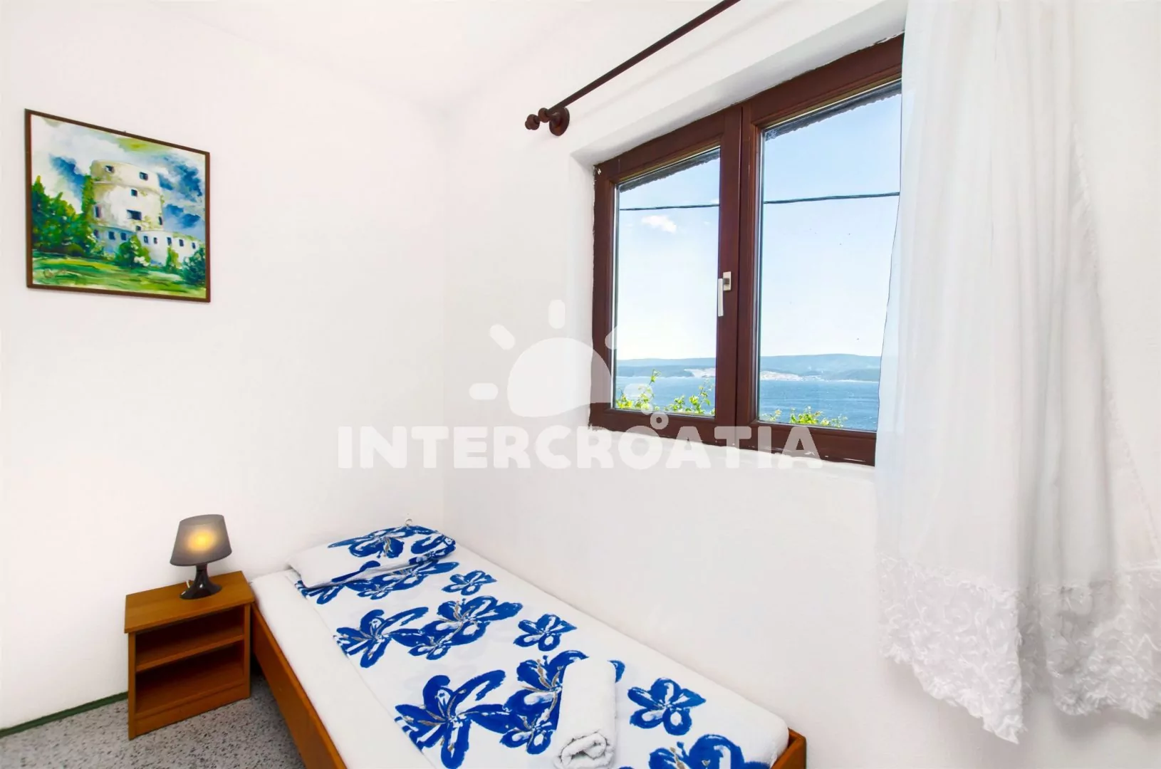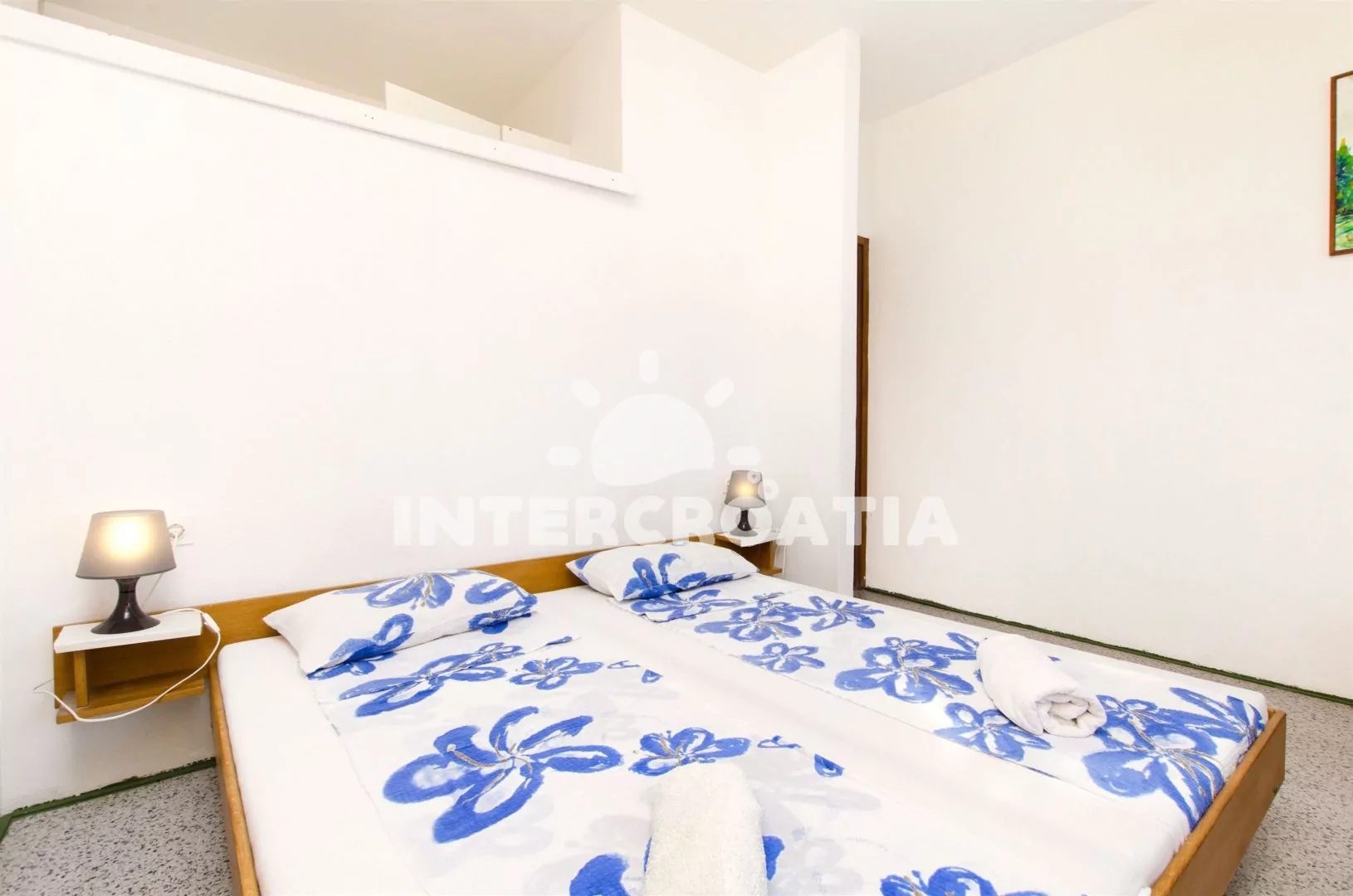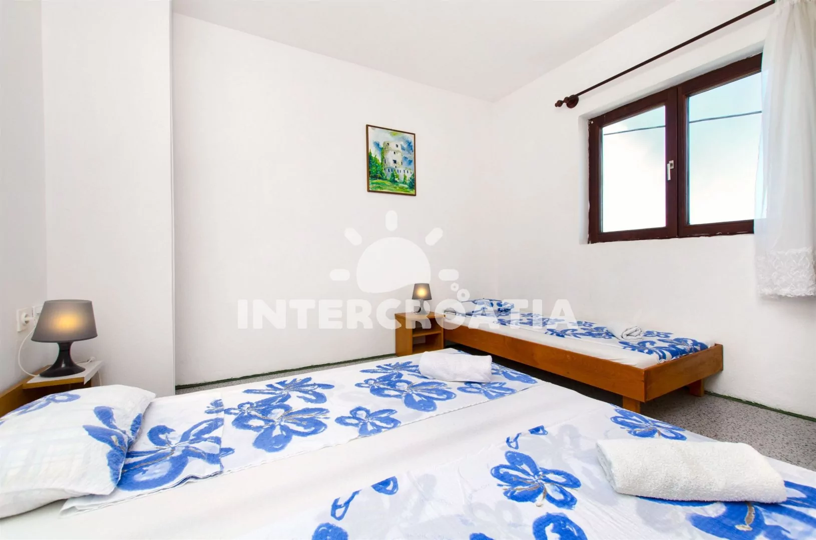 Prostorný studiový apartmán s balkonem, posezením a výhledem na moře, nacházející se v 1. patře domu. Vstup, obývací pokoj s jedním jednolůžkem a kuchyňským koutem. Kuchyňská linka s dvouplotýnkovým vařičem, mikrovlnnou troubou, lednicí s mrazákem, rychlovarnou konvicí a nádobím. K dispozici televize. V zadní oddělené části obývacího pokoje ložnice s dvoulůžkem a jedním jednolůžkem. Koupelna se sprchovým koutem, umyvadlem a wc. Hosté mají k dispozici balkon s posezením, úchvatným výhledem na moře a v zahradě společnou terasu s grilem. Parkování u objektu.