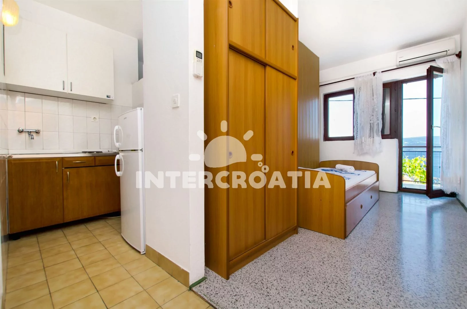 Prostorný studiový apartmán s balkonem, posezením a výhledem na moře, nacházející se v 1. patře domu. Vstup, obývací pokoj s jedním jednolůžkem a kuchyňským koutem. Kuchyňská linka s dvouplotýnkovým…
