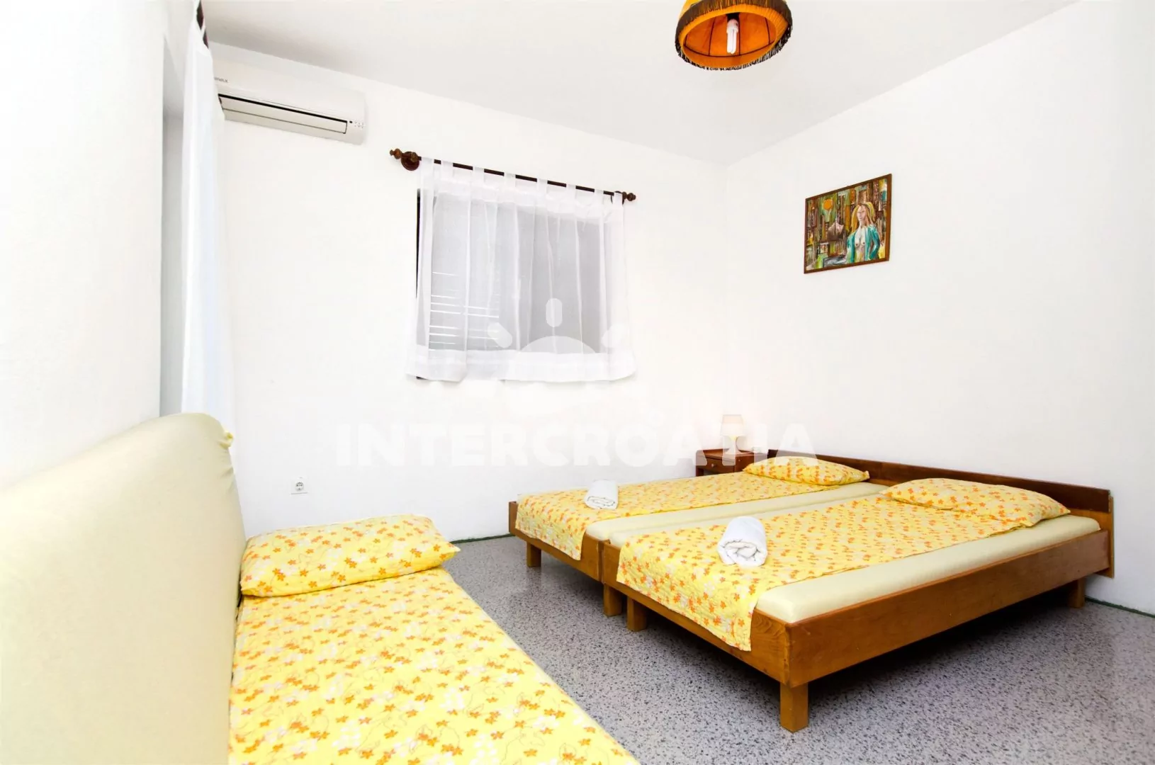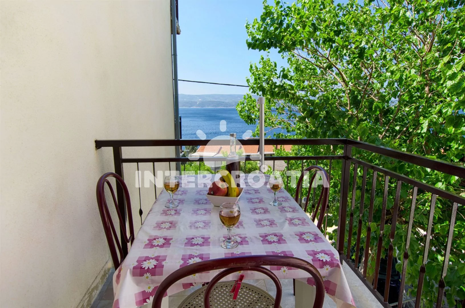 Studiový apartmán s balkonem s posezením a výhledem na moře, nacházející se v 1. patře domu. Vstup, obývací pokoj s dvoulůžkem, pohovkou (rozložitelná na extra lůžko pro 1 osobu) a kuchyňským koutem. Kuchyňská linka s dvouplotýnkovým vařičem, mikrovlnnou troubou, lednicí s mrazákem, rychlovarnou konvicí a nádobím. K dispozici televize. Koupelna se sprchovým koutem, umyvadlem a wc. Hosté mají k dispozici balkon s posezením, výhledem na moře a v zahradě společnou terasu s grilem. Parkování u objektu.