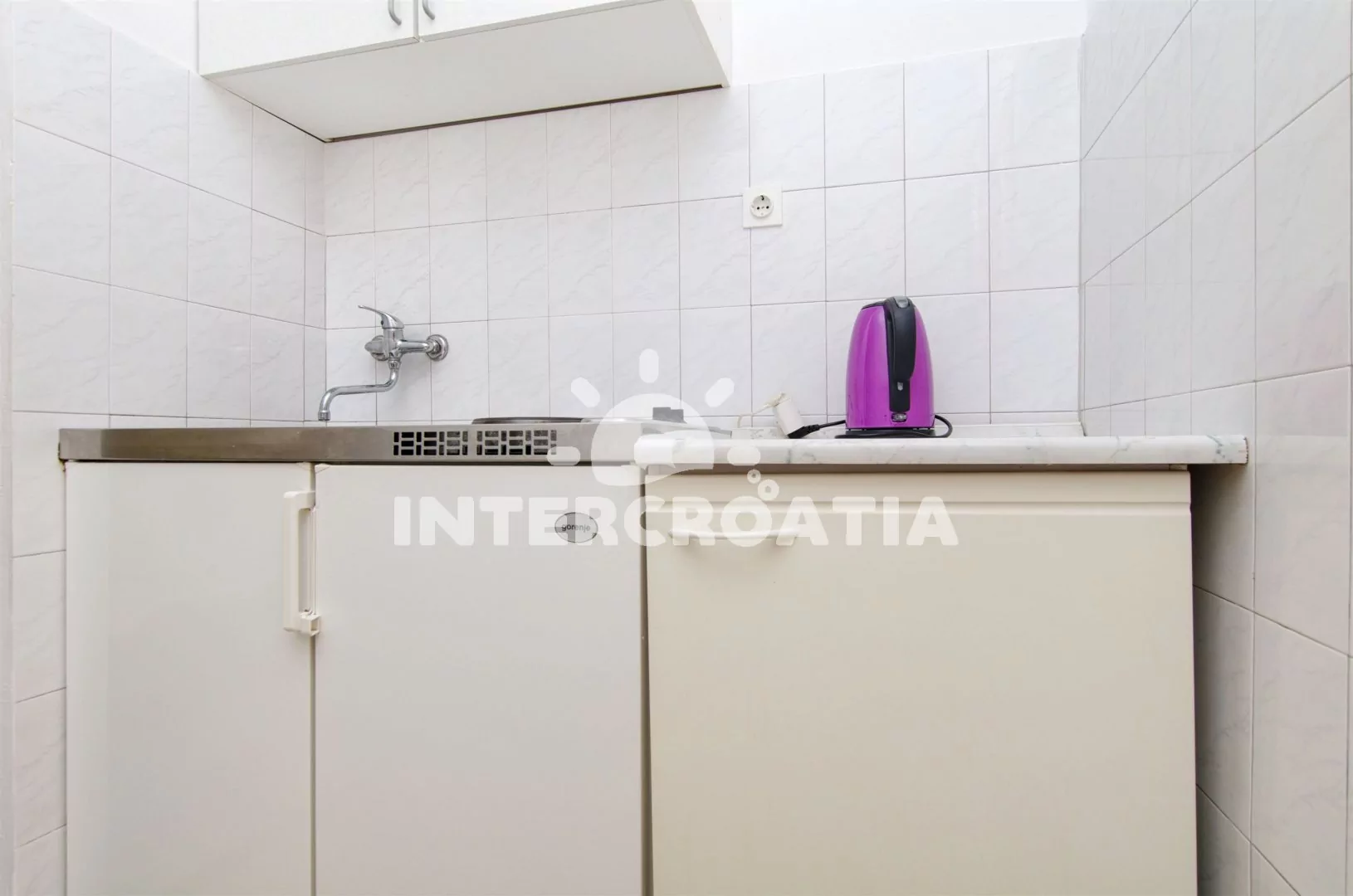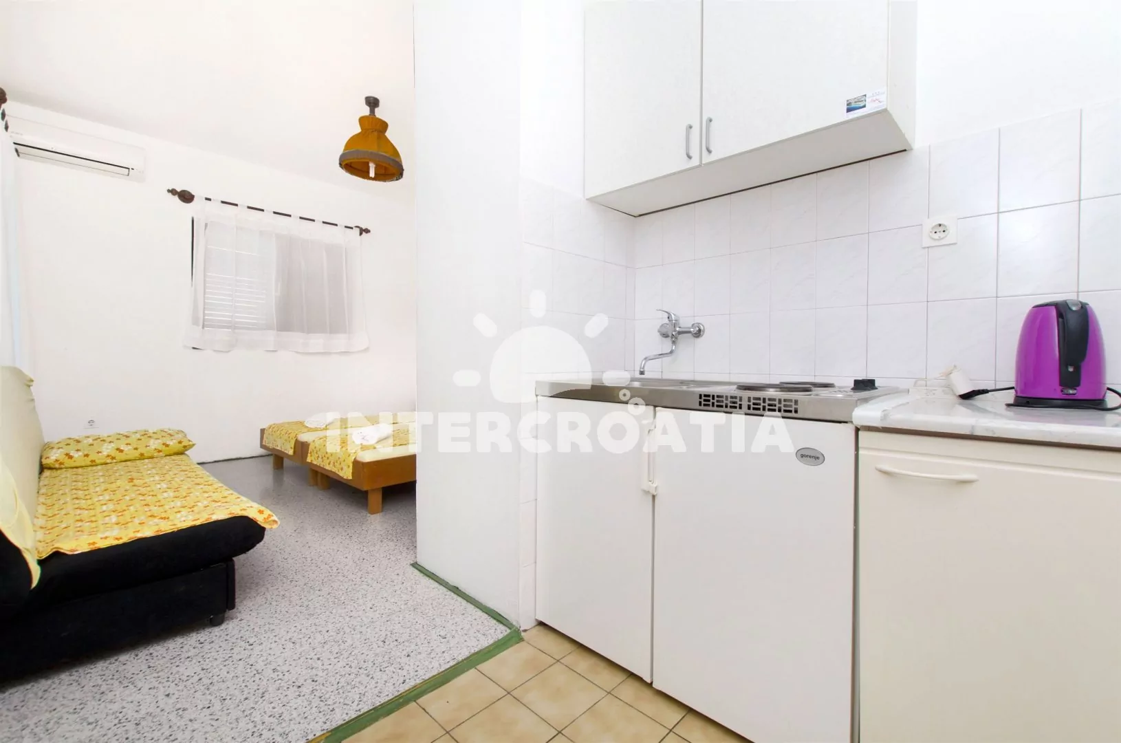 Studiový apartmán s balkonem s posezením a výhledem na moře, nacházející se v 1. patře domu. Vstup, obývací pokoj s dvoulůžkem, pohovkou (rozložitelná na extra lůžko pro 1 osobu) a kuchyňským koutem.…