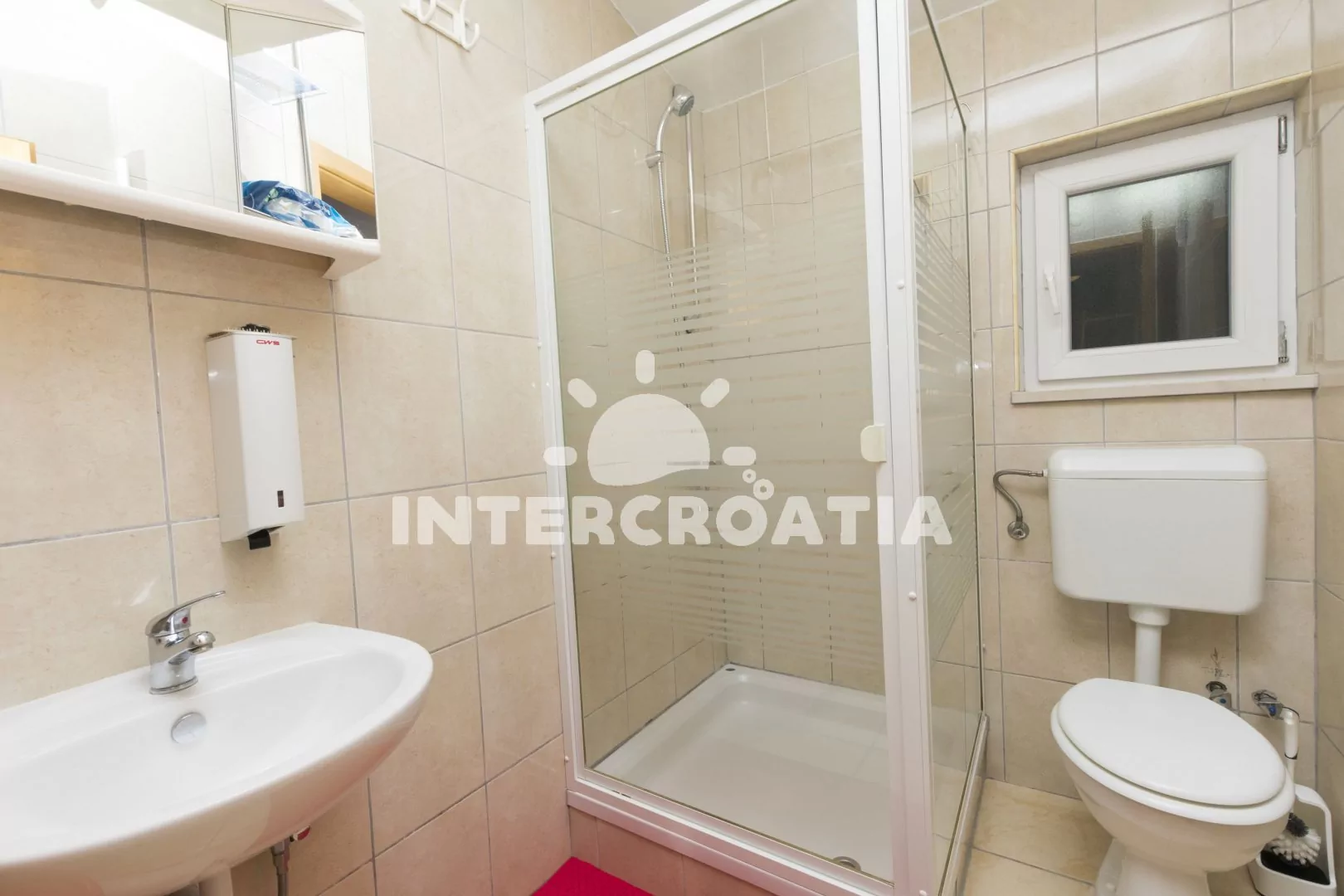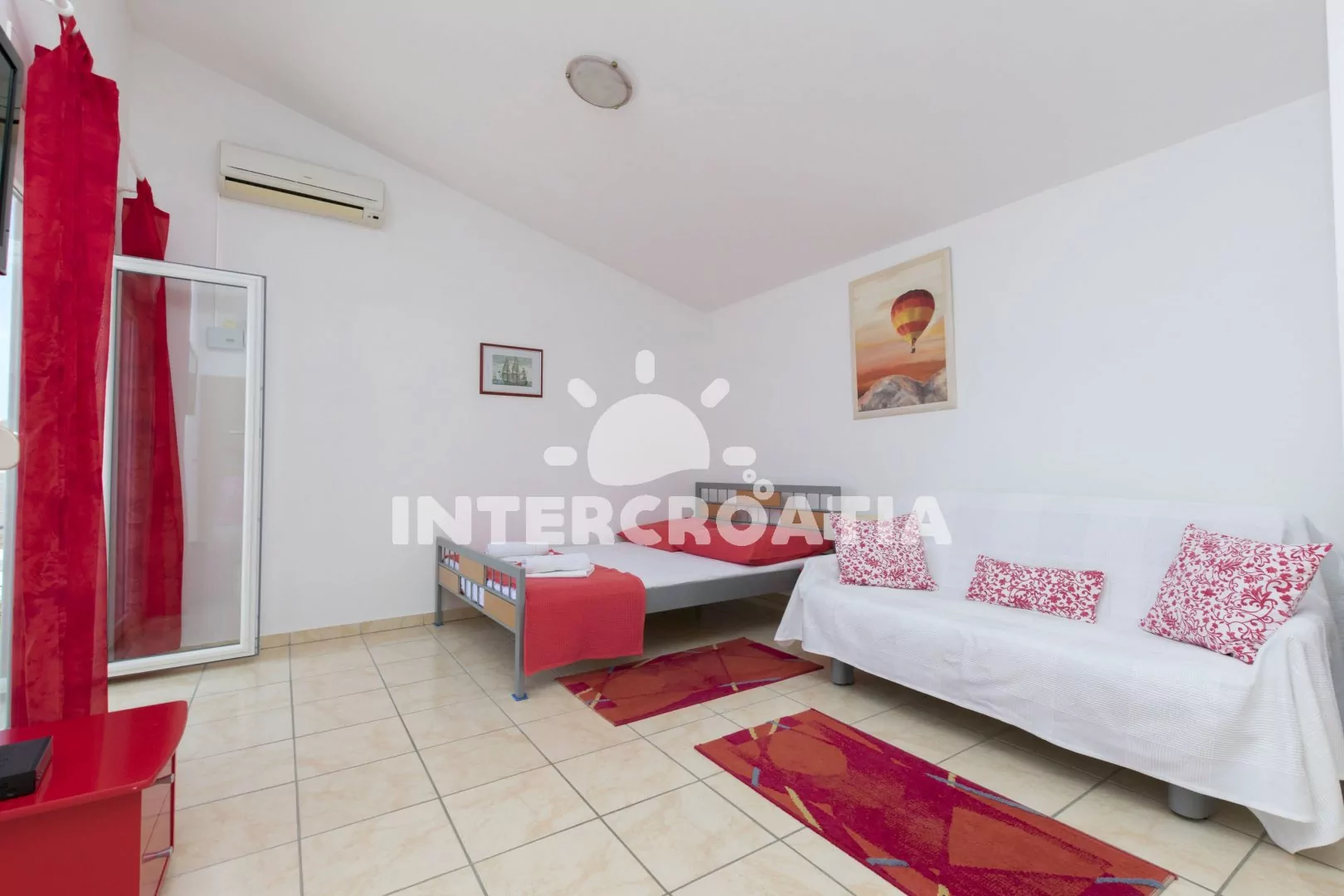 Apartmán typu studio, s výhledem na moře a balkonem s venkovním posezením. Nachází se v druhém patře domu. Kuchyňská linka s elektrickým dvouplotýnkovým sporákem, digestoří, mikrovlnnou troubou, toustovačem, rychlovarnou konvicí, kávovarem, nádobím a chladničkou. Obývací část s jídelním stolem pro 4 osoby, televizí se satelitním programem, jedním dvoulůžkem, rozložitelnou pohovkou (extra lůžko pro 2 osoby), klimatizací a vstupem na balkon. Koupelna se sprchovým koutem, umyvadlem a wc. Hostům je k dispozici parkování u objektu zdarma.