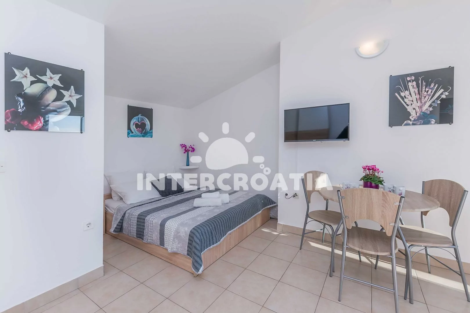 Apartmán typu studio (28 m2) s výhledem na moře se nachází v 2. patře domu a je vhodný pro 2 osoby. Obývací místnost je spojena s kuchyní. Kuchyňská linka je vybavena dvouplotýnkovým vařičem, kávovarem, rychlovarnou konvicí, nádobím a lednicí s mrazákem. Obývací místnost s jídelním stolem, dvoulůžkem, televizí se satelitním programem, klimatizací a vstupem na balkon. Koupelna se sprchovým koutem, umyvadlem, fénem a wc. Hostům je k dispozici parkování u objektu zdarma.