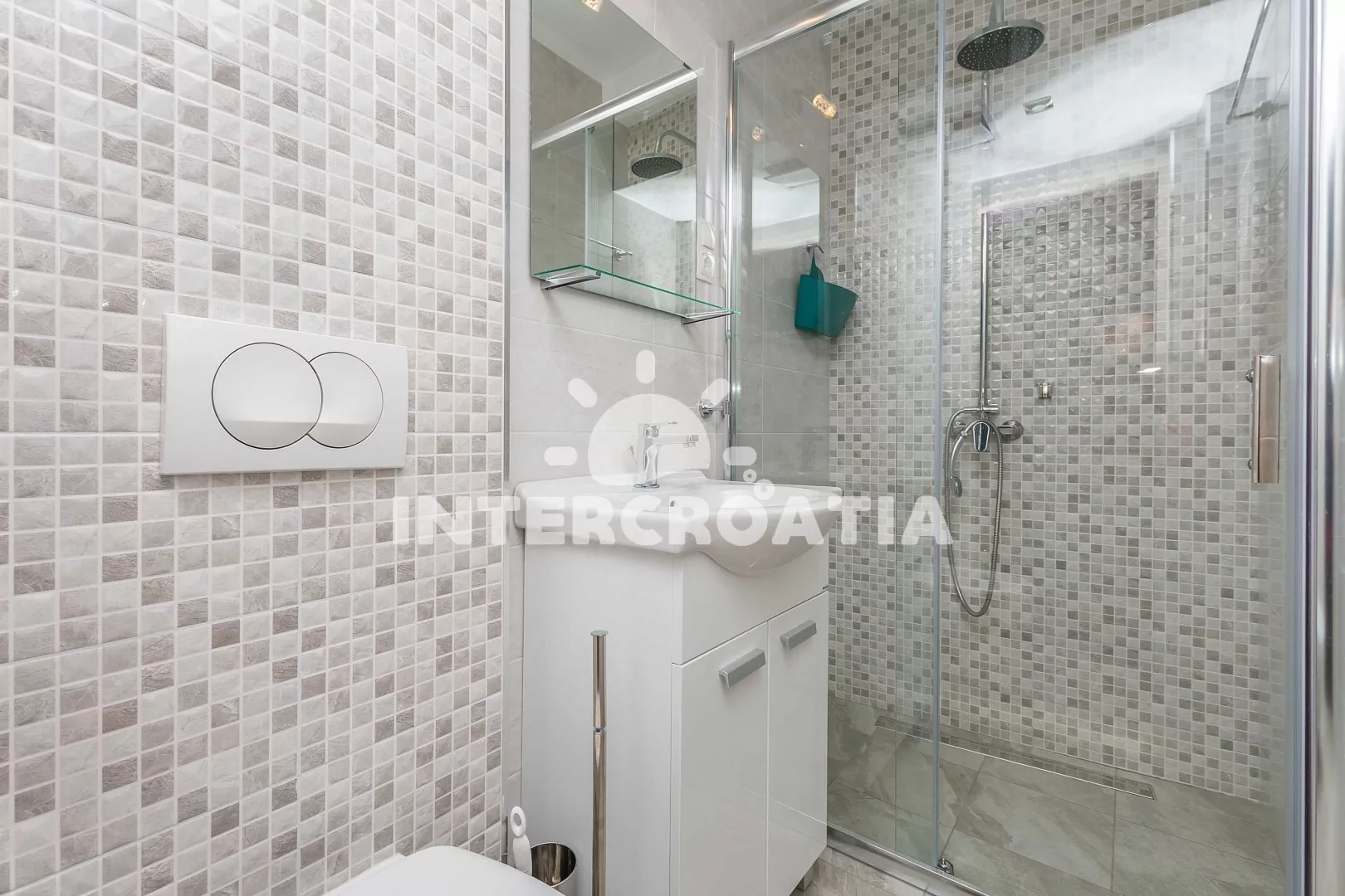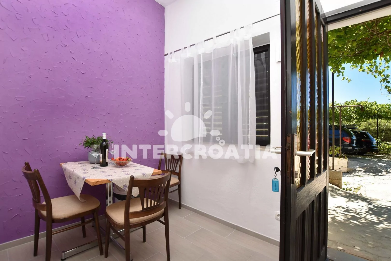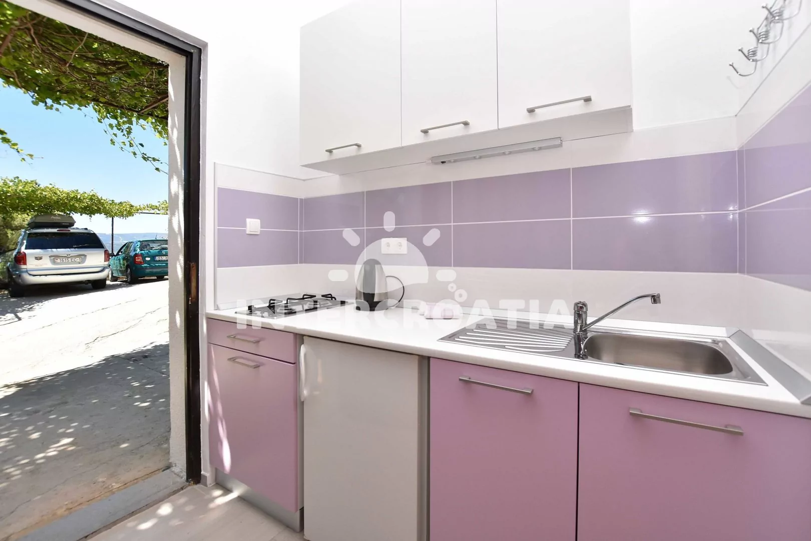 Apartmán typu studio (28 m2) s výhledem na moře se nachází v přízemí domu a je vhodný pro 2 osoby. Kuchyňská linka je vybavena dvouplotýnkovým vařičem, kávovarem, rychlovarnou konvicí, nádobím a lednicí s mrazákem. Dále jídelní stůl pro 3 osoby a klimatizace. Ložnice s dvoulůžkem a televizí se satelitním programem. Koupelna se sprchovým koutem, umyvadlem a wc. Hostům je k dispozici parkování u objektu zdarma.