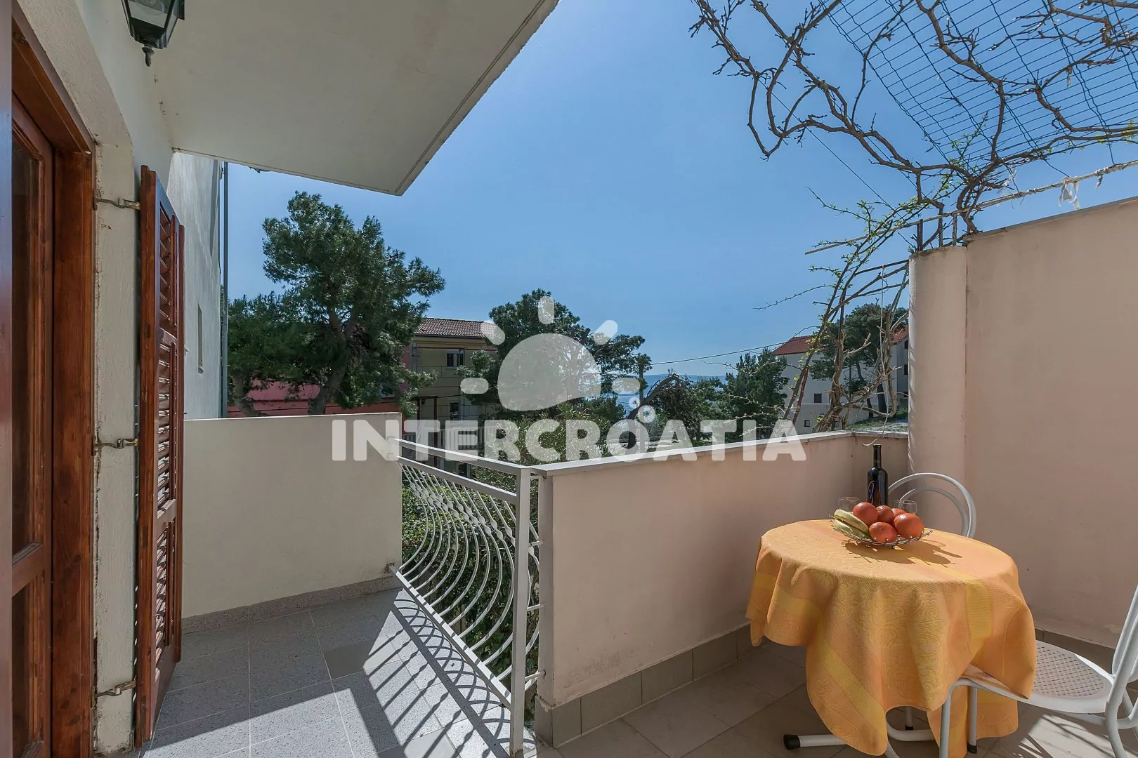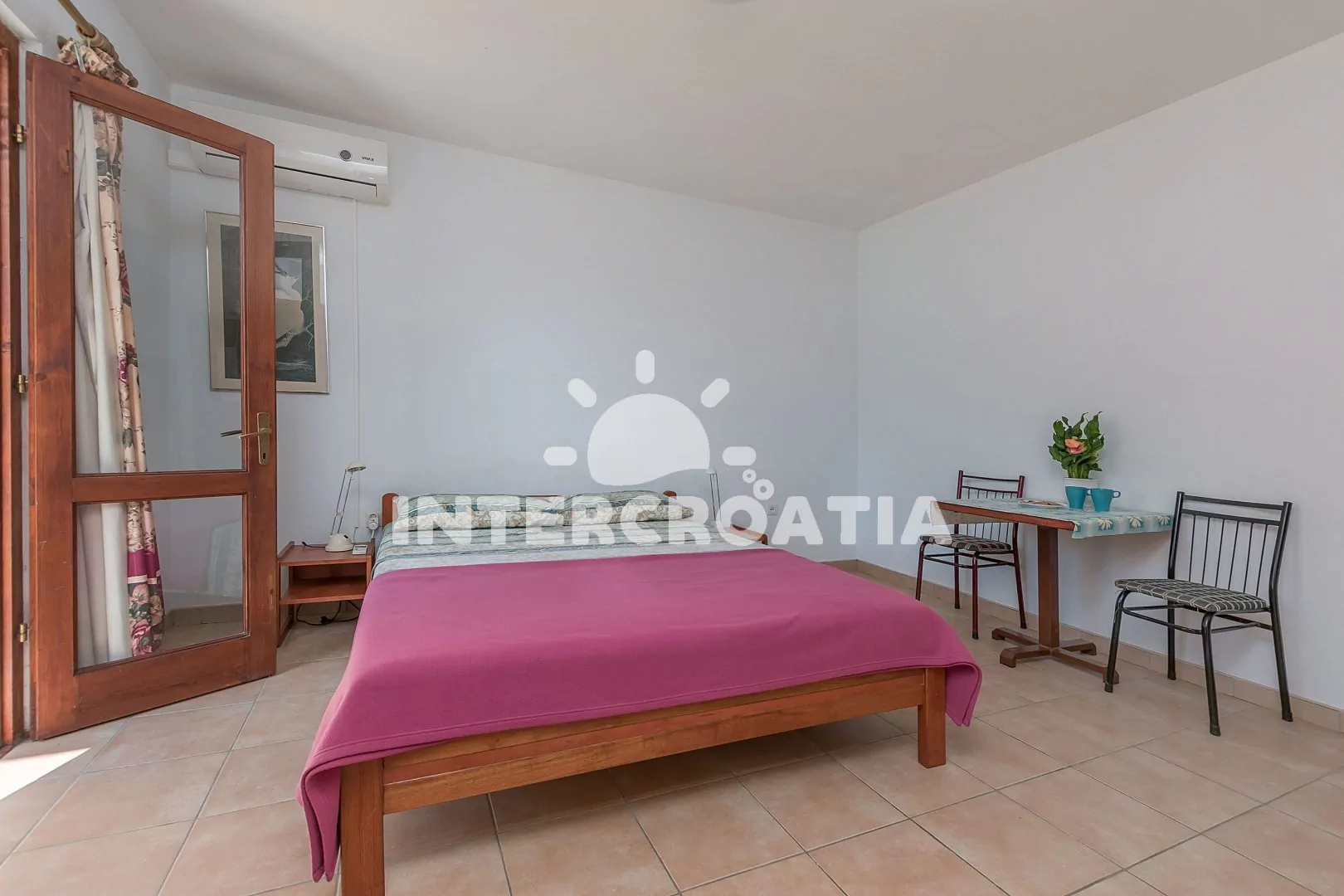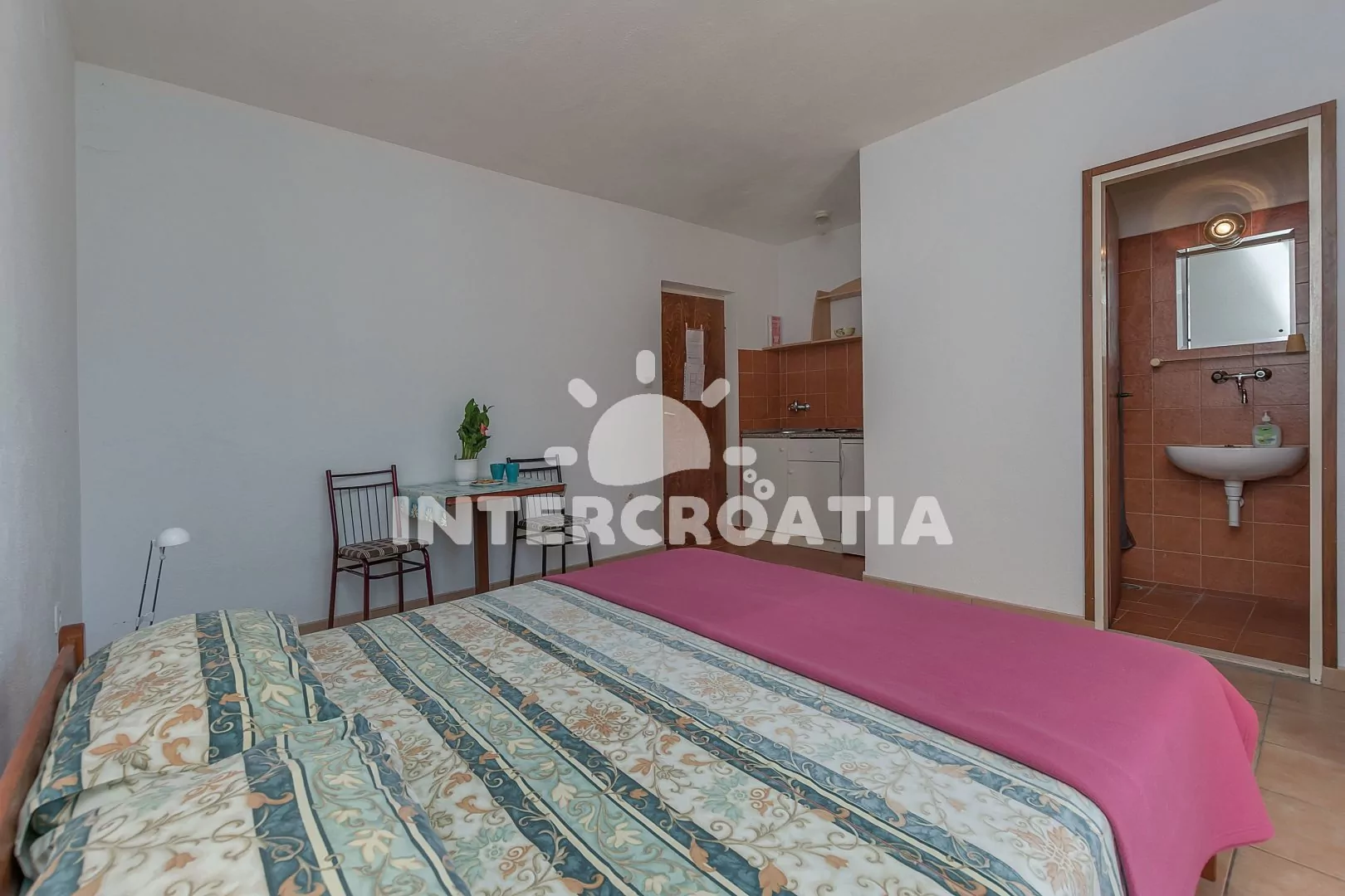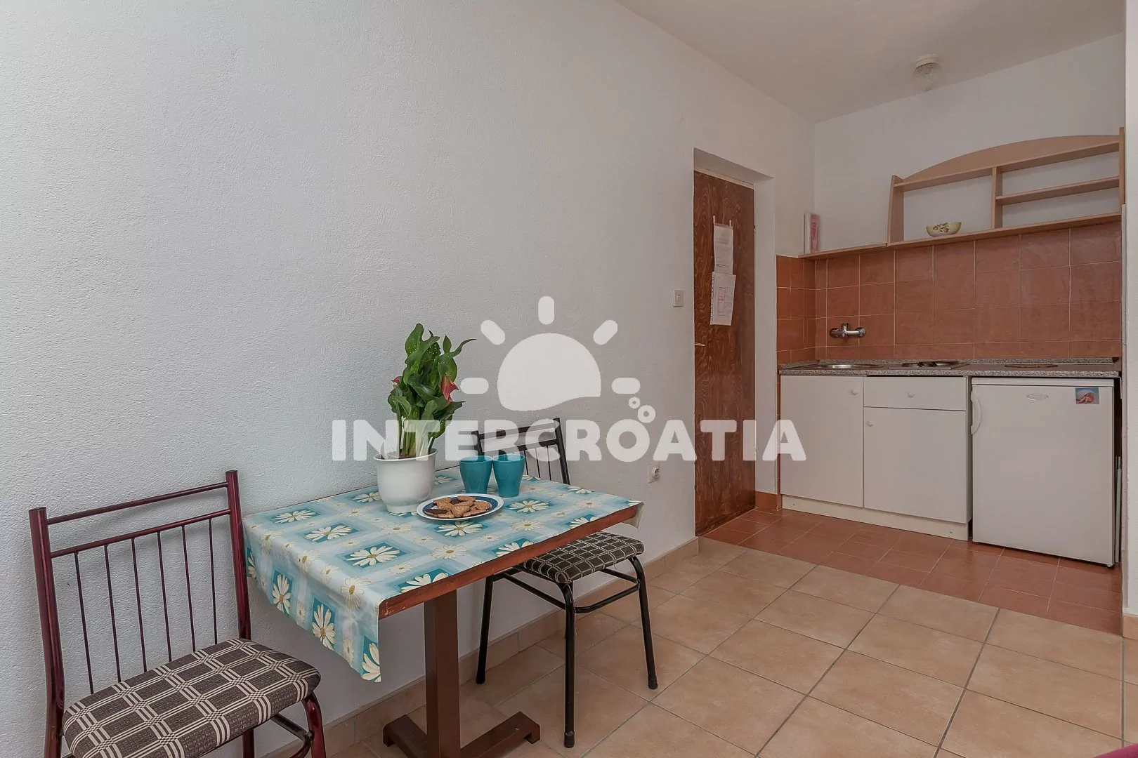 Apartmán typu studio (22 m2) s terasou a částečným výhledem na moře se nachází v 1. patře domu a je vhodný pro 2 osoby. Obývací místnost je spojena s kuchyní. Kuchyňská linka je vybavena dvouplotýnkovým vařičem, rychlovarnou konvicí, nádobím a lednicí s mrazákem, mikrovlnná trouba na požádání. Obývací místnost s jídelním stolem pro 2 osoby, dvoulůžkem, klimatizací a vstupem na terasu. Koupelna se sprchovým koutem, umyvadlem a wc. Hostům je k dispozici parkování u objektu zdarma.