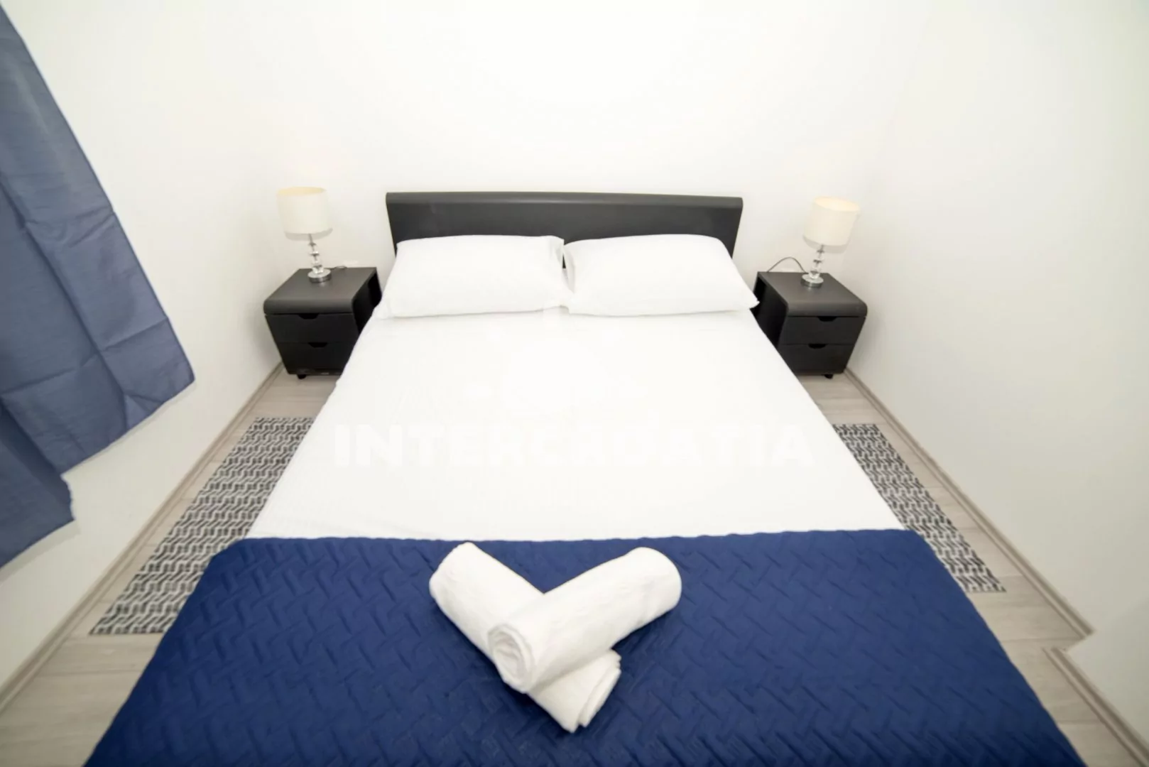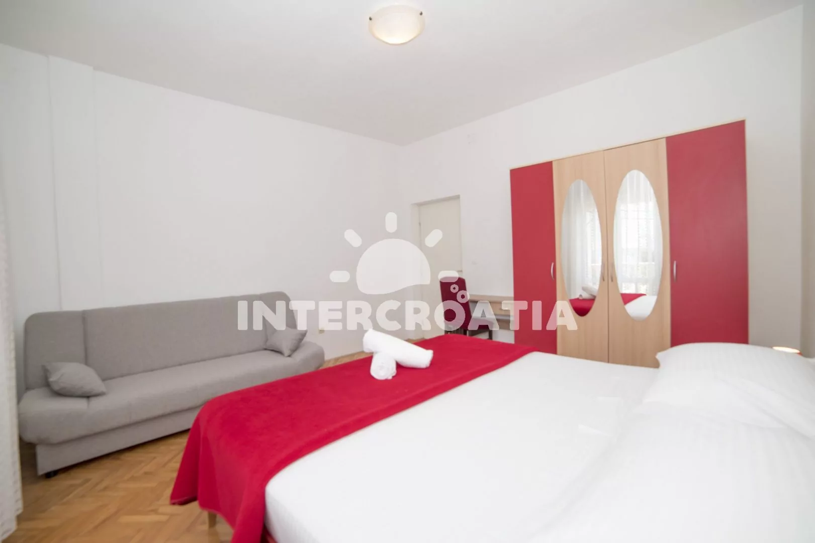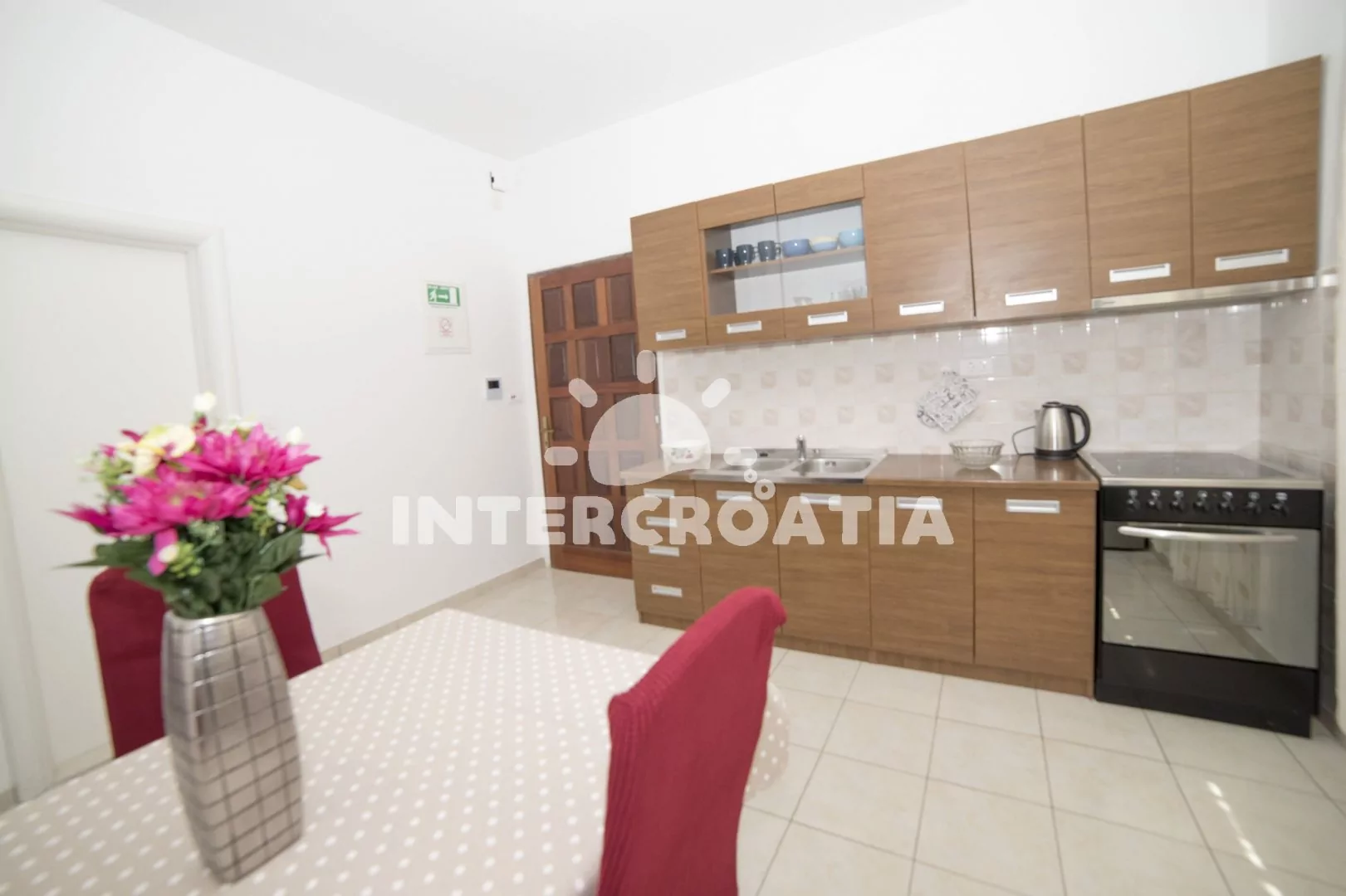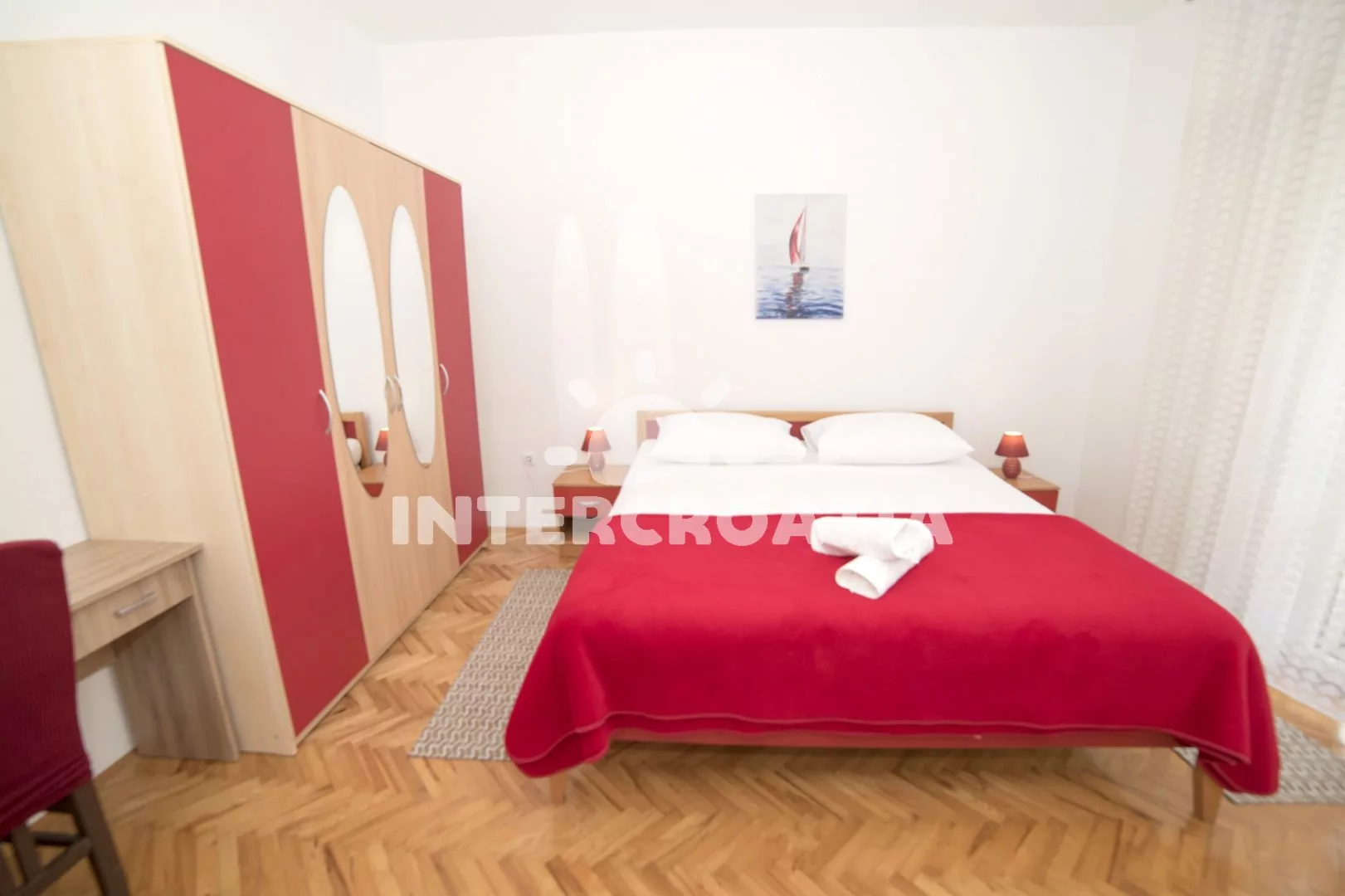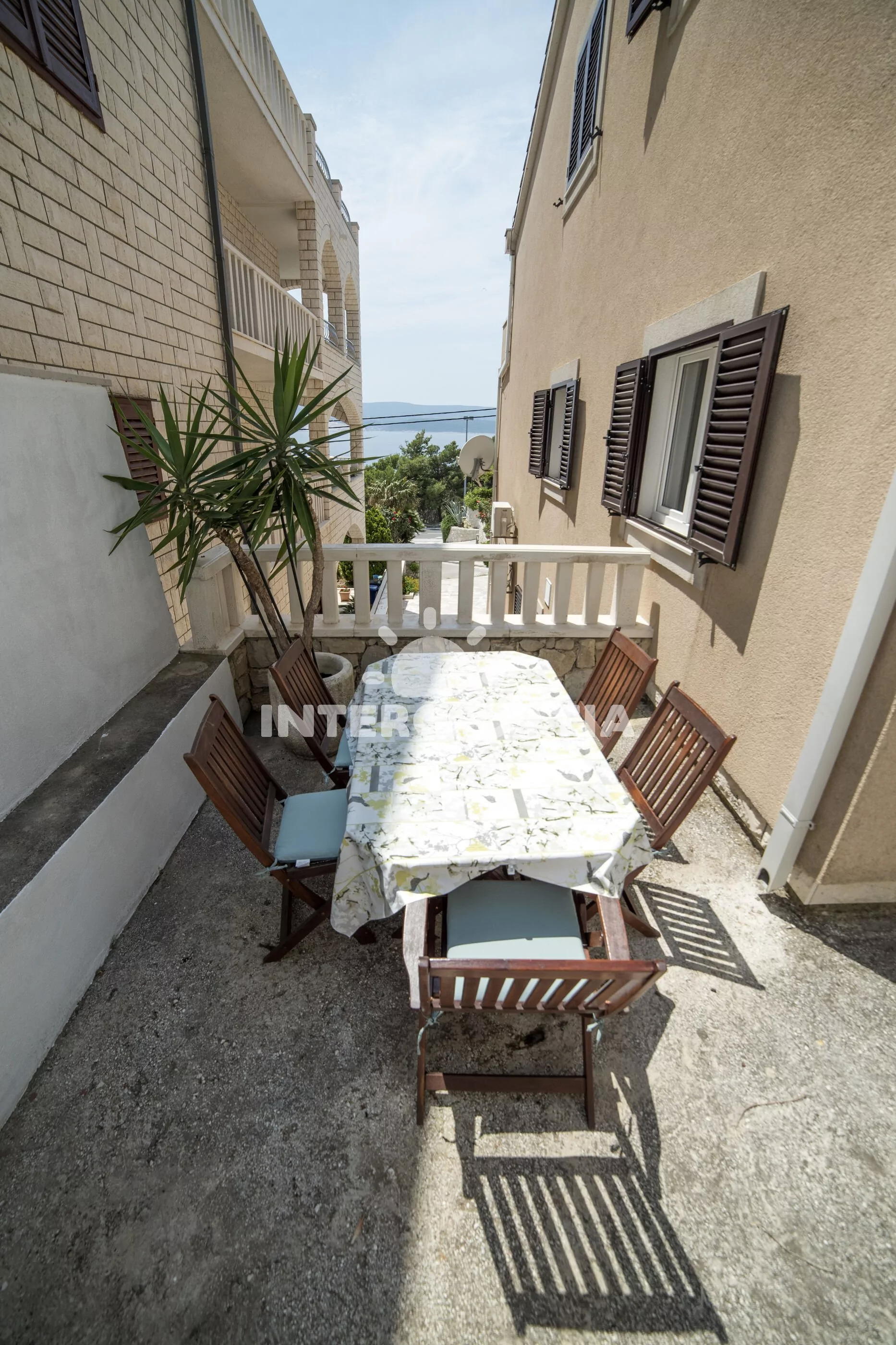Apartmán (50 m2) s terasou, balkonem, posezením a výhledem na moře se nachází v 1. patře domu. Apartmán má 2 ložnice a je vhodný pro až 4 osoby. Obývací místnost je spojena s kuchyní. Kuchyňská linka je vybavena varnou deskou, digestoří, troubou, rychlovarnou konvicí, nádobím a lednicí s mrazákem. Obývací místnost s jídelním stolem, televizí se satelitním programem a klimatizací. První i druhá ložnice je vybavena vždy s jedním dvoulůžkem. Koupelna se sprchovým koutem, umyvadlem, fénem a wc. Hostům je k dispozici parkování u objektu zdarma.