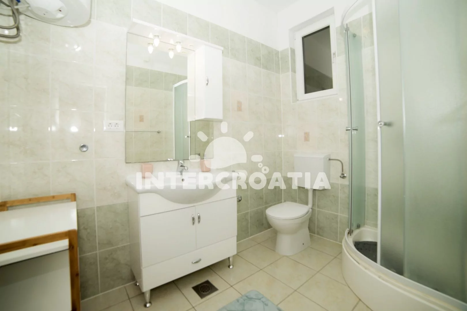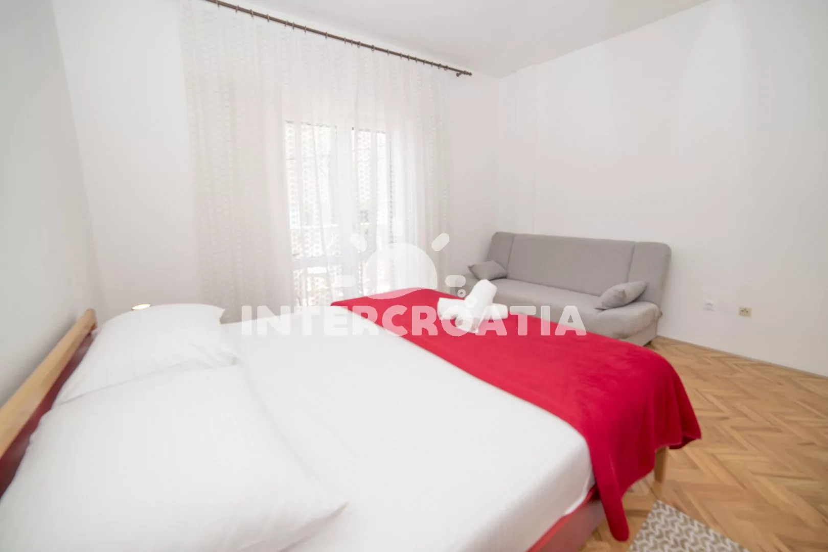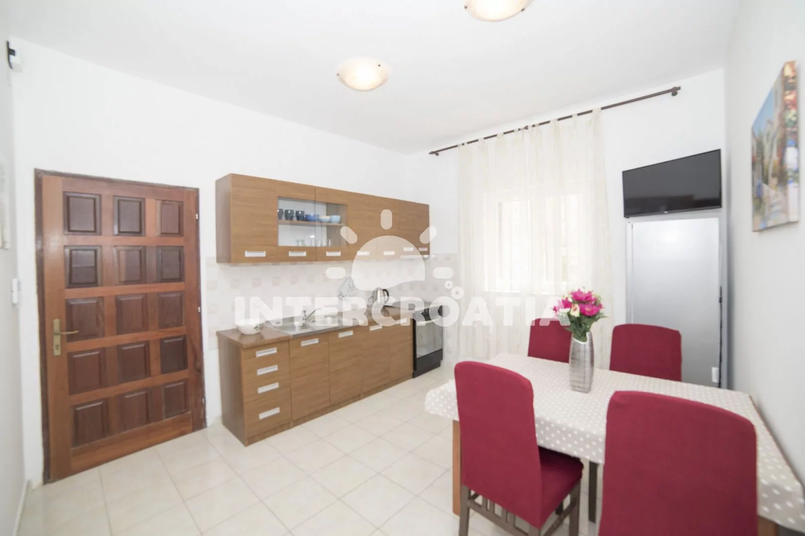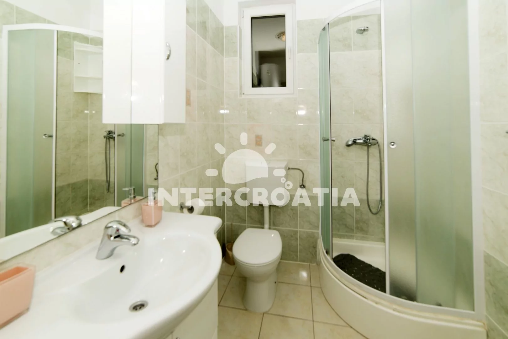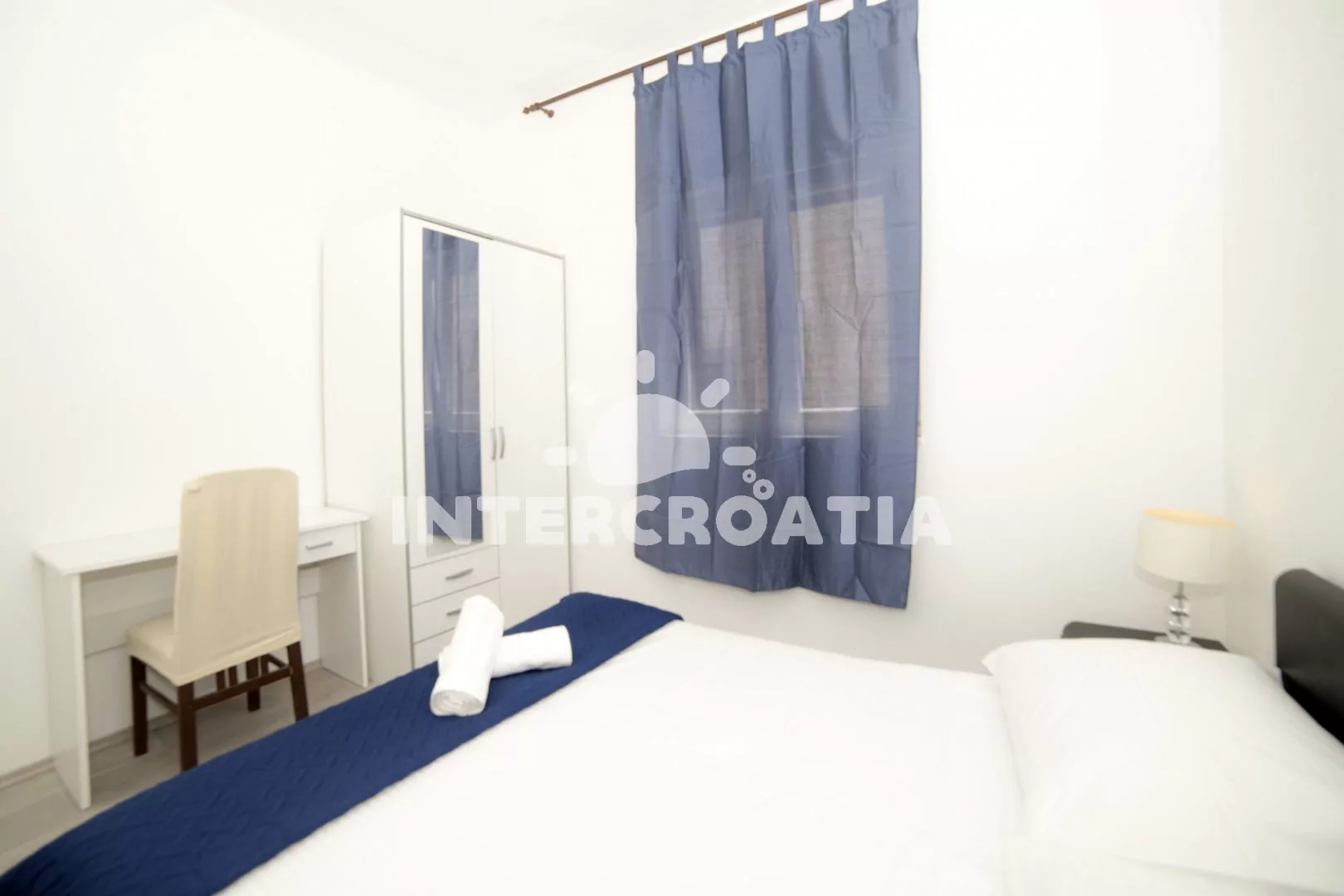 Apartmán (50 m2) s terasou, balkonem, posezením a výhledem na moře se nachází v 1. patře domu. Apartmán má 2 ložnice a je vhodný pro až 4 osoby. Obývací místnost je spojena s kuchyní. Kuchyňská linka je vybavena varnou deskou, digestoří, troubou, rychlovarnou konvicí, nádobím a lednicí s mrazákem. Obývací místnost s jídelním stolem, televizí se satelitním programem a klimatizací. První i druhá ložnice je vybavena vždy s jedním dvoulůžkem. Koupelna se sprchovým koutem, umyvadlem, fénem a wc. Hostům je k dispozici parkování u objektu zdarma.