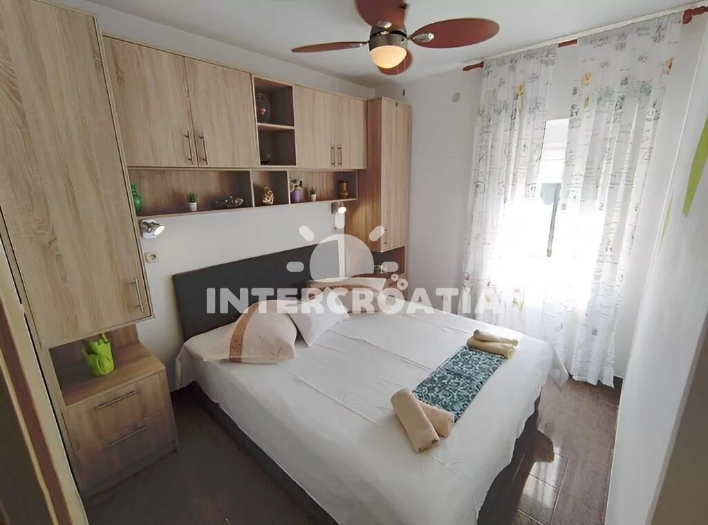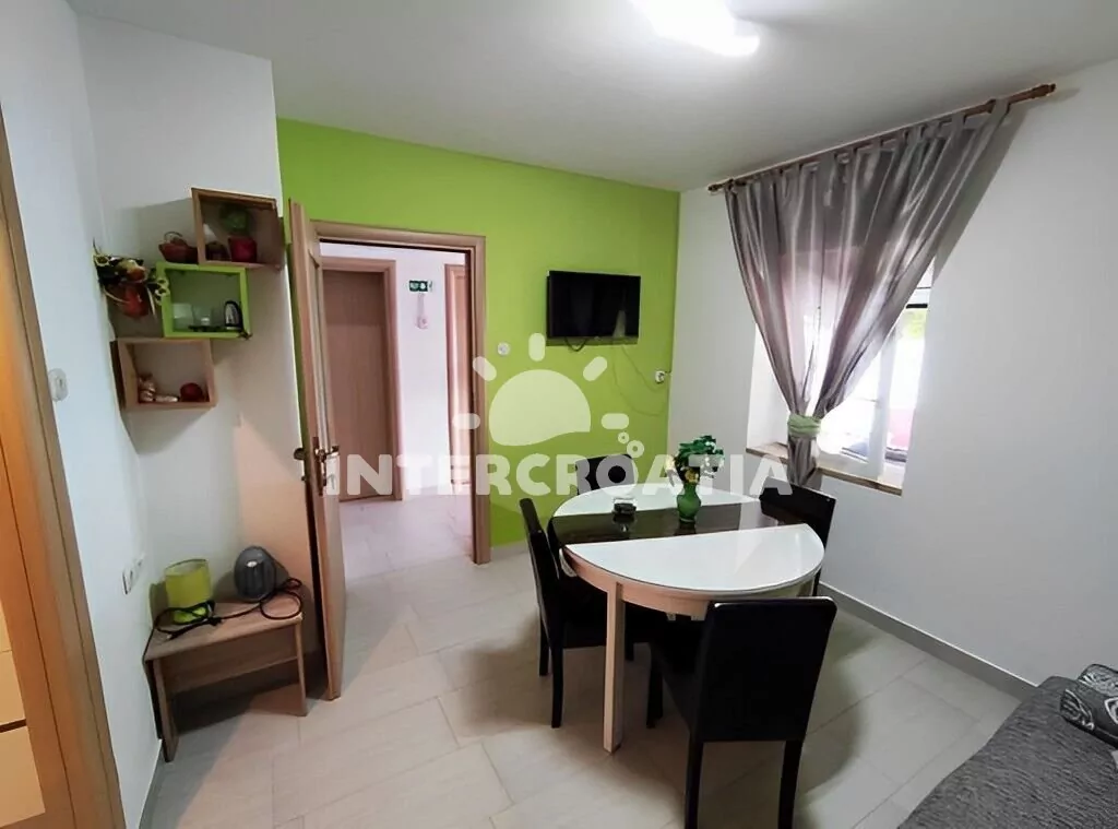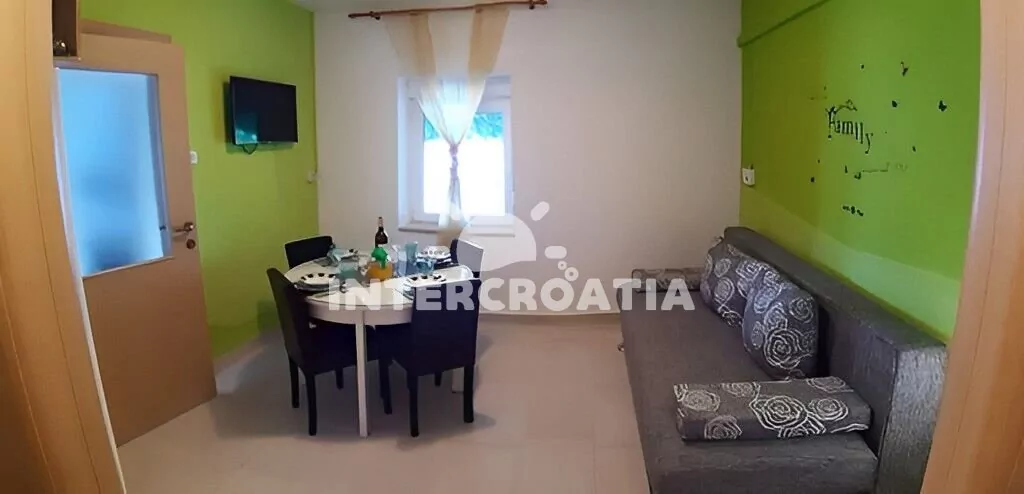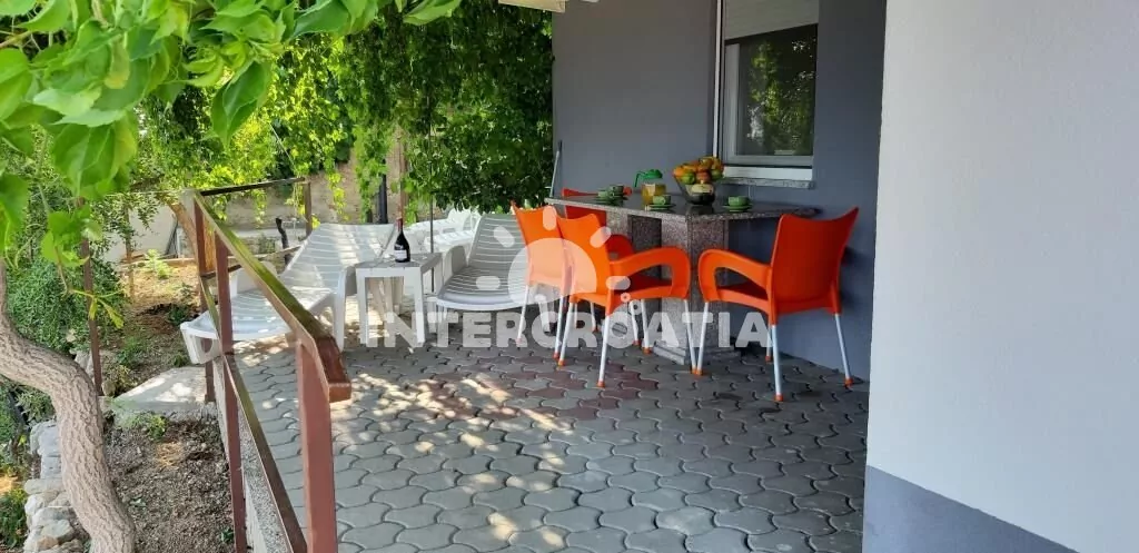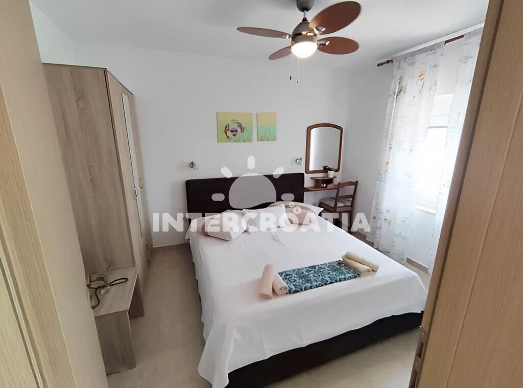 Apartmán (45 m2) s terasou, posezením a výhledem na moře se nachází v přízemí vily. Apartmán má 2 ložnice a je vhodný pro až 4 osoby. Obývací pokoj je spojený s kuchyní. Kuchyňská linka je vybavena varnou deskou, digestoří, vestavěnou troubou, myčkou na nádobí, rychlovarnou konvicí, mikrovlnnou troubou, kávovarem, toustovačem, nádobím a lednicí s mrazákem. Obývací pokoj s jídelním stolem, pohovkou, televizí, klimatizací a vstupem na terasu. První i druhá ložnice je vybavena dvoulůžkem a klimatizací. Koupelna se sprchovým koutem, umyvadlem, pračkou, žehličkou, fénem a wc. Hostům je k dispozici parkování u objektu zdarma.