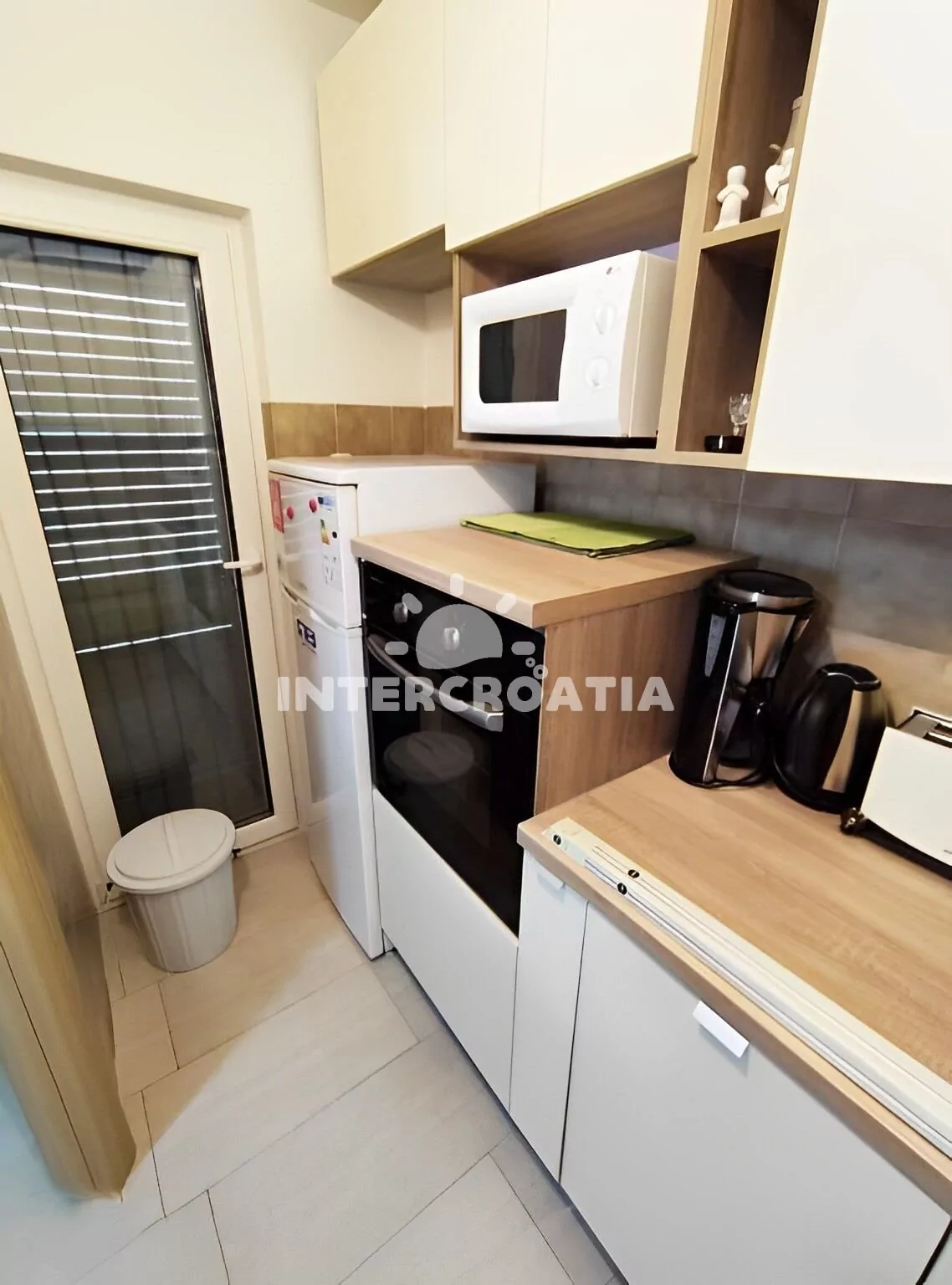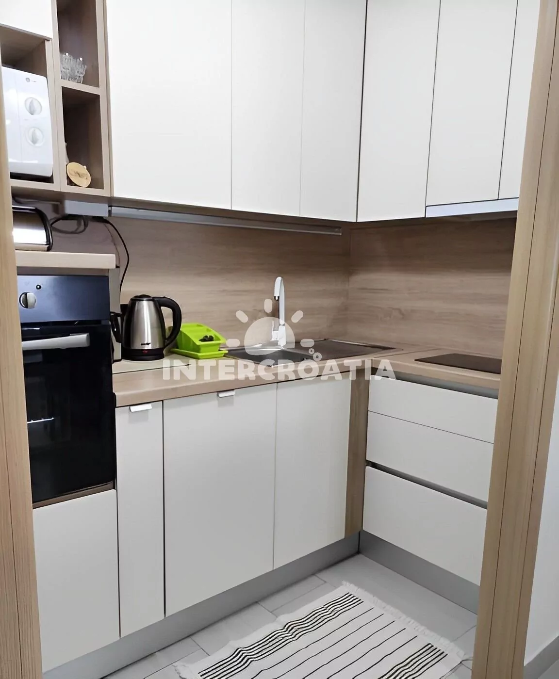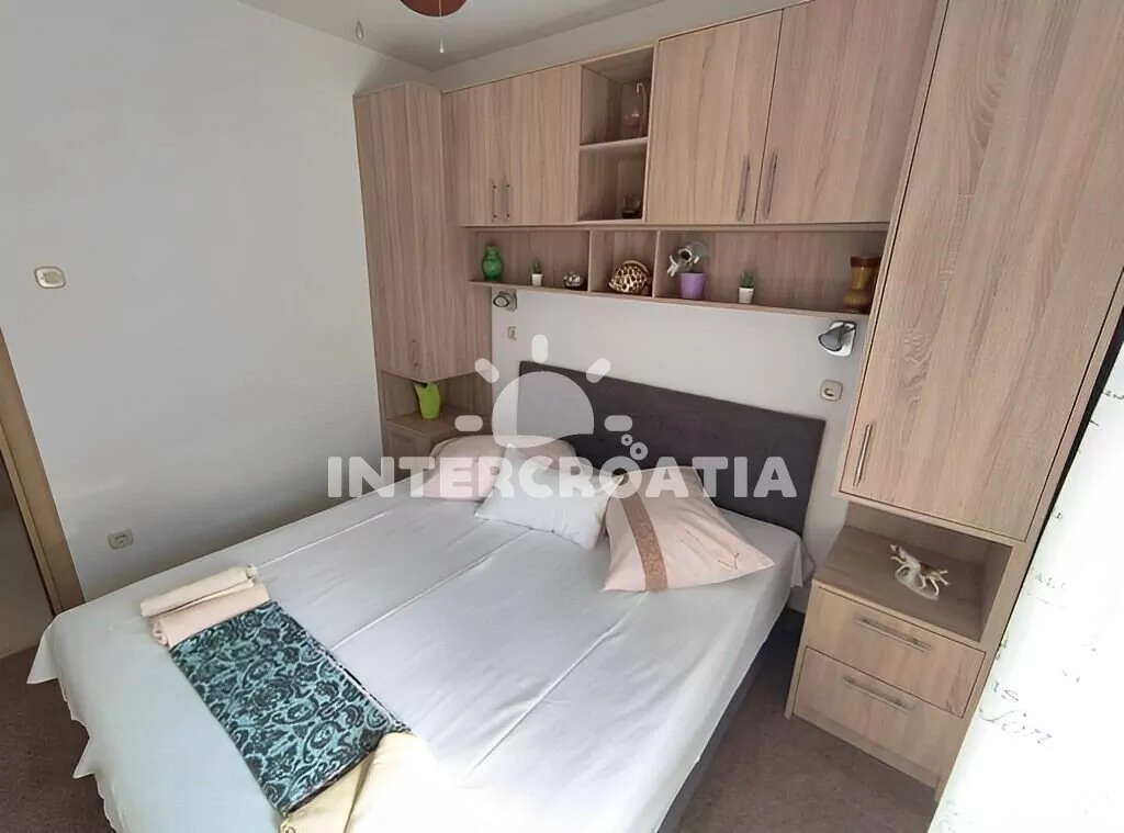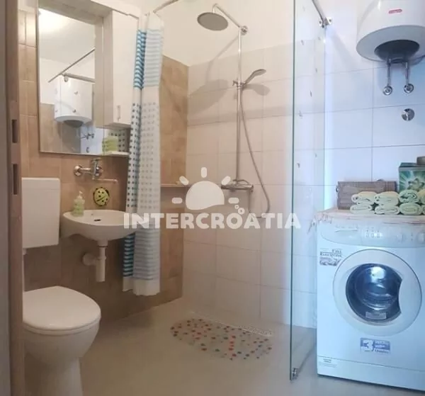Apartmán (45 m2) s terasou, posezením a výhledem na moře se nachází v přízemí vily. Apartmán má 2 ložnice a je vhodný pro až 4 osoby. Obývací pokoj je spojený s kuchyní. Kuchyňská linka je vybavena varnou deskou, digestoří, vestavěnou troubou, myčkou na nádobí, rychlovarnou konvicí, mikrovlnnou troubou, kávovarem, toustovačem, nádobím a lednicí s mrazákem. Obývací pokoj s jídelním stolem, pohovkou, televizí, klimatizací a vstupem na terasu. První i druhá ložnice je vybavena dvoulůžkem a klimatizací. Koupelna se sprchovým koutem, umyvadlem, pračkou, žehličkou, fénem a wc. Hostům je k dispozici parkování u objektu zdarma.