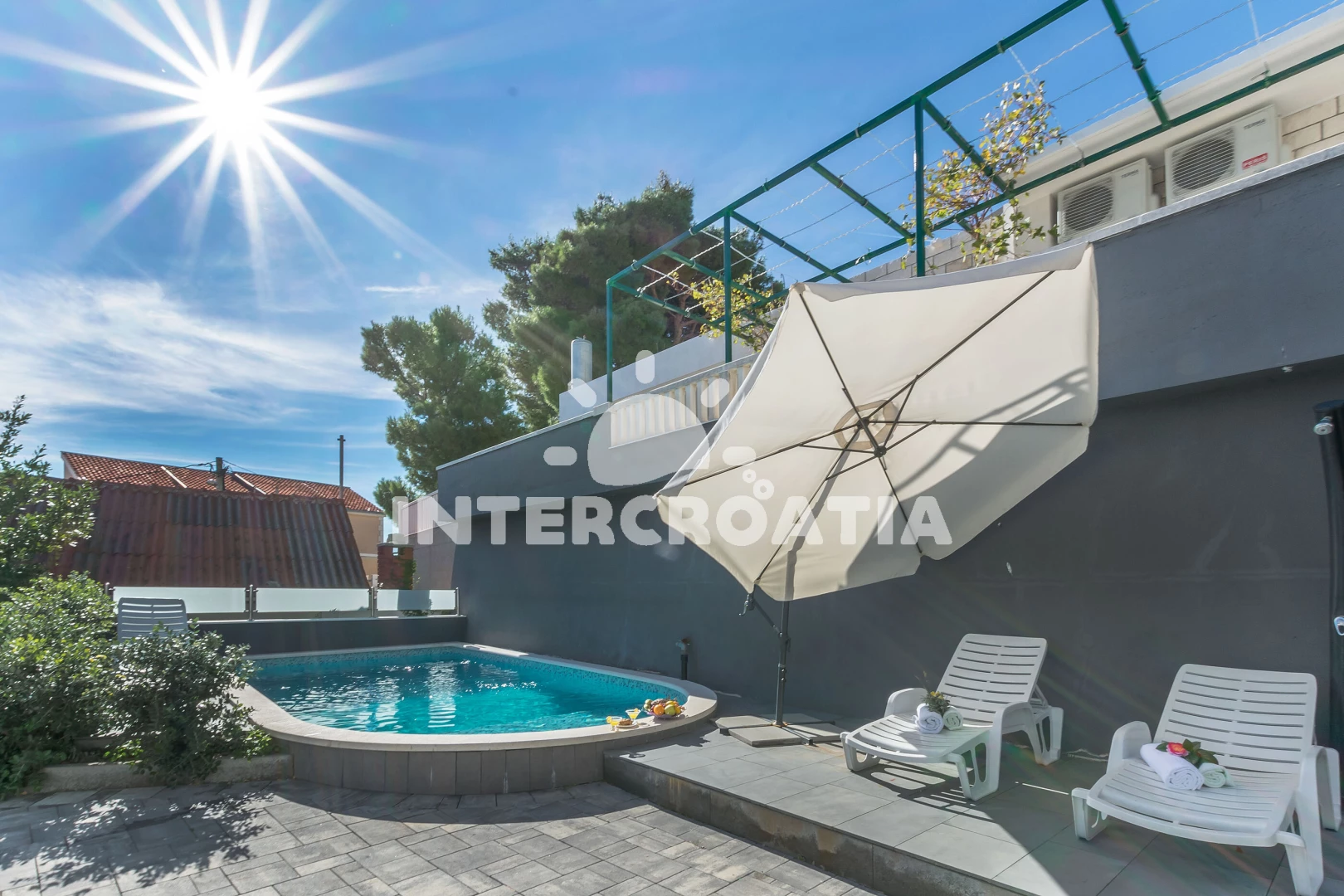 Vzdálenosti: Moře 120 m, pláž 140 m (oblázky), bar 500 m, půjčovna motorových člunů 500 m, veřejná doprava 600 m, restaurace 600 m, supermarket 600 m, centrum 600 m, čerpací stanice 7 km, směnárna 7 km, ambulance 7 km, marina 7 km, tenisové kurty 7 km, půjčovna kol 7 km, banka 7 km, potápění 7 km, pošta 7 km, lékárna 7 km, muzeum 7 km, mini golf 10 km, diskotéka 20 km, trajekt (Split) 30 km, letiště (Split) 45,0 km,