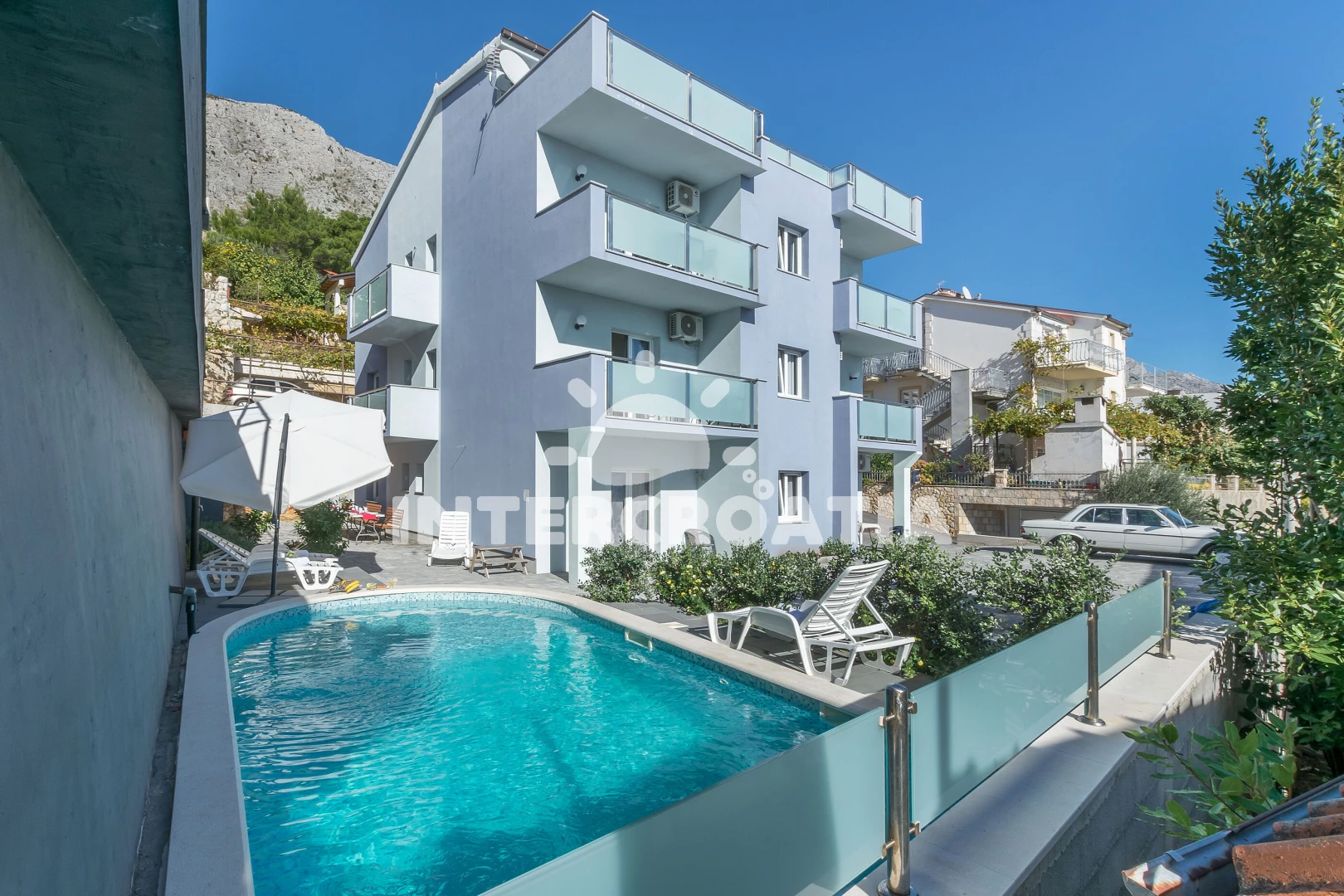 Apartmán se nachází 140 m od moře a pláže. Pláž je oblázková. Apartmán disponuje bazénem s lehátky pro ubytované hosty. U objektu je k dispozici společná zahrada s posezením a grilem. Parkování je před domem.