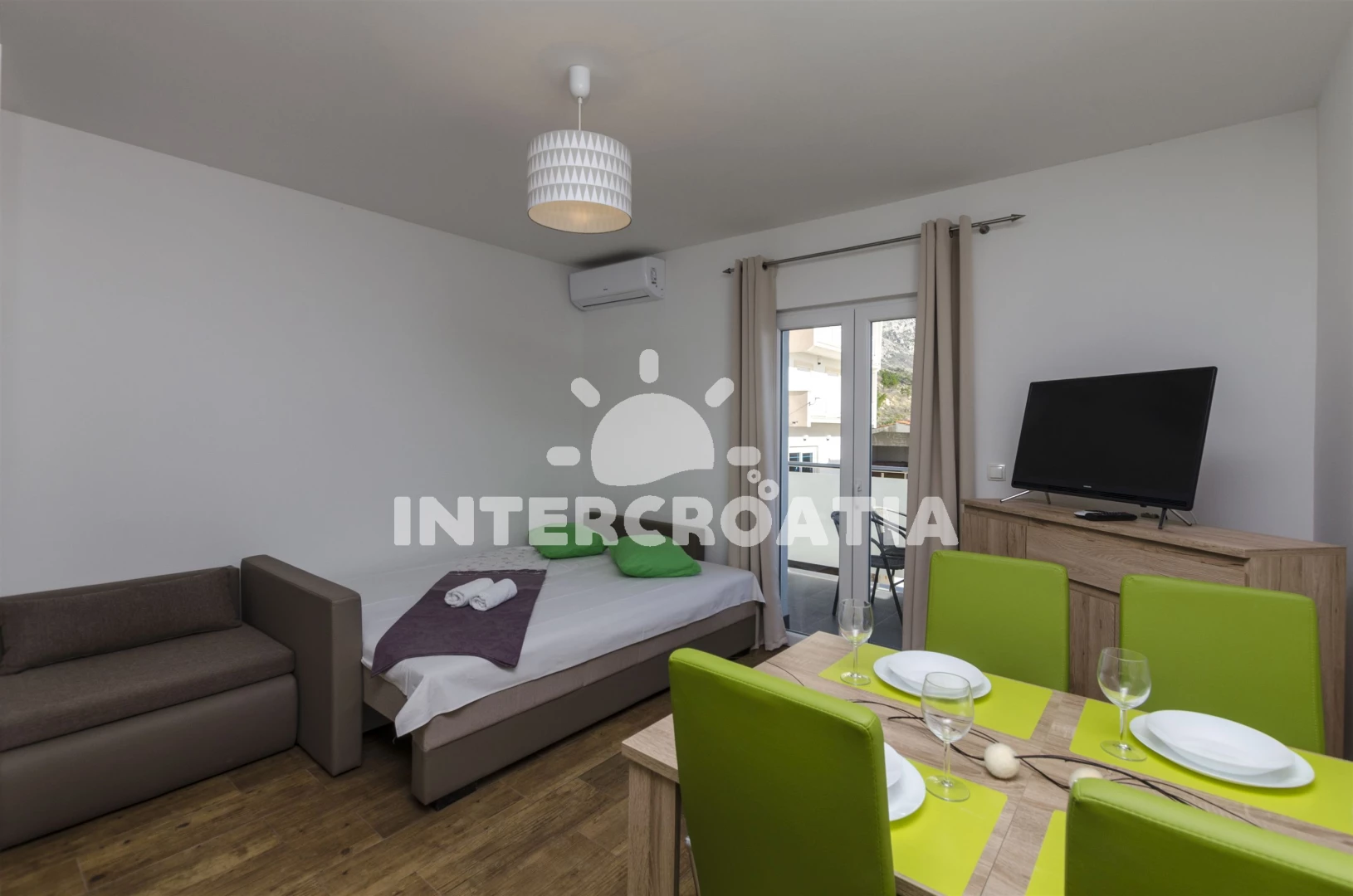 Apartmán (30 m2) typu studio s balkonem, a výhledem na moře. Nachází se ve 2. patře objektu. Kuchyňská linka je vybavena varnou deskou, troubou, rychlovarnou konvicí, nádobím, lednicí, mrazákem. K dispozici dvoulůžko, televize, žehlička. Koupelna se sprchovým koutem, umyvadlem, fénem a WC.