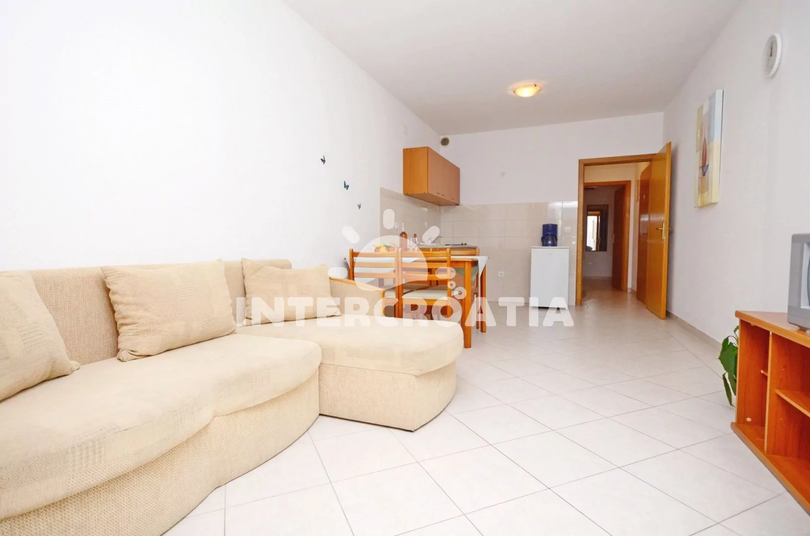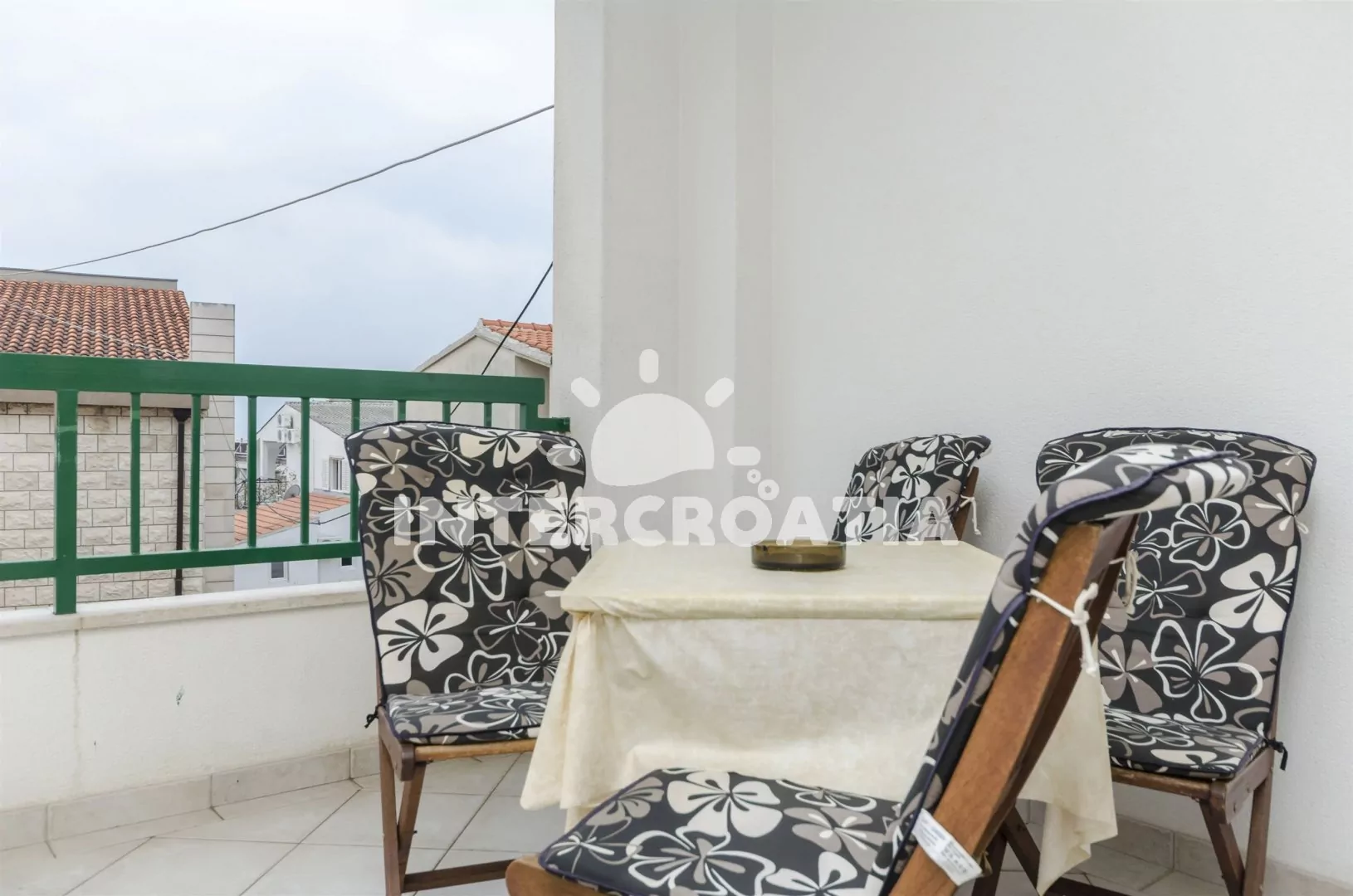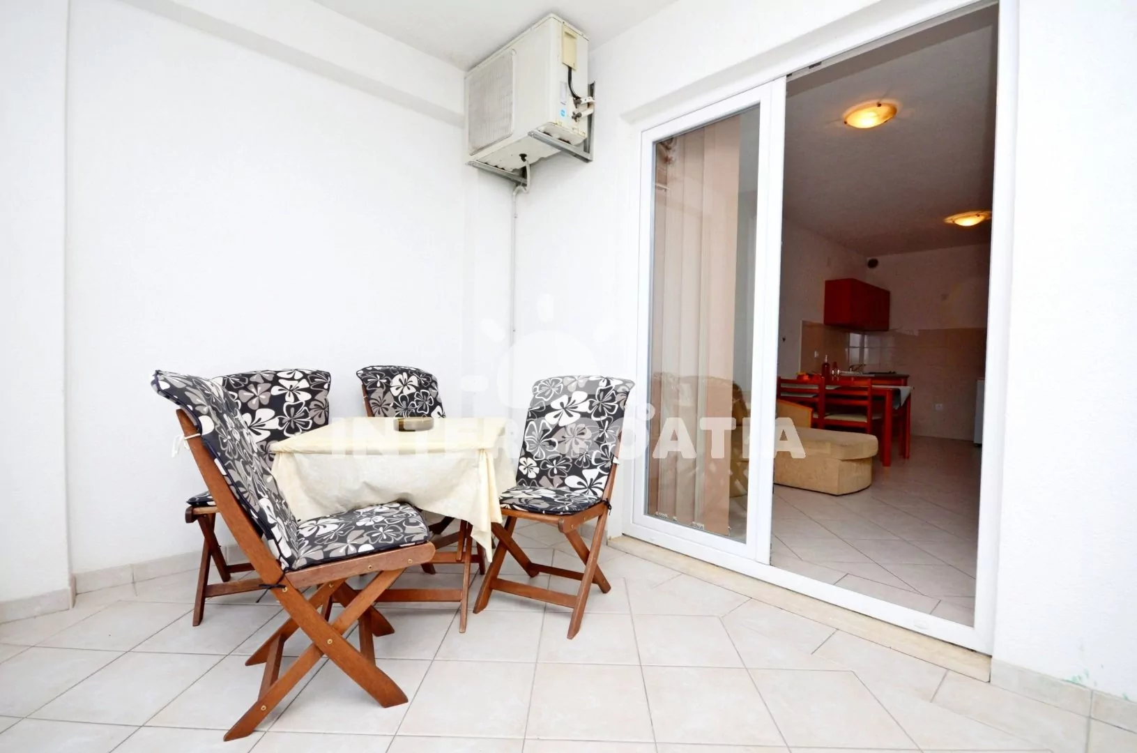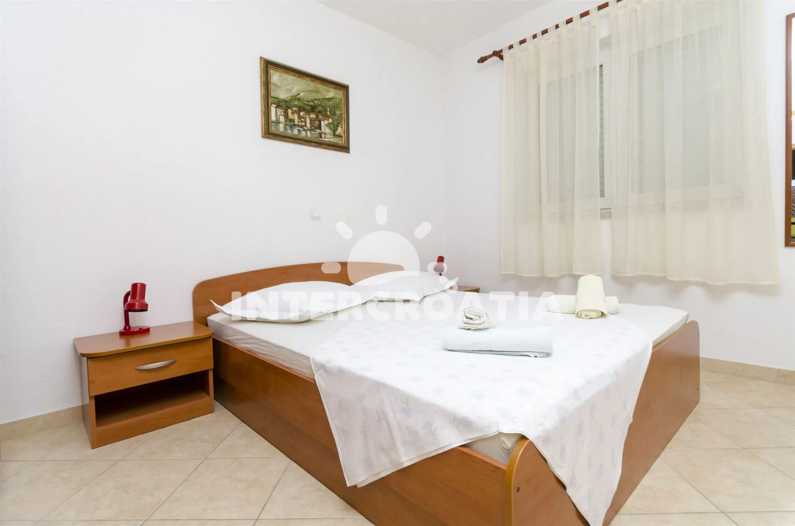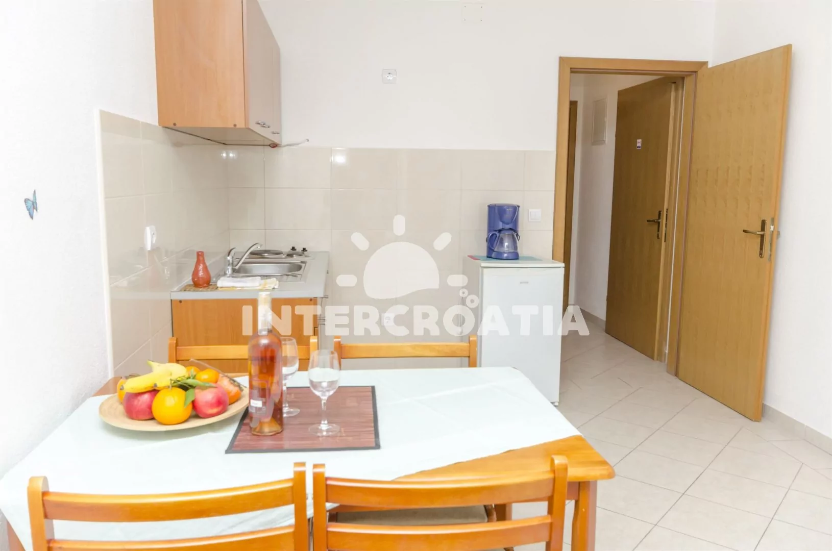 Apartmán pro 2 až 4 osoby se nachází v druhém patře domu. Kuchyň je spojena s obývacím pokojem. Kuchyňský kout je vybaven nádobím, elektrickým dvouplotýnkovým sporákem, kávovarem a lednicí s mrazákem. Obývací část s jídelním stolem, rozkládací pohovkou (extra lůžko pro 2 osoby), televizí se satelitním programem a vstupem na terasu. Ložnice s jedním manželským dvoulůžkem. Koupelna se sprchovým koutem, umyvadlem a wc. K dispozici: WiFi, klimatizace, dětská postýlka, fén, žehlička a terasa s posezením.