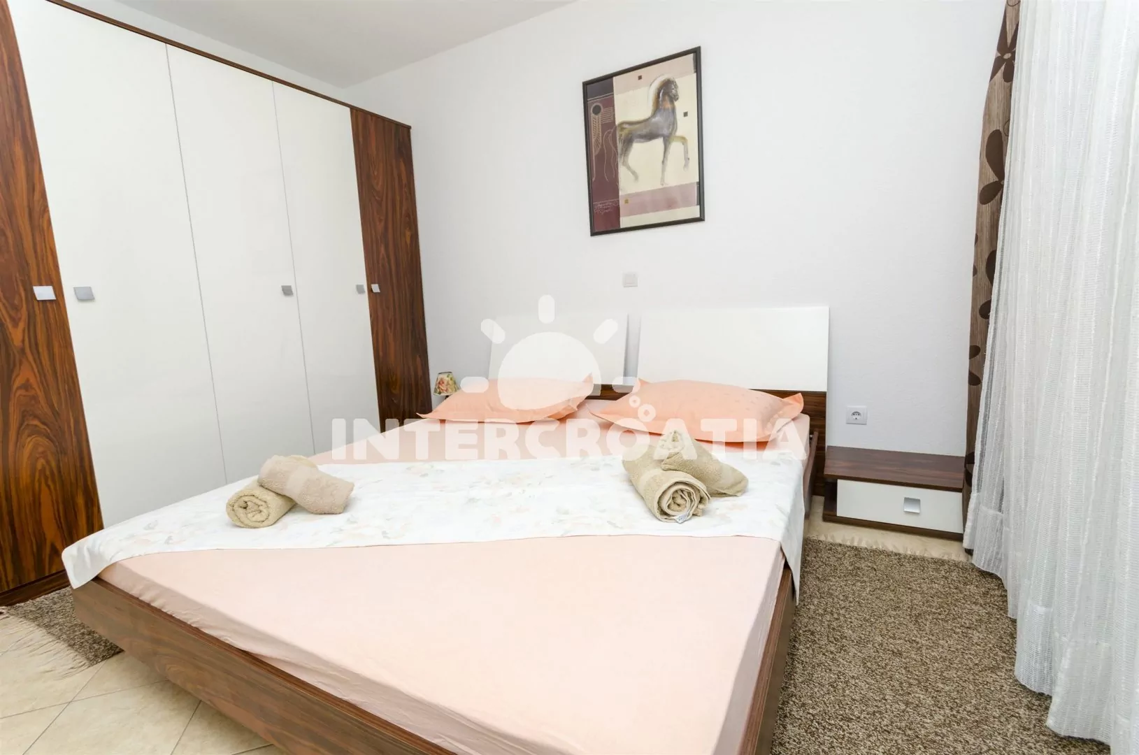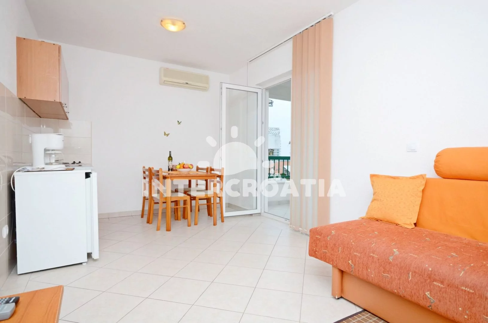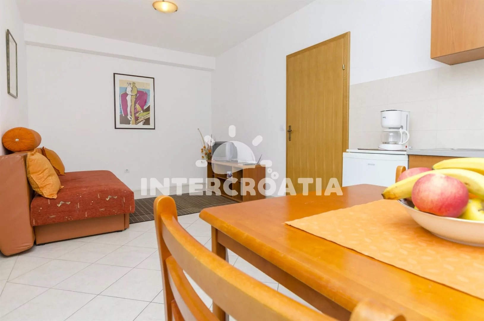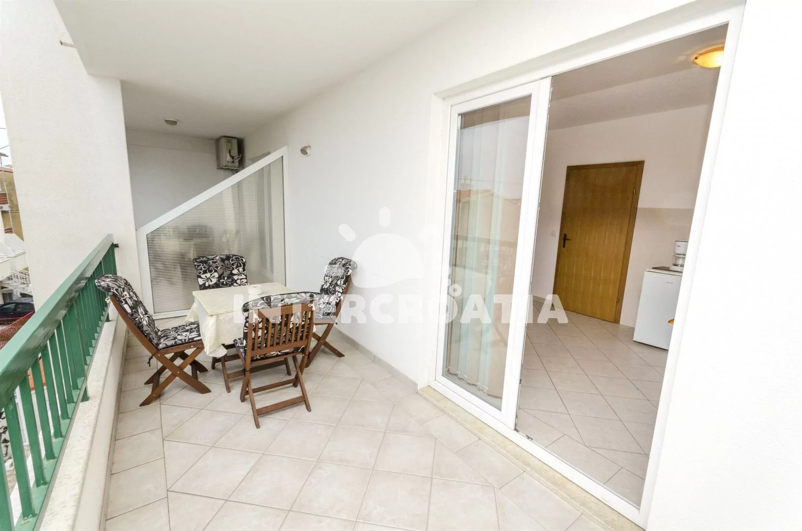 Apartmán pro 2 až 4 osoby s výhledem na moře a francouzskými okny, se nachází v druhém patře domu. Kuchyň je spojena s obývacím pokojem. Kuchyňský kout je vybaven nádobím, elektrickým dvouplotýnkovým sporákem, kávovarem a lednicí s mrazákem. Obývací část s jídelním stolem, rozkládací pohovkou (extra lůžko pro 2 osoby), televizí se satelitním programem a vstupem na terasu. Ložnice s jedním manželským dvoulůžkem. Koupelna se sprchovým koutem, umyvadlem a wc. K dispozici: WiFi, klimatizace, dětská postýlka, fén, žehlička a terasa s posezením.