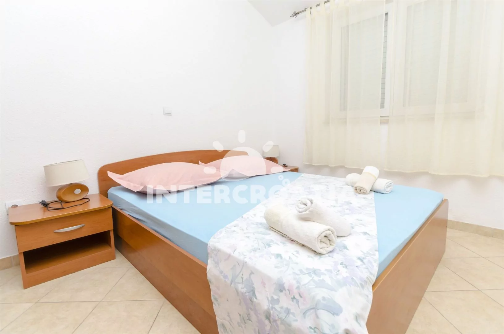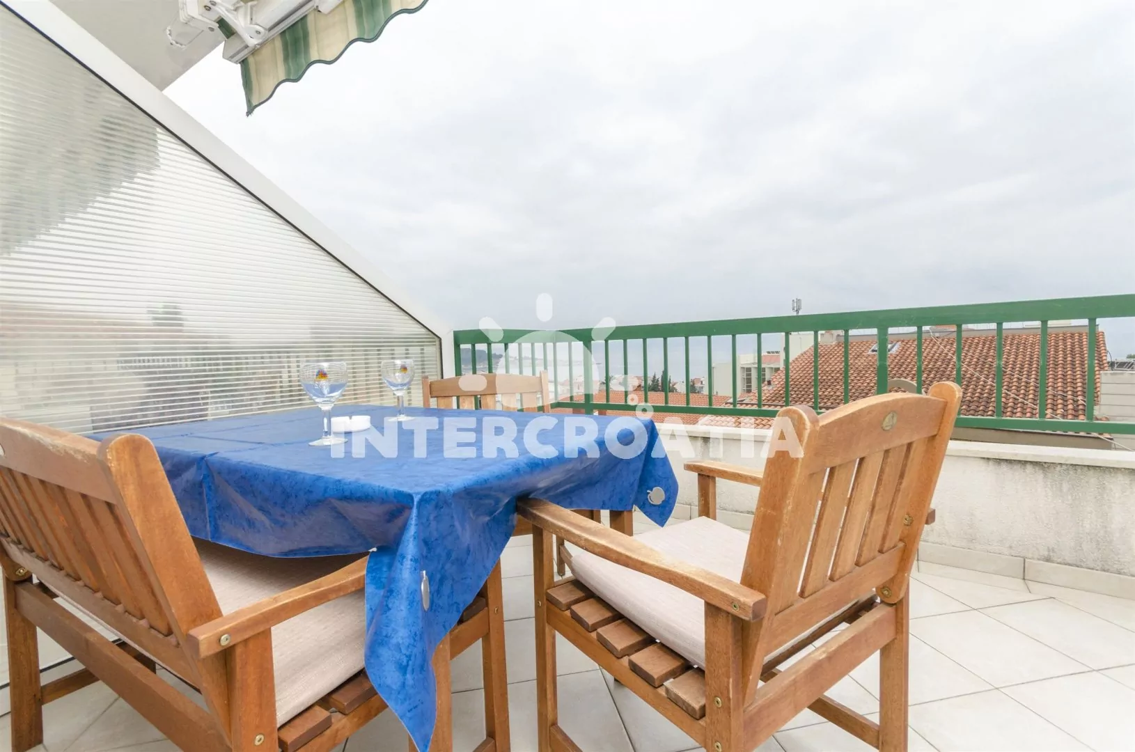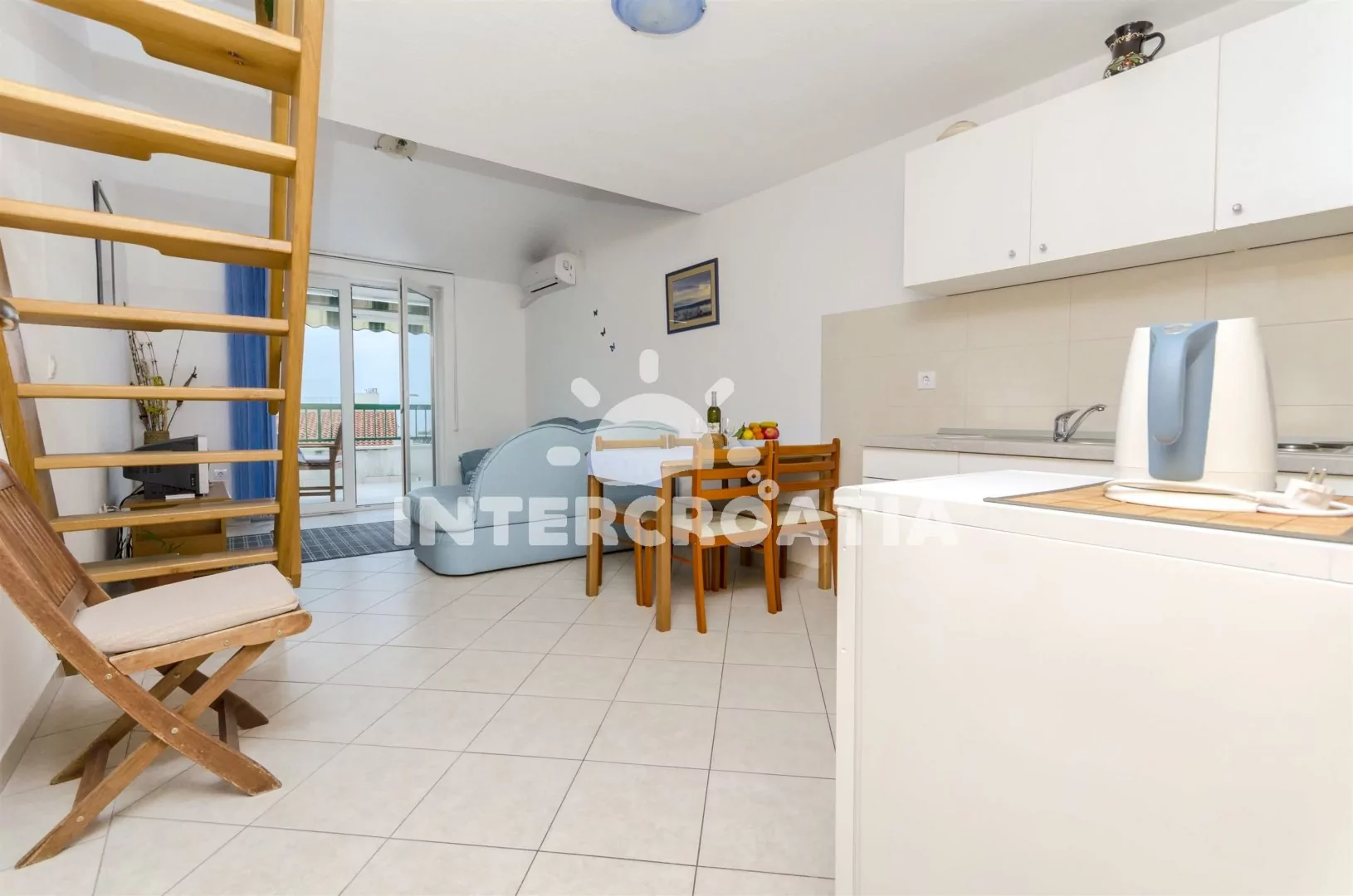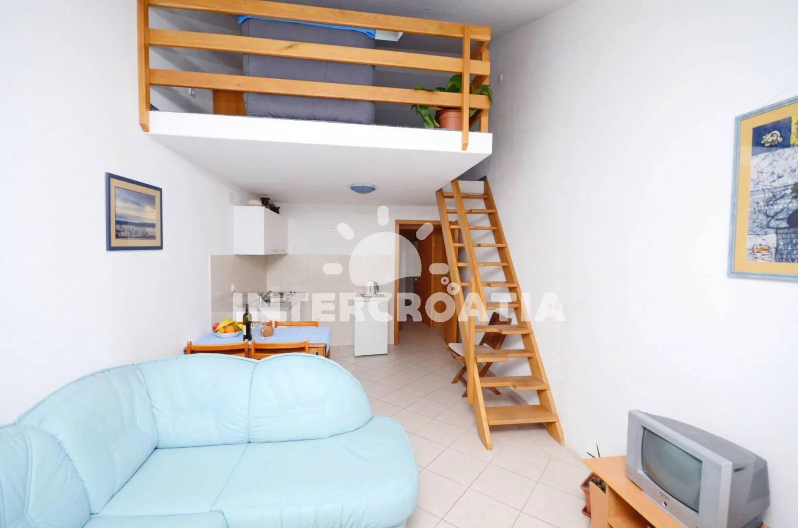 Dvoupodlažní apartmán s výhledem na moře se nachází ve třetím patře domu a je vhodný pro 4 až 5 osob. Kuchyň je spojena s obývacím pokojem. Kuchyňský kout je vybaven nádobím, elektrickým dvouplotýnkovým sporákem, kávovarem a lednicí s mrazákem. Obývací část s jídelním stolem, velkou rozkládací pohovkou (extra lůžko pro 5. osobu), televizí se satelitním programem a vstupem na terasu. První ložnice s jedním dvoulůžkem. Druhá ložnice s dvěma jednolůžky. Koupelna se sprchovým koutem, umyvadlem a wc. K dispozici: WiFi, klimatizace, dětská postýlka, fén, žehlička a terasa s posezením.