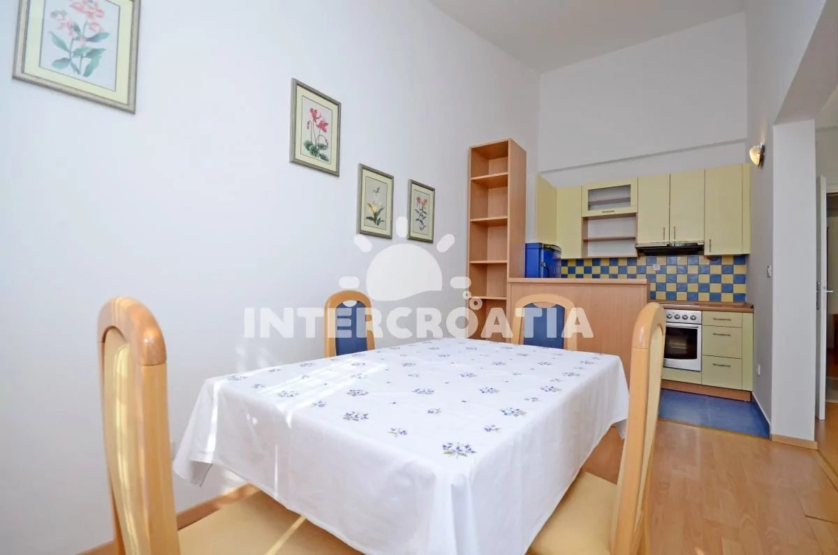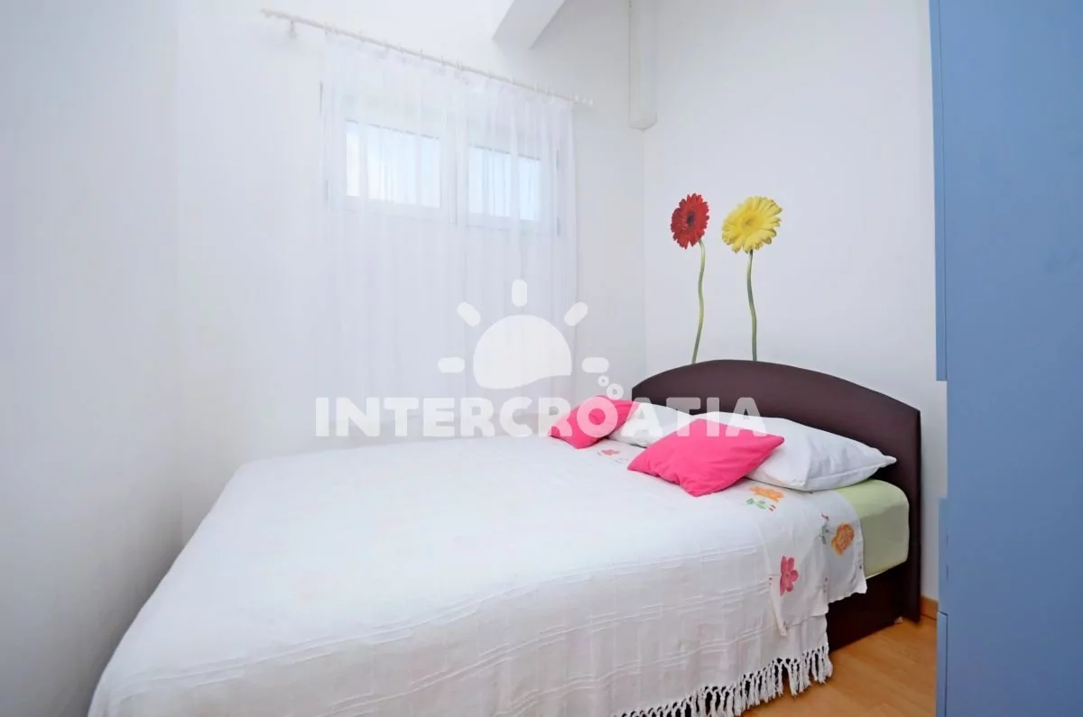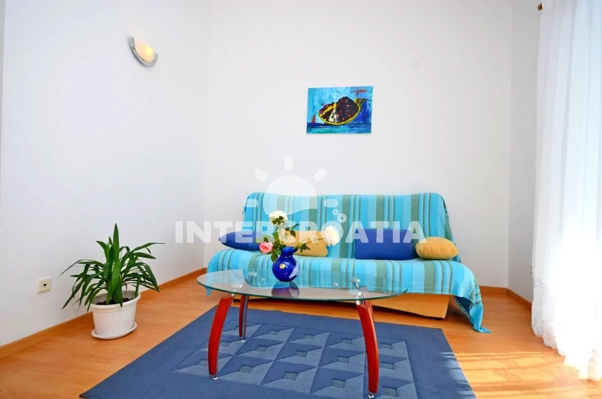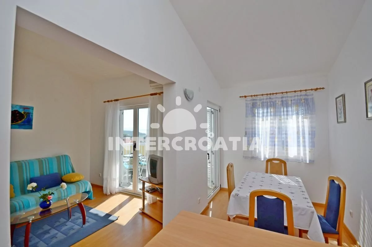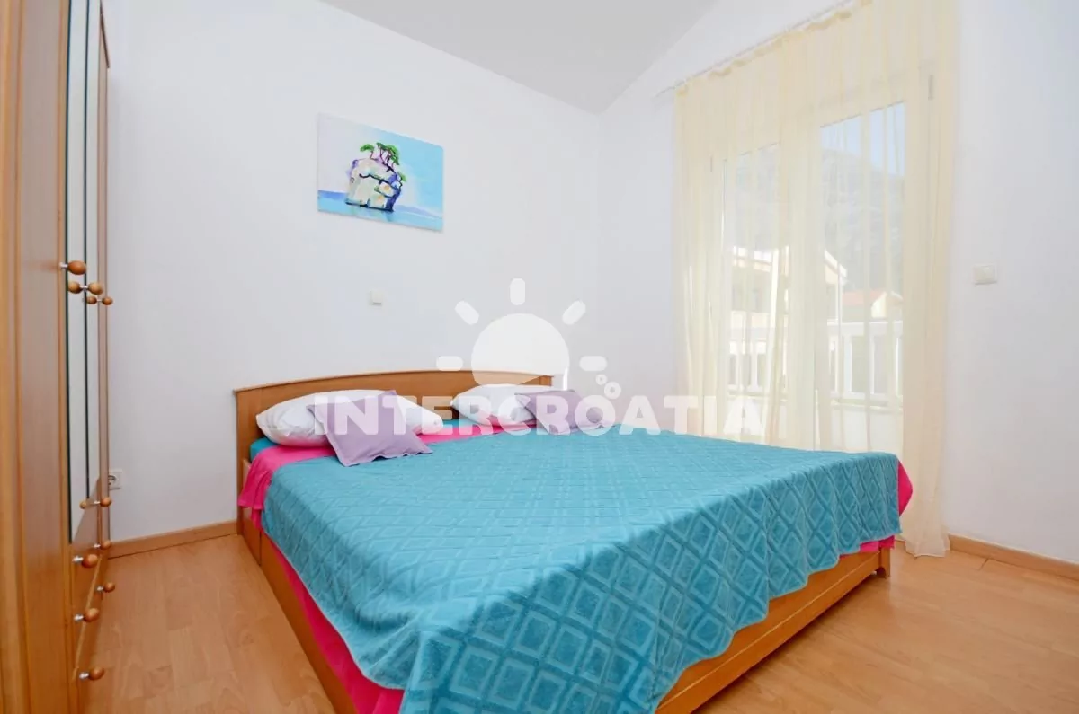 Moderně zařízený apartmán pro 4 až 6 osob s venkovním posezením a výhledem na moře. Apartmán se nachází v druhém patře domu. Vstup: Obývací pokoj částečně oddělený od kuchyně. Kuchyňská linka se sklokeramickou varnou deskou, digestoří, troubou, rychlovarnou konvicí, kávovarem, nádobím a lednicí s mrazákem. Obývací pokoj s jídelním stolem pro 4 osoby, rozložitelnou pohovkou (extra lůžko pro 2 osoby), televizí se satelitním programem, klimatizací a vstupem na balkon. První ložnice s jedním dvoulůžkem a vstupem na balkon. Druhá ložnice s jedním dvoulůžkem. Koupelna se sprchovým koutem, umyvadlem, fénem a wc. Hostům je k dispozici parkování u objektu zdarma.