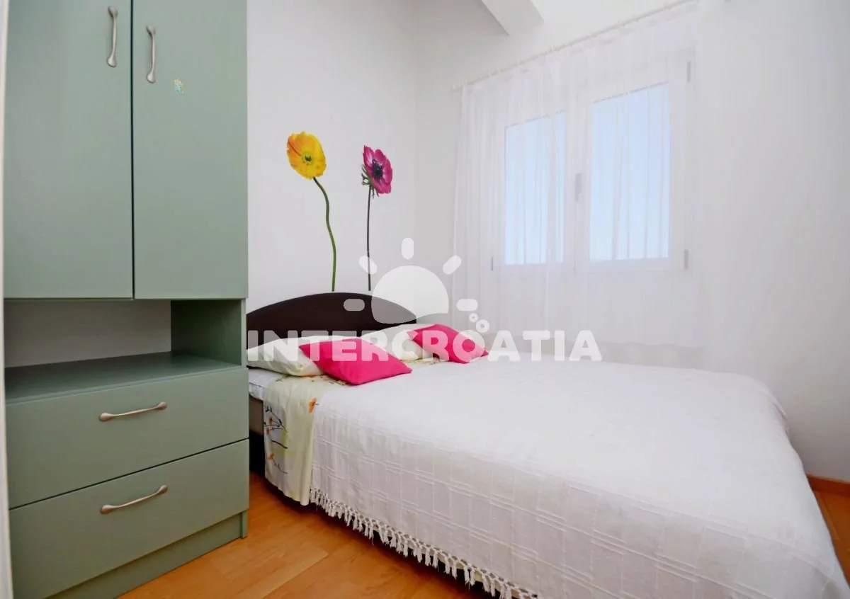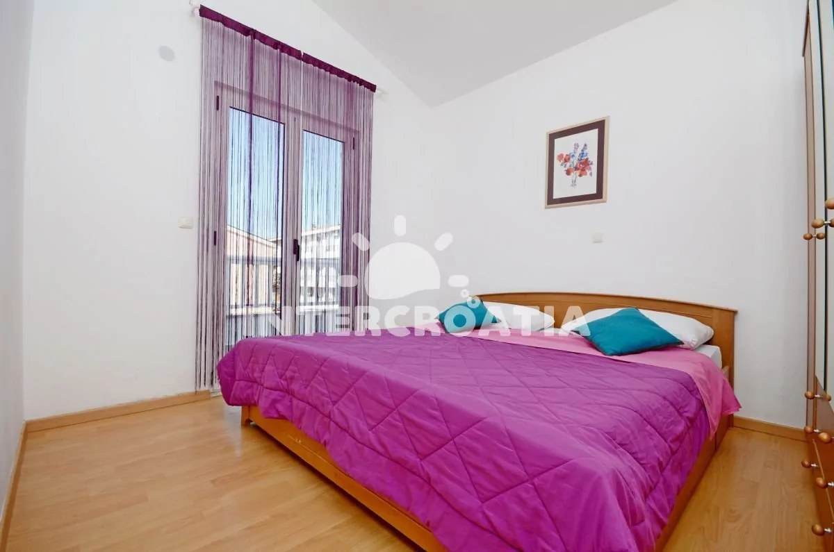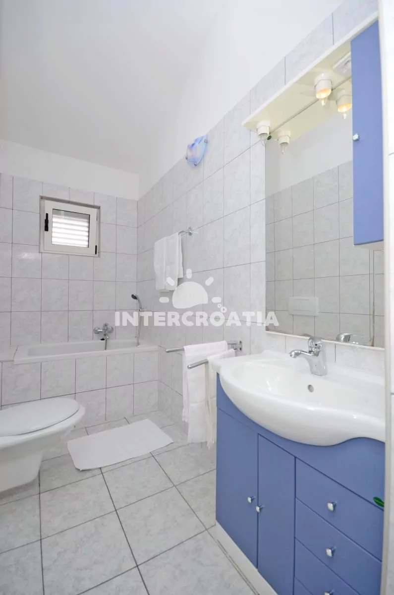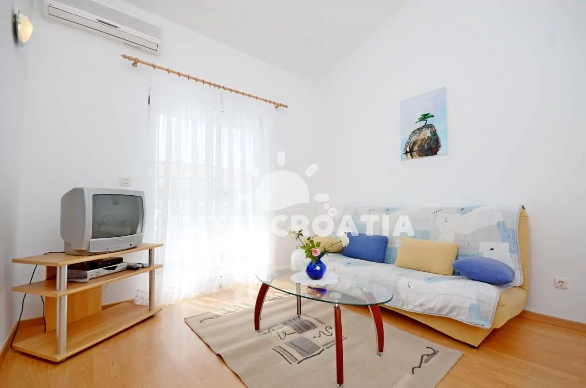 Moderně zařízený apartmán pro 4 až 6 osob s venkovním posezením a výhledem na moře. Apartmán se nachází v druhém patře domu. Vstup: Obývací pokoj částečně oddělený od kuchyně. Kuchyňská linka se sklokeramickou varnou deskou, digestoří, troubou, rychlovarnou konvicí, kávovarem, nádobím a lednicí s mrazákem. Obývací pokoj s jídelním stolem pro 4 osoby, rozložitelnou pohovkou (extra lůžko pro 2 osoby), televizí se satelitním programem, klimatizací a vstupem na balkon. První ložnice s jedním dvoulůžkem a vstupem na balkon. Druhá ložnice s jedním dvoulůžkem. Koupelna se sprchovým koutem, umyvadlem, fénem a wc. Hostům je k dispozici parkování u objektu zdarma.