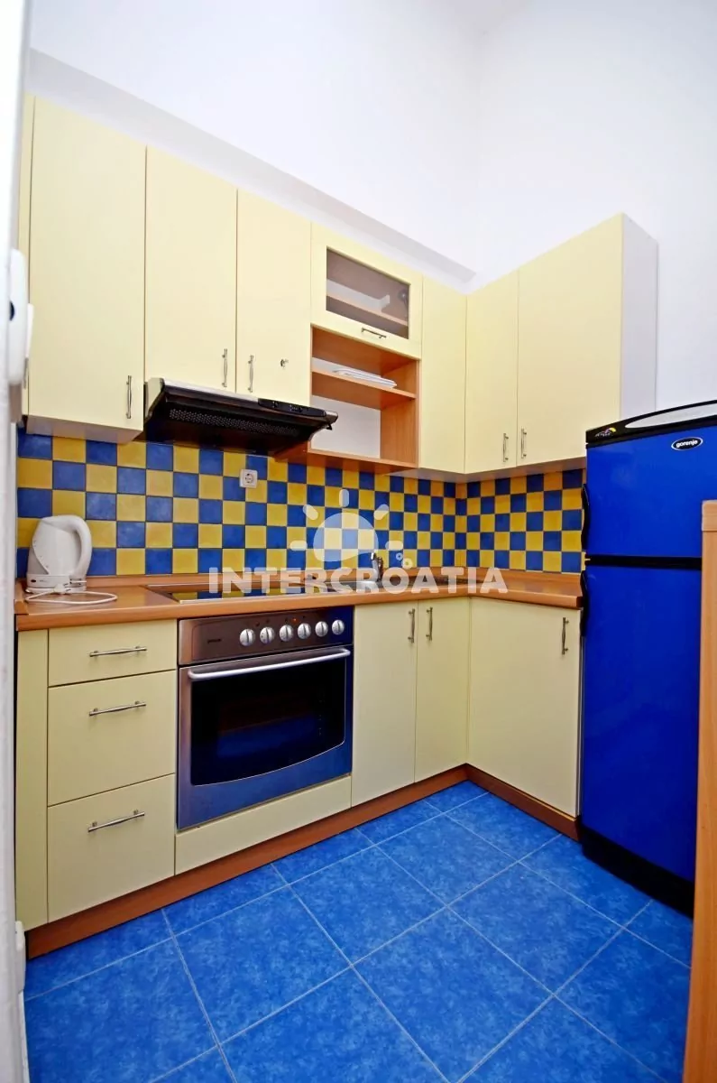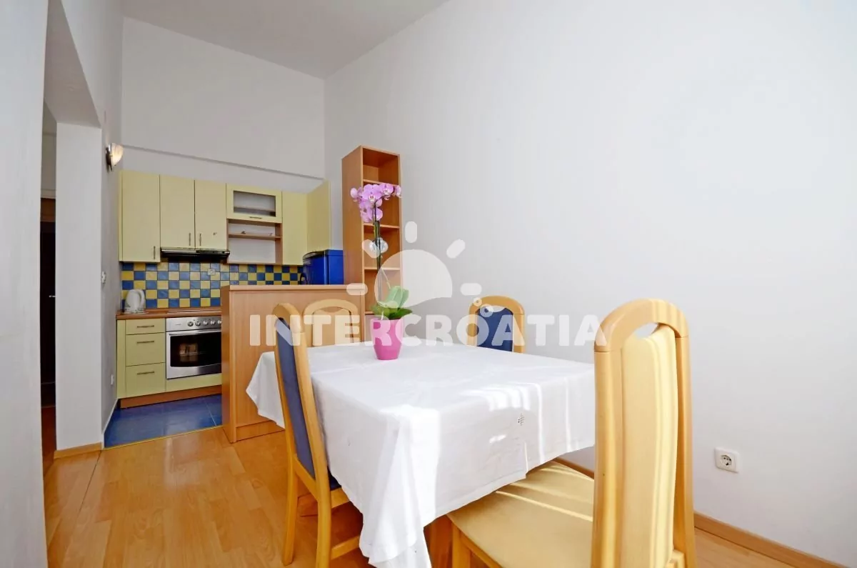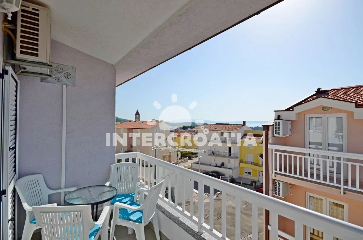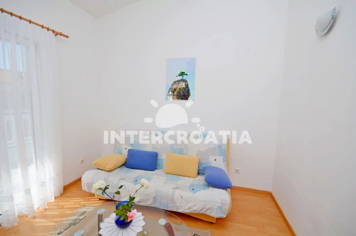 Moderně zařízený apartmán pro 4 až 6 osob s venkovním posezením a výhledem na moře. Apartmán se nachází v druhém patře domu. Vstup: Obývací pokoj částečně oddělený od kuchyně. Kuchyňská linka se sklokeramickou varnou deskou, digestoří, troubou, rychlovarnou konvicí, kávovarem, nádobím a lednicí s mrazákem. Obývací pokoj s jídelním stolem pro 4 osoby, rozložitelnou pohovkou (extra lůžko pro 2 osoby), televizí se satelitním programem, klimatizací a vstupem na balkon. První ložnice s jedním dvoulůžkem a vstupem na balkon. Druhá ložnice s jedním dvoulůžkem. Koupelna se sprchovým koutem, umyvadlem, fénem a wc. Hostům je k dispozici parkování u objektu zdarma.