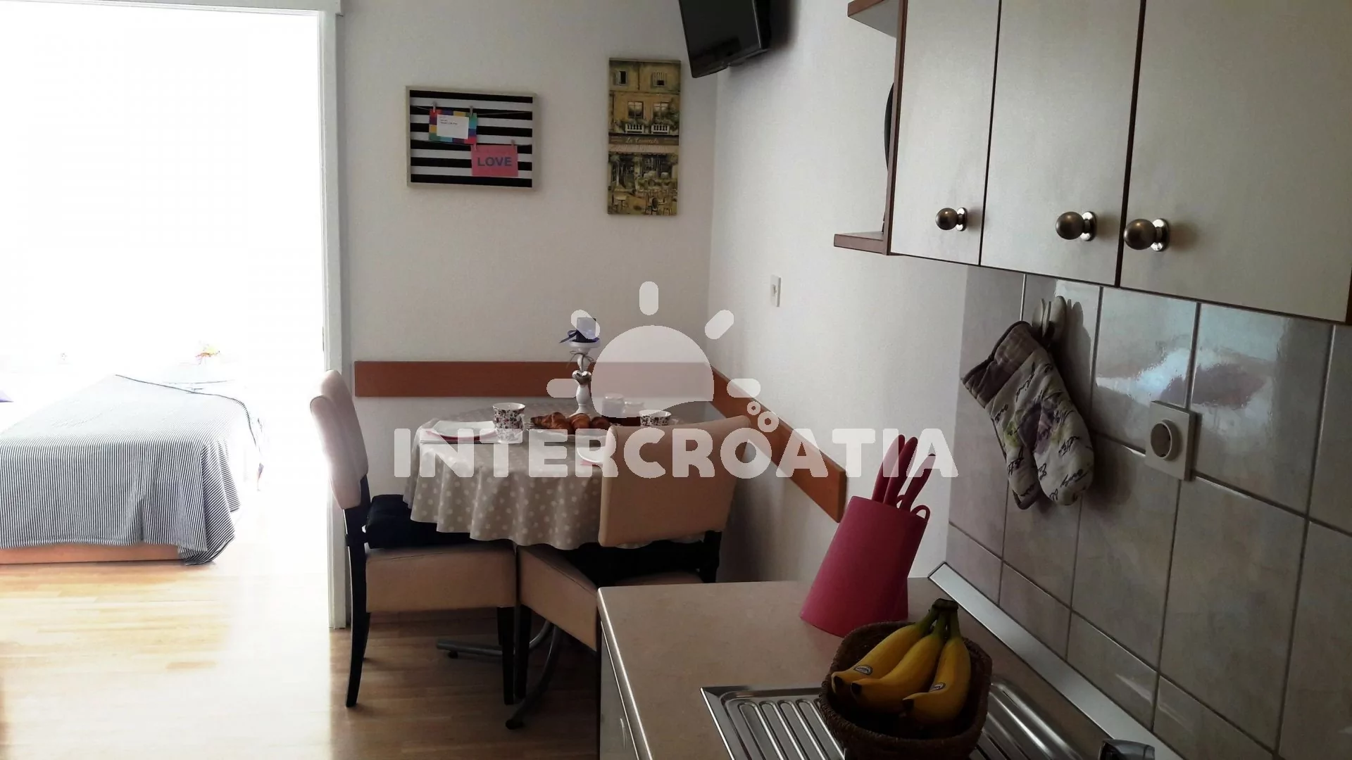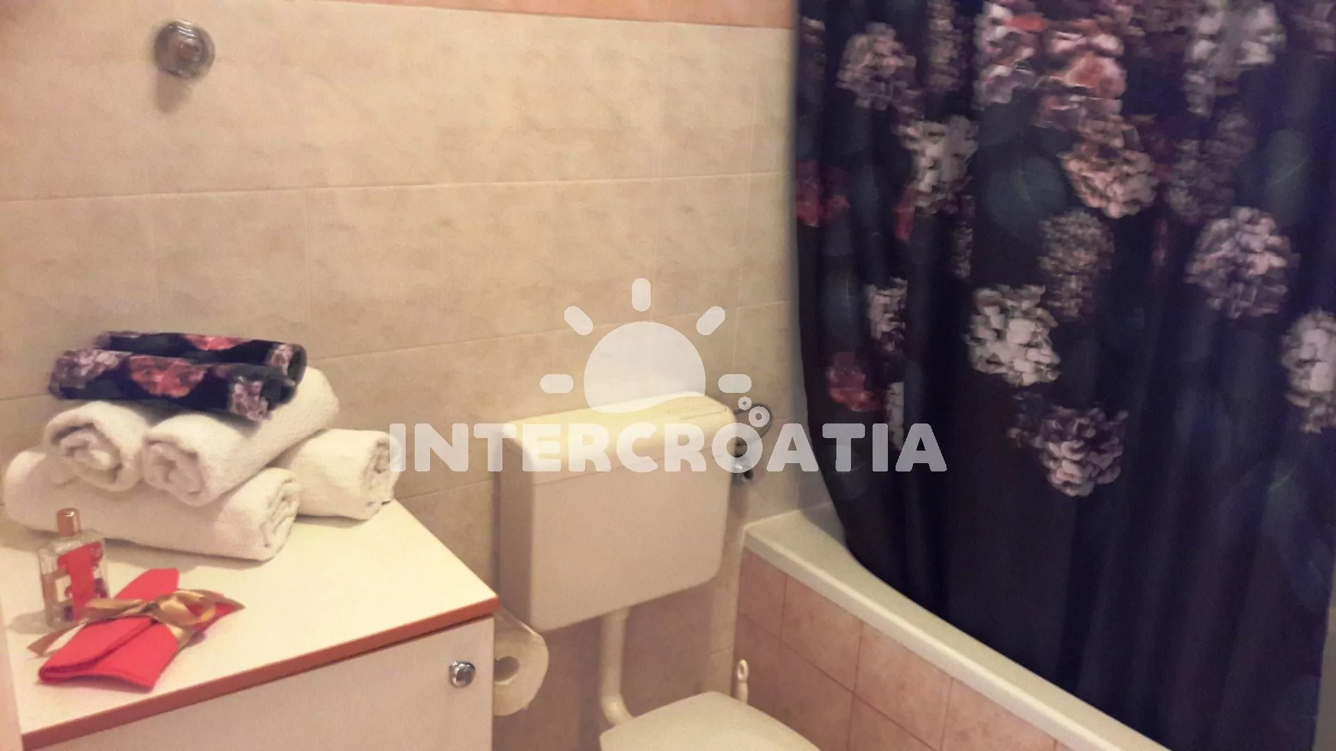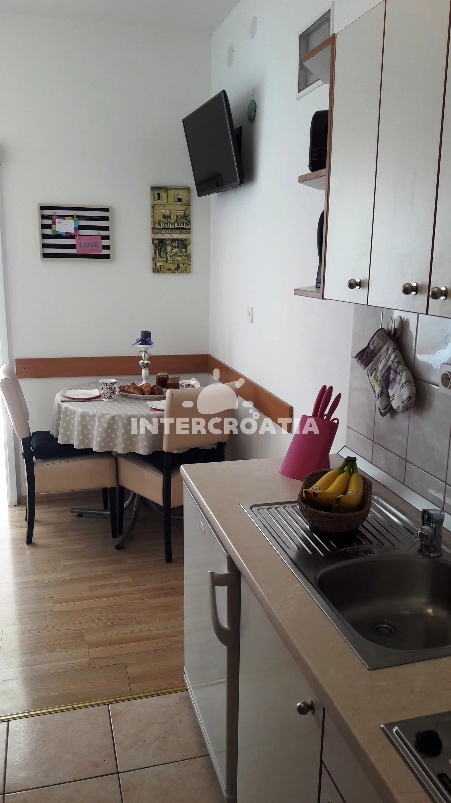 Apartmán pro 2 až 4 osoby, s bočním výhledem na moře a venkovním posezením, se nachází v druhém patře domu. Obývací místnost je spojena s kuchyní. Kuchyňská linka je vybavena elektrickým dvouplotýnkovým sporákem, rychlovarnou konvicí, kávovarem, toustovačem, nádobím a chladničkou s mrazákem. Obývací místnost s jídelním stolem, televizí se satelitním programem a dvěma přistýlkami (extra lůžka pro 2 osoby). Ložnice s jedním dvoulůžkem. Koupelna se sprchovým koutem, umyvadlem, fénem a wc. Hostům je dále k dispozici balkon s posezením, klimatizace, WiFi, žehlička, radio a parkování u objektu zdarma.