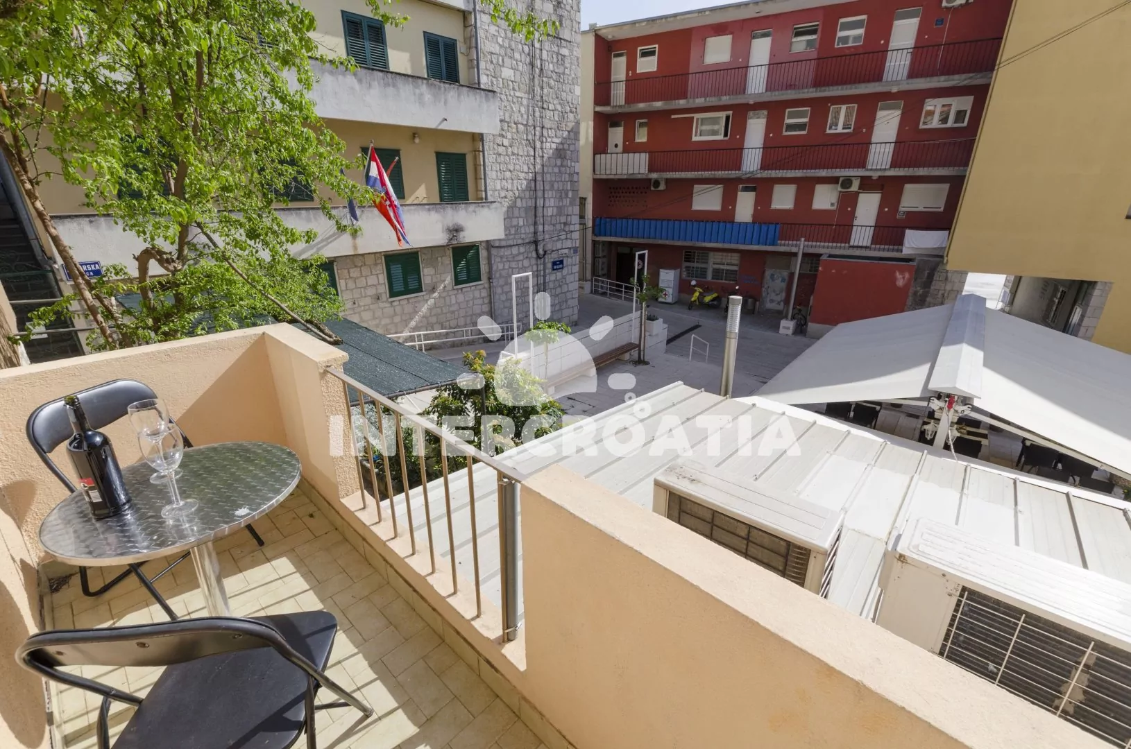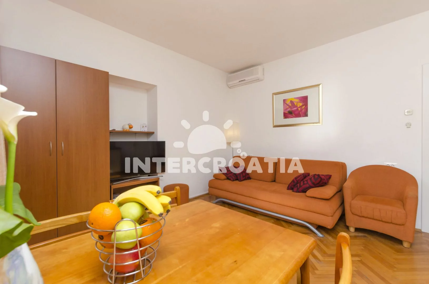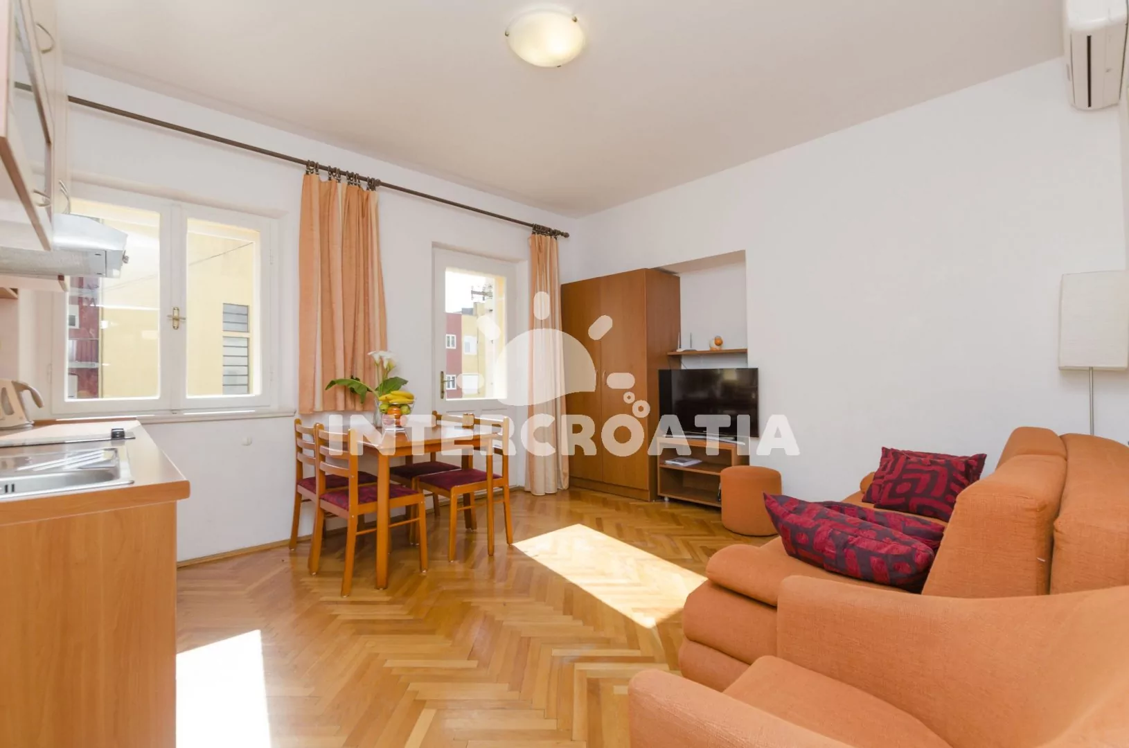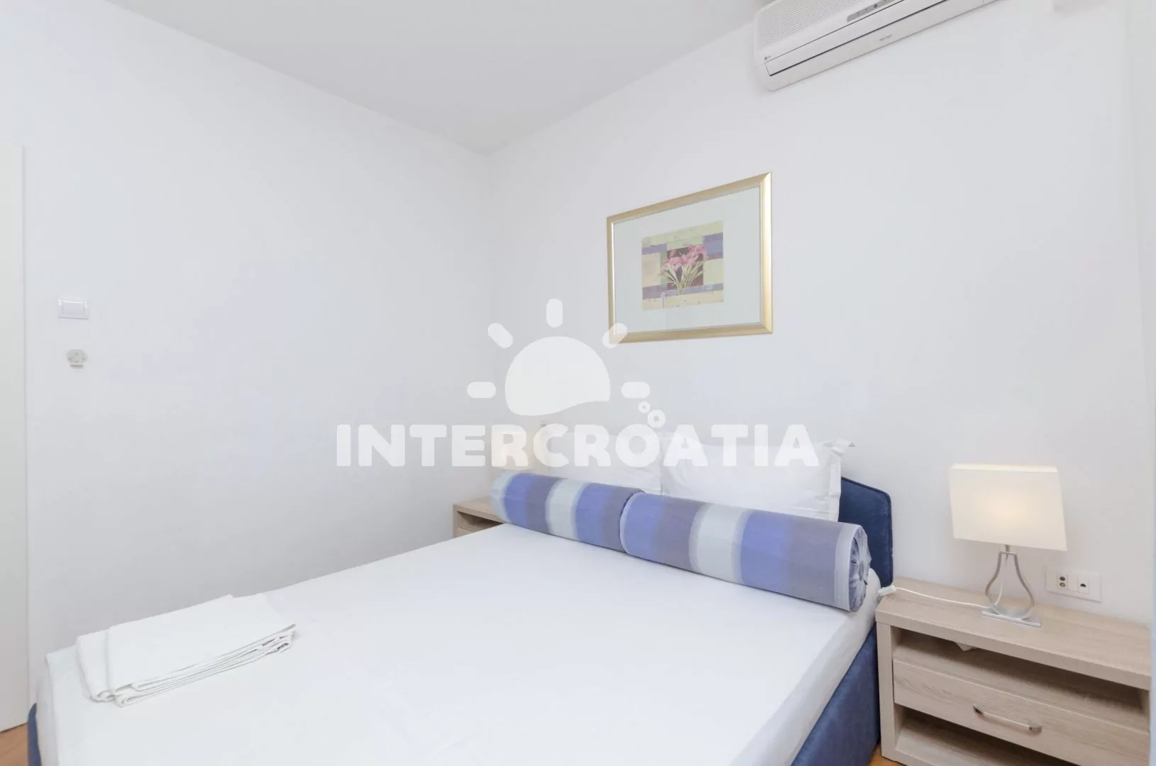 Apartmán s balkonem a výhledem do klidné ulice je umístěný v prvním patře domu. Obývací pokoj je spojený s kuchyní. Kuchyňská linka je vybavena dvouplotýnkovým sporákem, digestoří, rychlovarnou konvicí, toustovačem, nádobím a lednicí s mrazákem. Obývací pokoj s jídelním stolem pro 4 osoby, pohovkou (rozložitelná na extra lůžko pro 2 osoby), televizí, klimatizací a vstupem na balkon. Ložnice je vybavena jedním dvoulůžkem. Koupelna se sprchovým koutem, umyvadlem a wc.