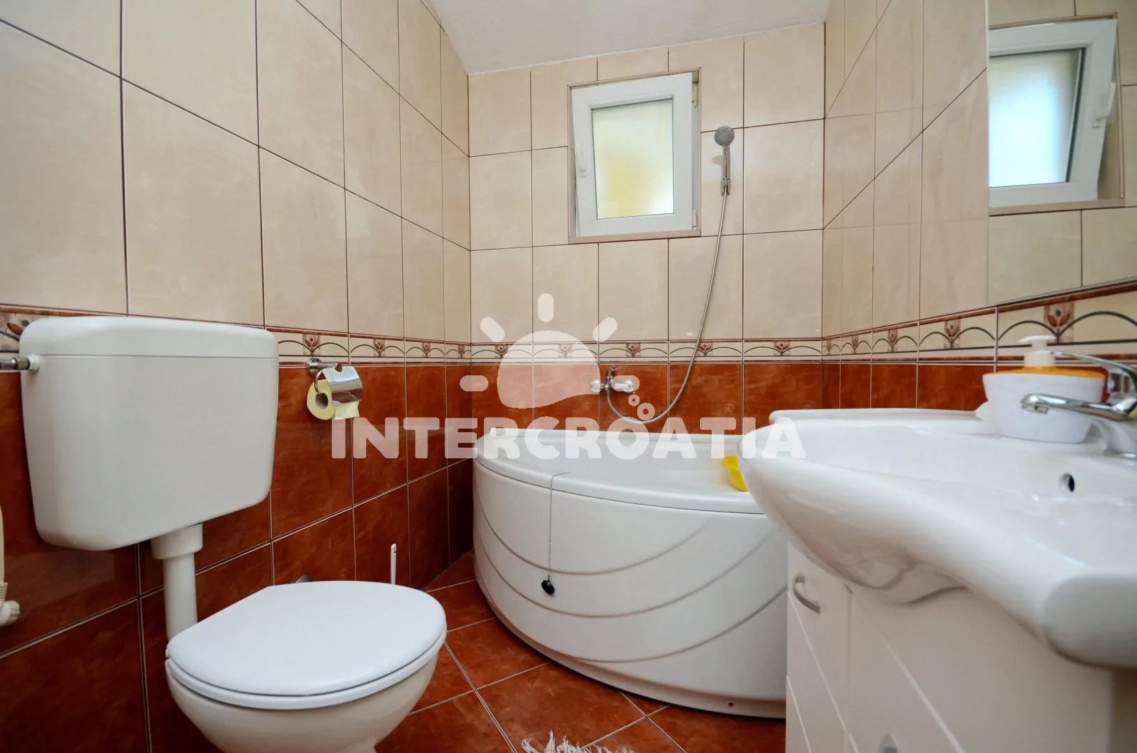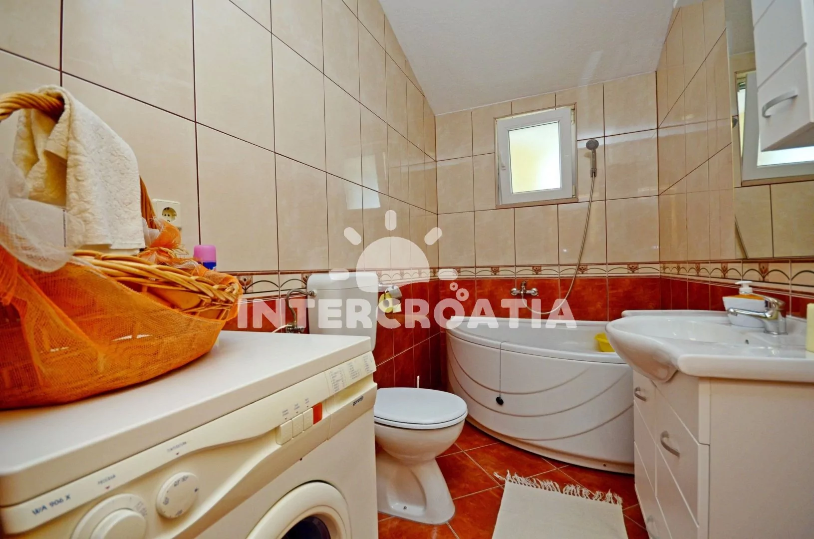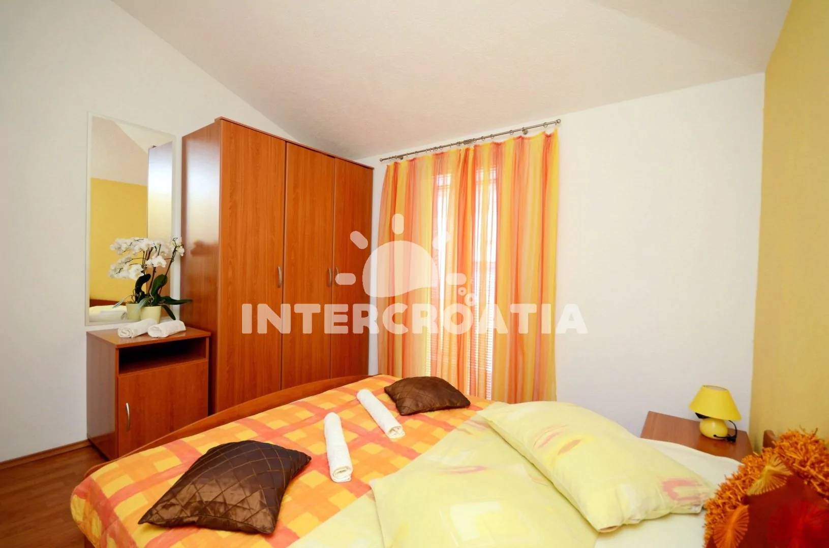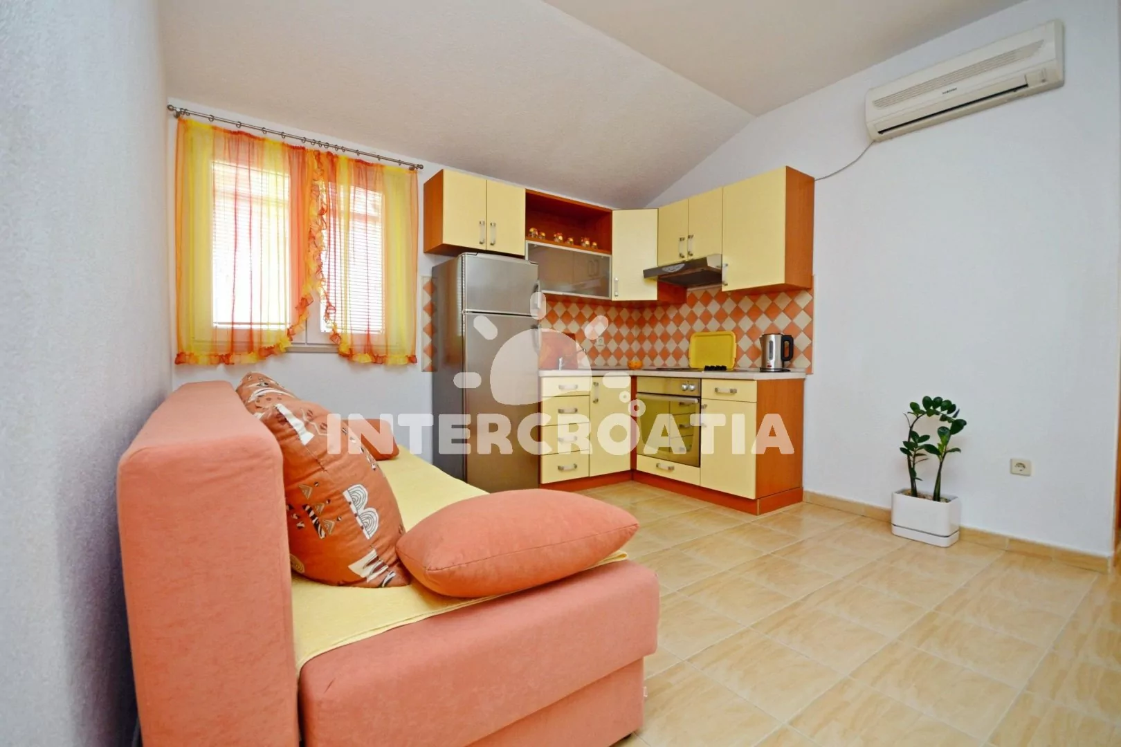 Apartmán s terasou, venkovním posezením a výhledem do klidné ulice se nachází v druhém patře vily. Obývací pokoj je spojený s kuchyní. Kuchyňská linka je vybavena sporákem, digestoří, troubou, rychlovarnou konvicí, nádobím a lednicí s mrazákem. Obývací pokoj s pohovkou (rozložitelná na extra lůžko pro 2 osoby), televizí se satelitním programem, radiem, klimatizací a vstupem na terasu. Ložnice je vybavena jedním dvoulůžkem. Koupelna s vanou, sprchou, umyvadlem, pračkou a wc. Hostům je k dispozici parkování u objektu zdarma.
