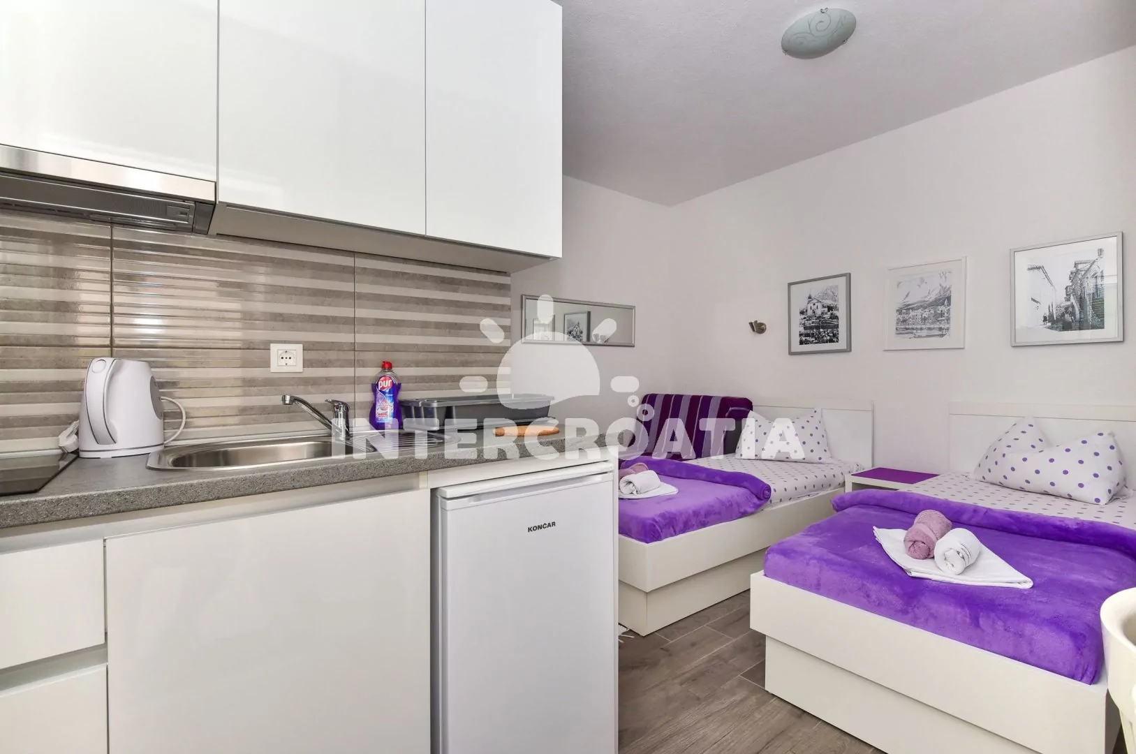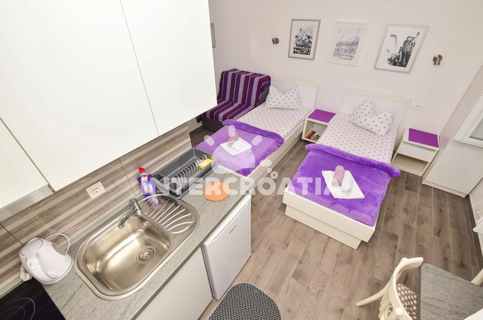 Apartmán typu studio s vlastní terasou a posezením se nachází v přízemí domu a je vhodný pro 2 osoby. Obývací místnost je spojena s kuchyní. Kuchyňská linka je vybavena dvouplotýnkovým sporákem,…