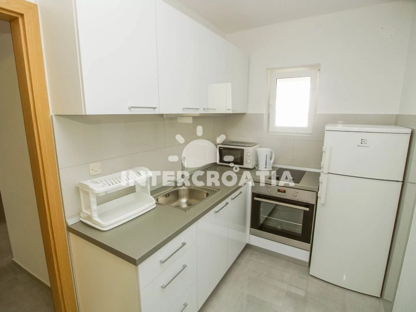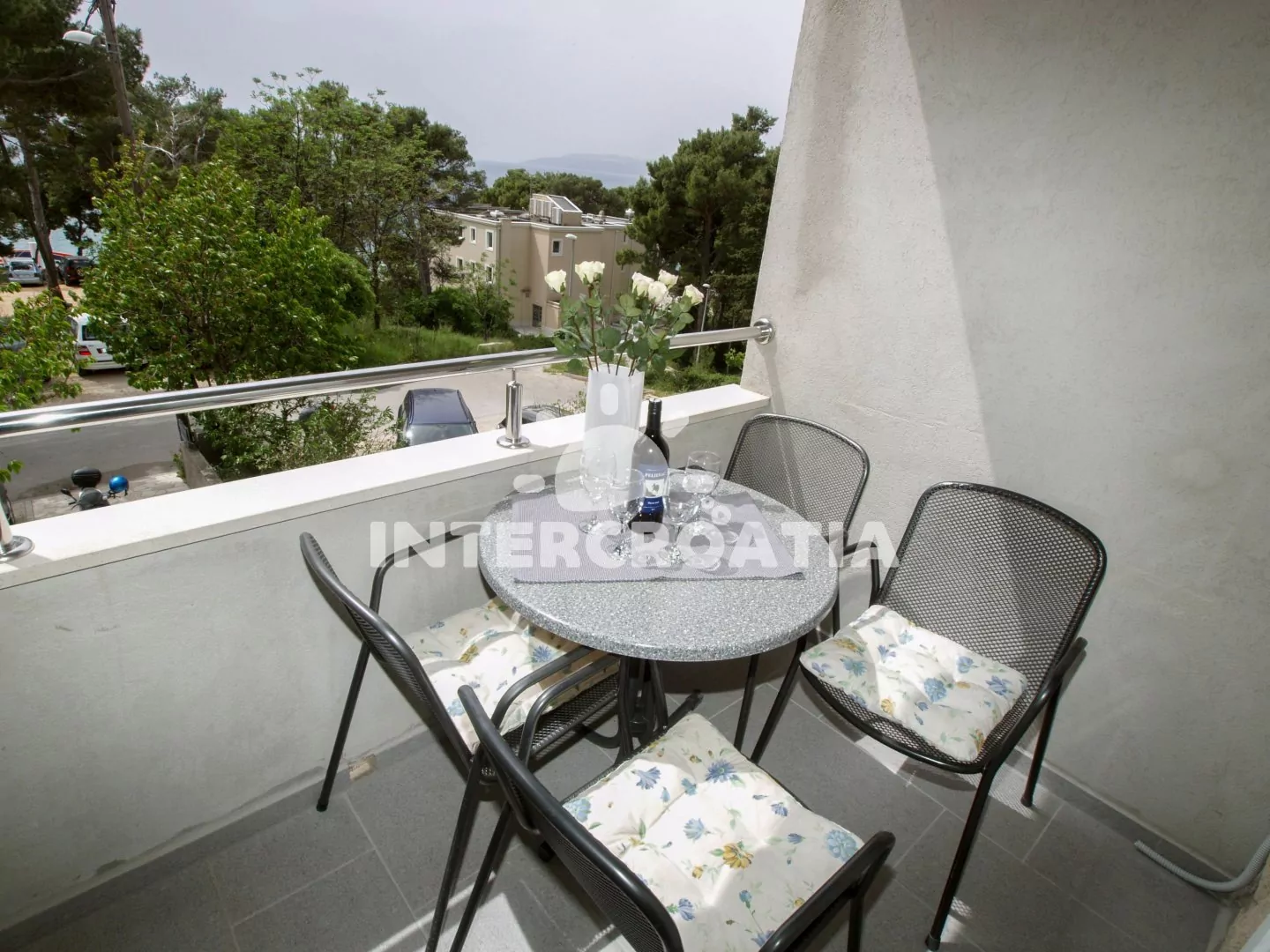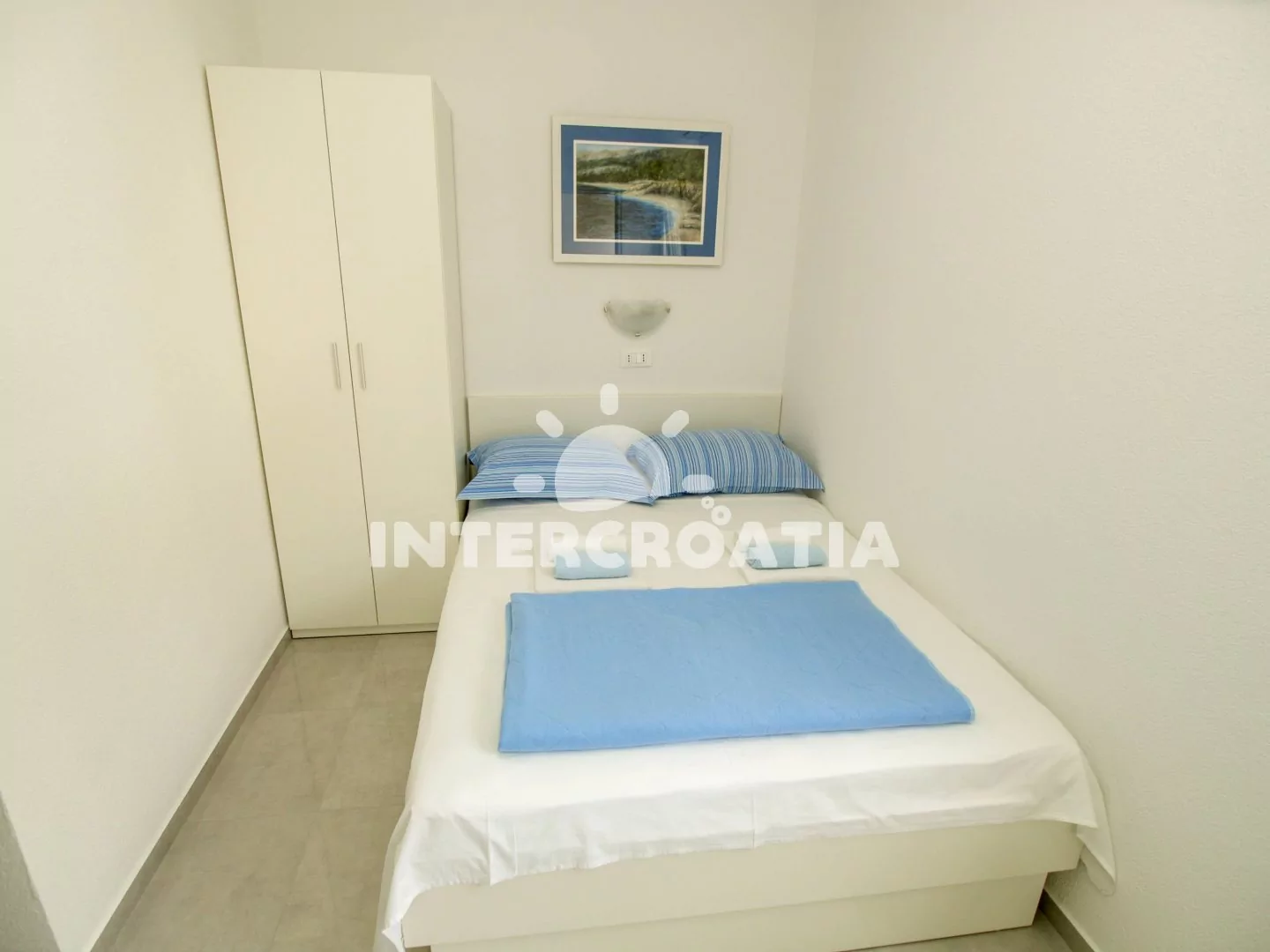 Komfortně zařízený apartmán (55 m2) s balkonem a výhledem na moře, se nachází v 2. patře domu a je vhodný pro 4 osoby. Obývací pokoj je spojený s kuchyní. Kuchyňská linka je vybavena dvouplotýnkovou varnou deskou, troubou, rychlovarnou konvicí, mikrovlnnou troubou, nádobím a lednicí s mrazákem. Obývací pokoj s jídelním stolem pro 4 osoby, pohovkou a televizí se satelitním programem. První ložnice s jedním dvoulůžkem, klimatizací a vstupem na balkon. Druhá ložnice s dvoulůžkem. První i druhá koupelna se sprchovým koutem, umyvadlem a wc. Hostům je k dispozici parkování u objektu zdarma.