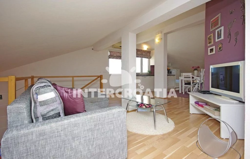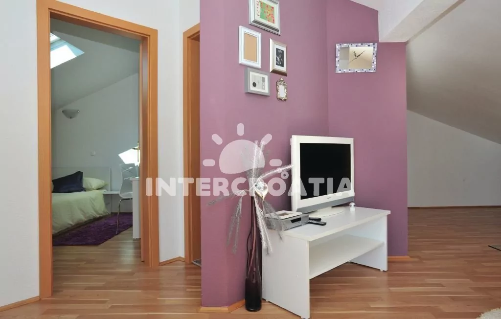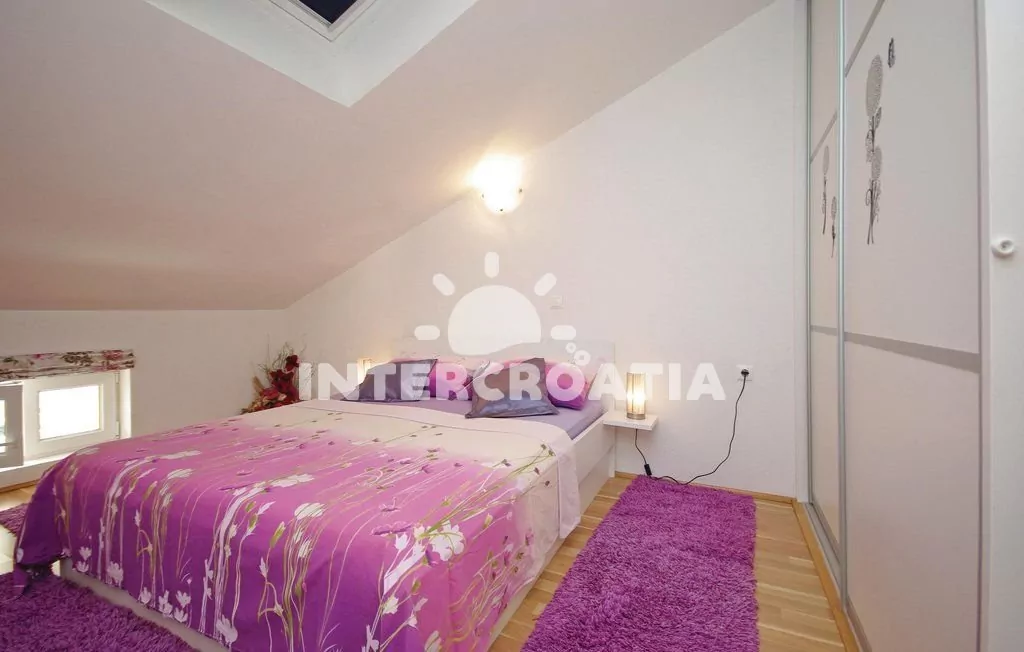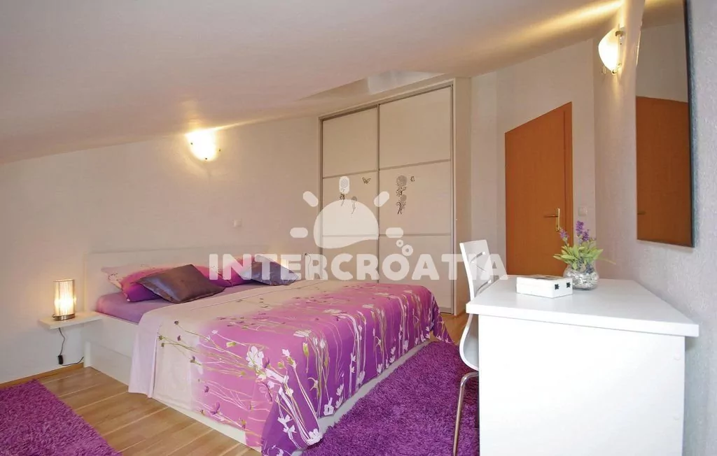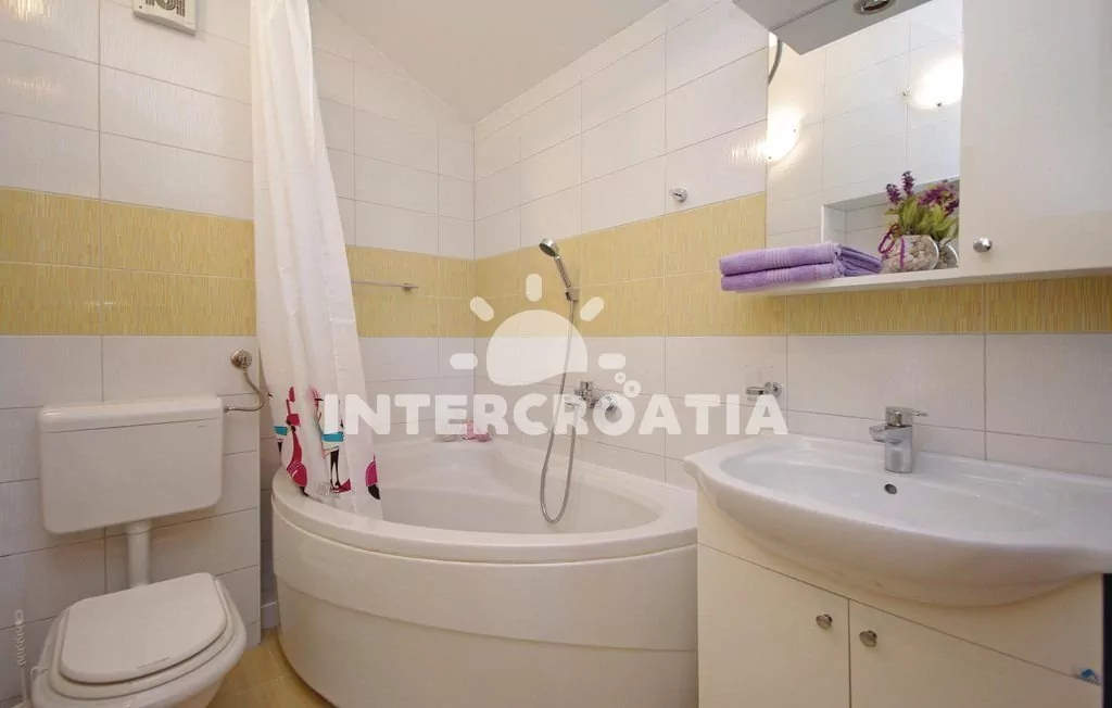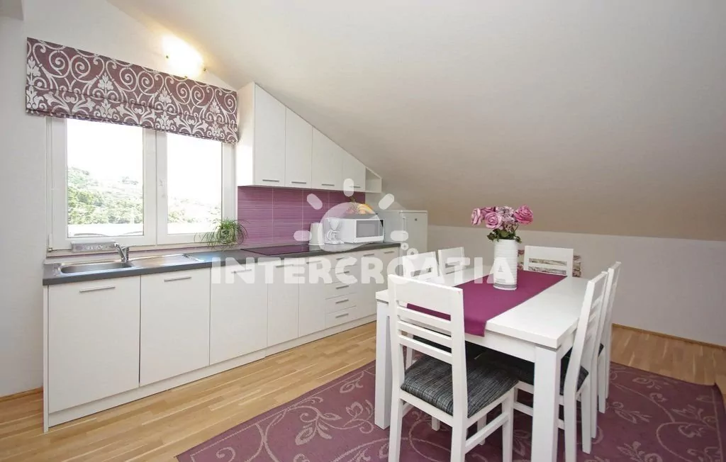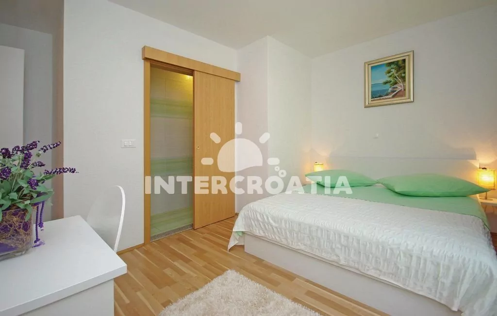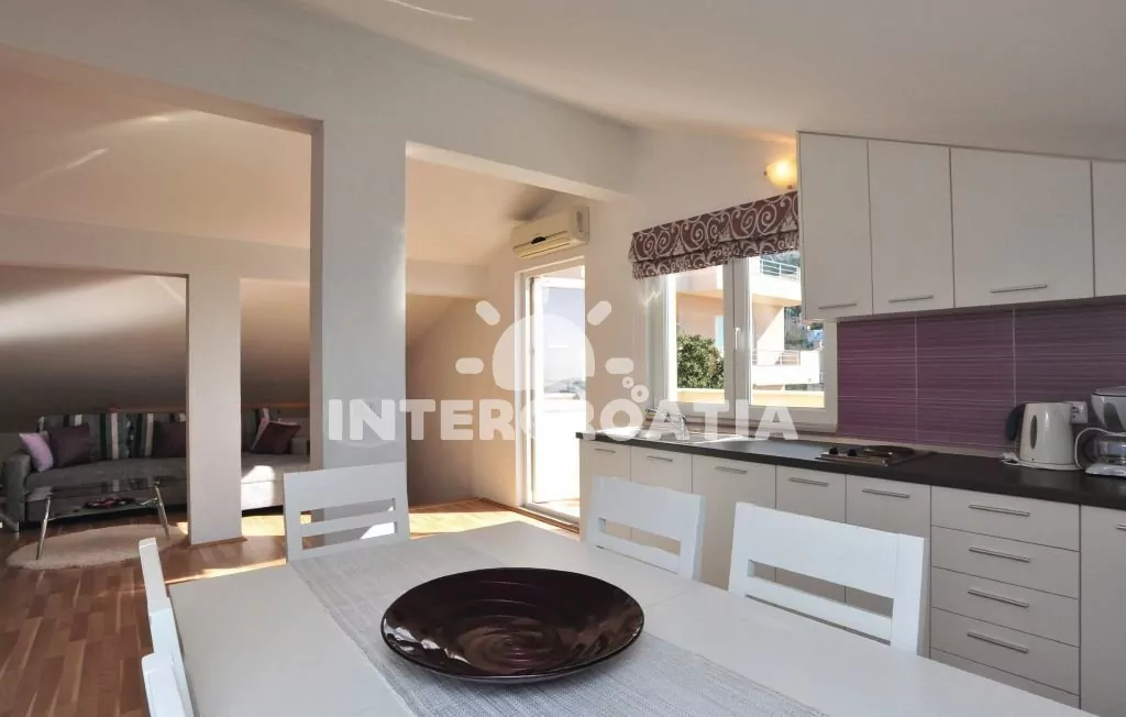 Dvouposchoďový apartmán (80 m2) s vlastní terasou a výhledem na moře je vhodný pro 4 až 5 osob. Obývací pokoj je spojený s kuchyní. Kuchyňská linka je vybavena sklokeramickou varnou deskou, mikrovlnnou troubou, myčkou na nádobí, rychlovarnou konvicí, kávovarem, nádobím a lednicí s mrazákem. Obývací pokoj s jídelním stolem pro 6 osob, rohovou pohovkou (rozložitelná na extra lůžko pro 1 osobu), televizí se satelitním programem, klimatizací a vstupem na terasu. První ložnice s dvoulůžkem. Druhá ložnice s dvoulůžkem, klimatizací a vstupem na balkon. První i druhá koupelna je vybavena vanou, sprchovou zástěnou, umyvadlem, wc a jedním fénem. Hostům je k dispozici parkování u objektu zdarma.