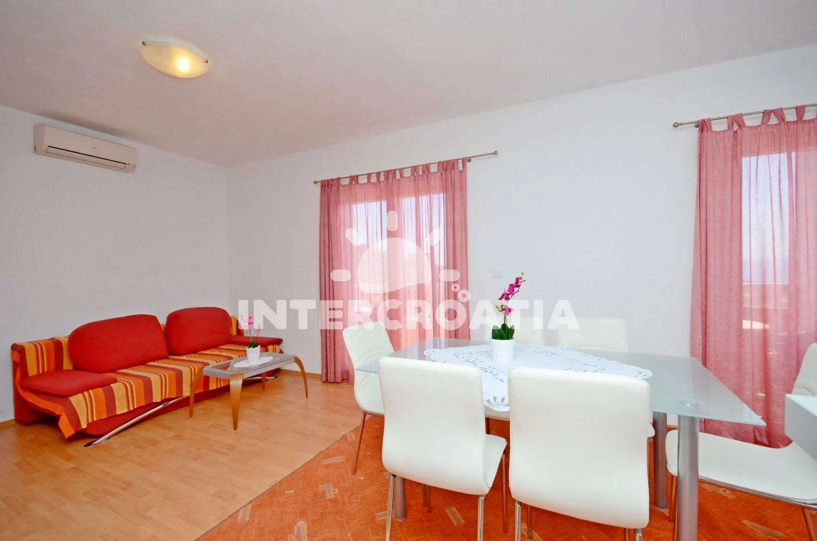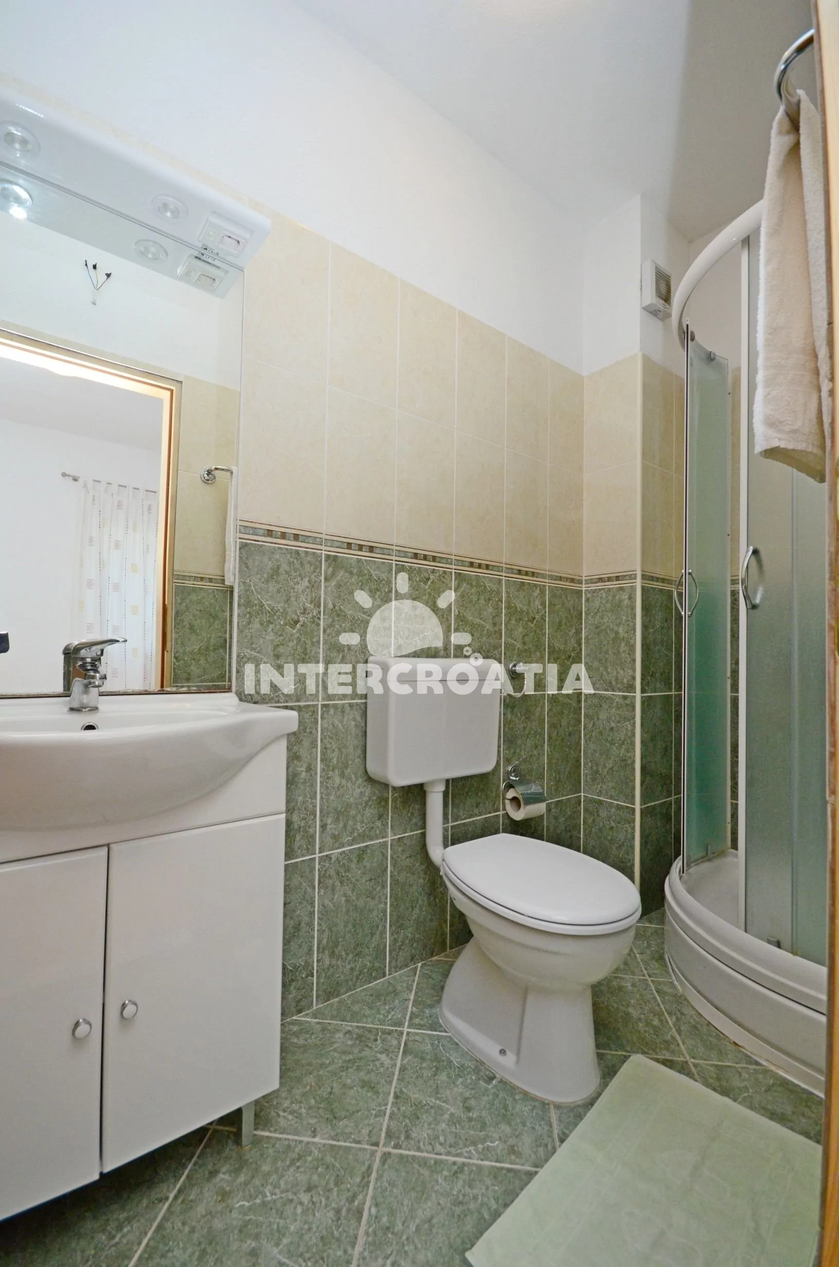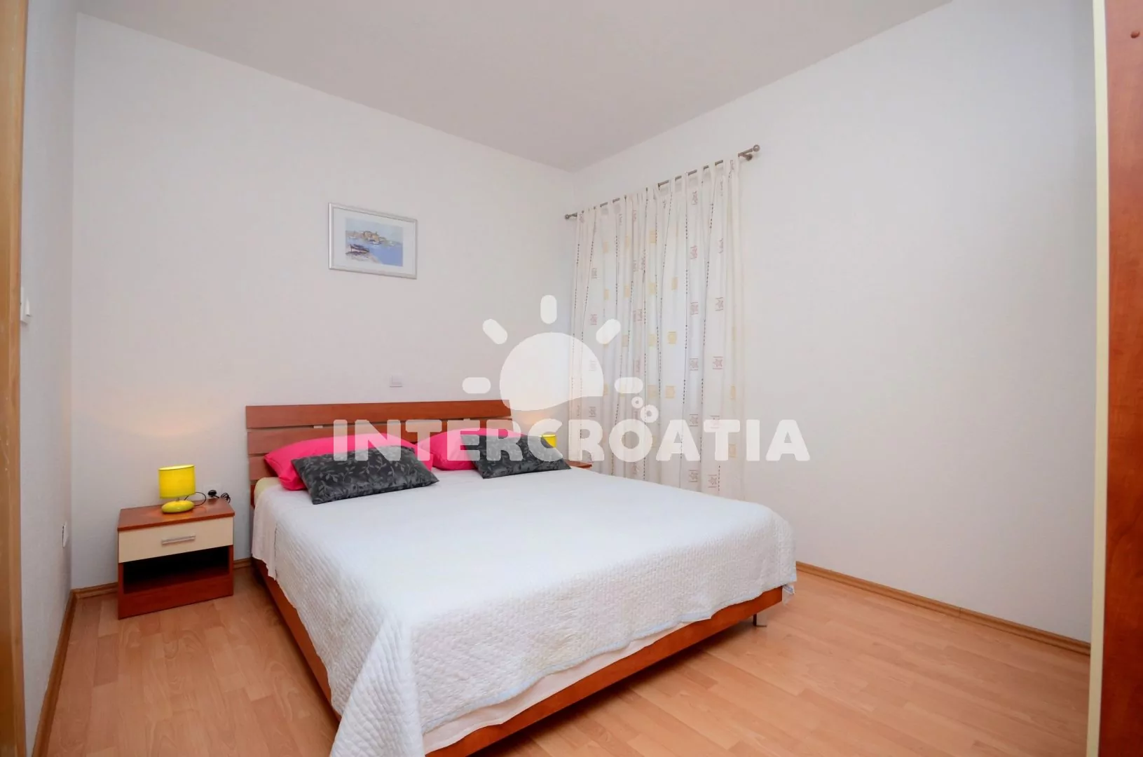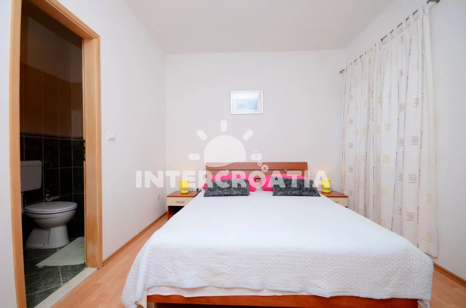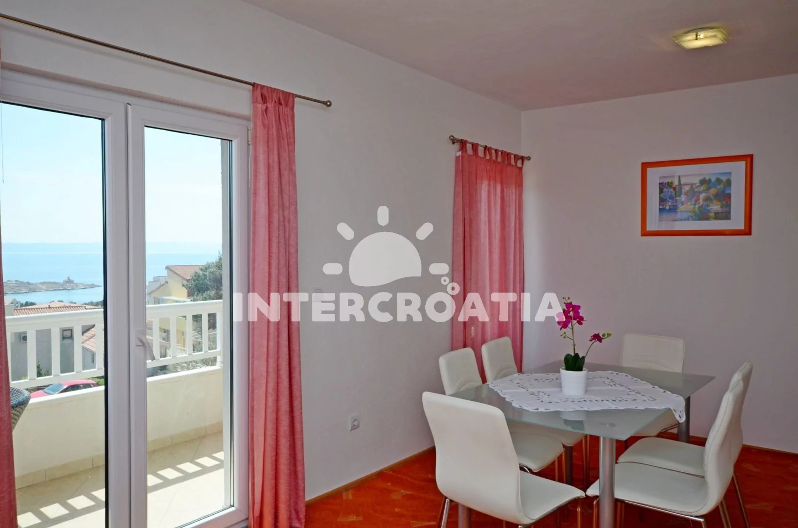 Apartmán (85 m2) s balkonem, posezením a výhledem na moře se nachází ve 2. patře domu. Apartmán má 2 ložnice, 2 koupelny a je vhodný pro 4 až 6 osob. Obývací pokoj je spojený s kuchyní. Kuchyňská linka je vybavena sklokeramickou varnou deskou, digestoří, vestavěnou troubou, rychlovarnou konvicí, nádobím a lednicí s mrazákem. Obývací pokoj s jídelním stolem, pohovkou (rozložitelná na extra lůžko pro 2 osoby), televizí se satelitním programem, klimatizací a vstupem na balkon. První i druhá ložnice je vybavena vždy s jedním dvoulůžkem. Dvě koupelny se sprchovým koutem, umyvadlem a wc. Dále k dispozici fén a parkování u domu, nebo v garáži zdarma.