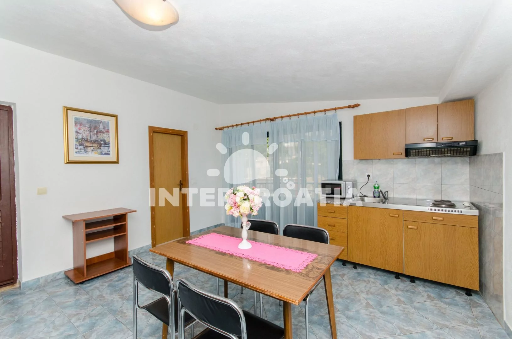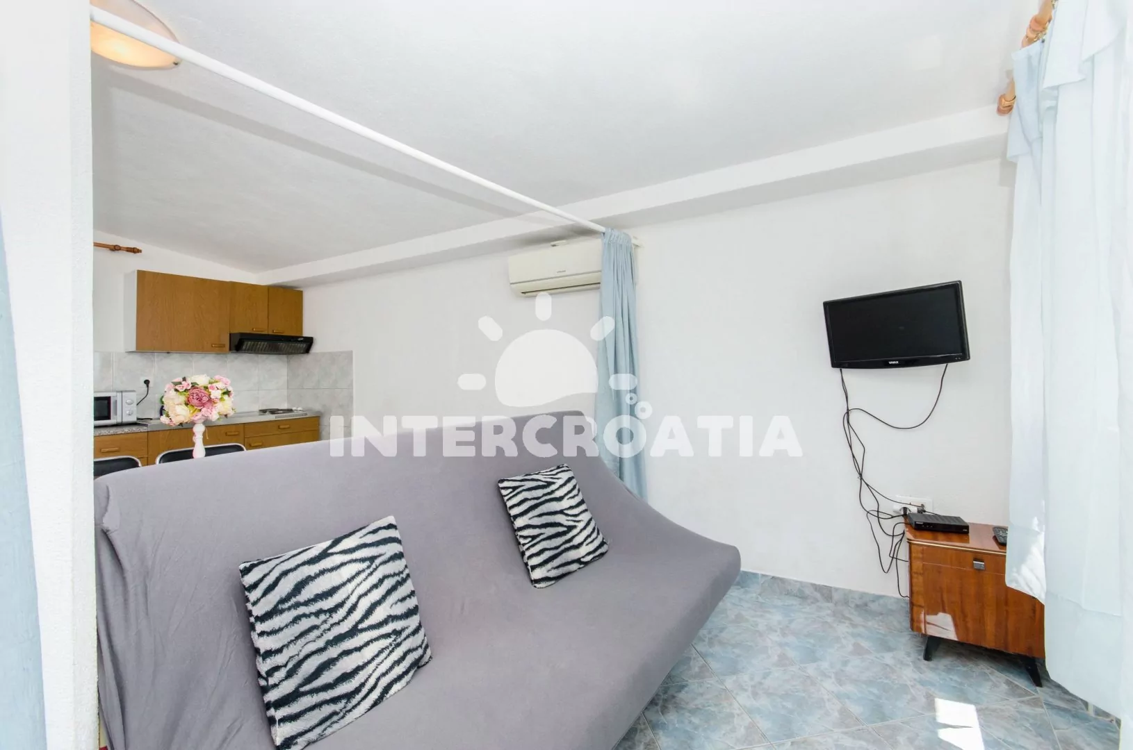 Apartmán (48 m2) s balkonem a výhledem na moře se nachází ve 3. patře domu. Apartmán má 1 ložnici a je vhodný pro 3 až 4 osoby. Obývací pokoj je spojený s kuchyní. Kuchyňská linka je vybavena dvouplotýnkovým vařičem, mikrovlnnou troubou, rychlovarnou konvicí, nádobím a lednicí s mrazákem. Obývací pokoj s jídelním stolem, pohovkou (rozložitelná na extra lůžko pro 1 osobu, televizí se satelitním programem, klimatizací a vstupem na balkon. Ložnice s dvoulůžkem a jedním jednolůžkem. Koupelna se sprchovým koutem, umyvadlem a wc. Hostům je k dispozici parkování u objektu zdarma.