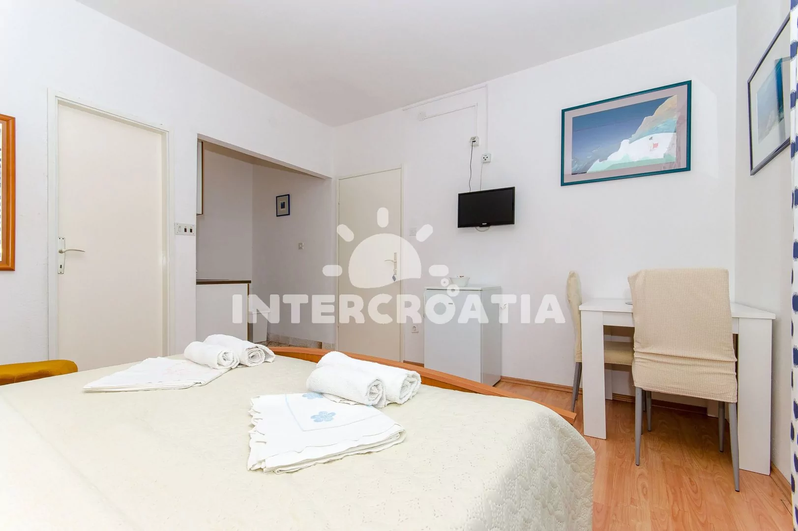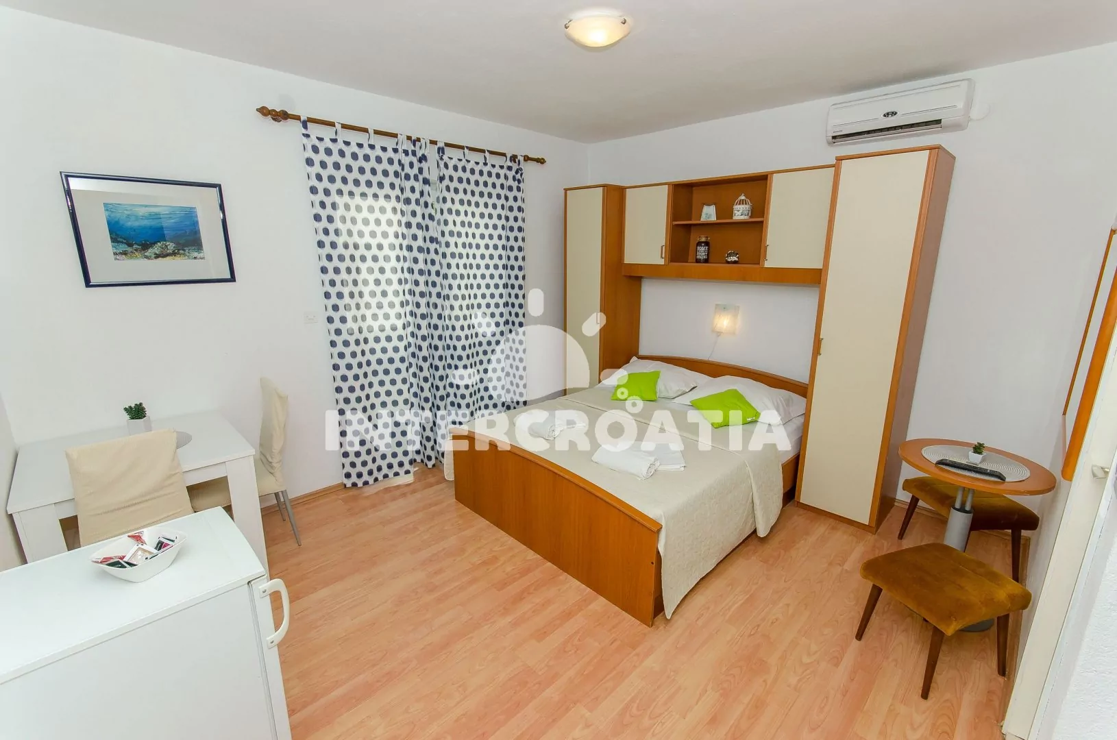 Apartmán (25 m2) typu studio s balkonem a venkovním posezením se nachází v 1. patře domu. Obývací místnost je spojena s kuchyní. Kuchyňská linka je vybavena dvouplotýnkovým vařičem, rychlovarnou konvicí, nádobím a lednicí s mrazákem (kávovar na požádání). Obývací místnost s jídelním stolem, dvoulůžkem, televizí se satelitním programem, klimatizací a vstupem na balkon. Koupelna s vanou, sprchovou zástěnou, umyvadlem, fénem a wc. Hostům je k dispozici parkování u objektu zdarma.
