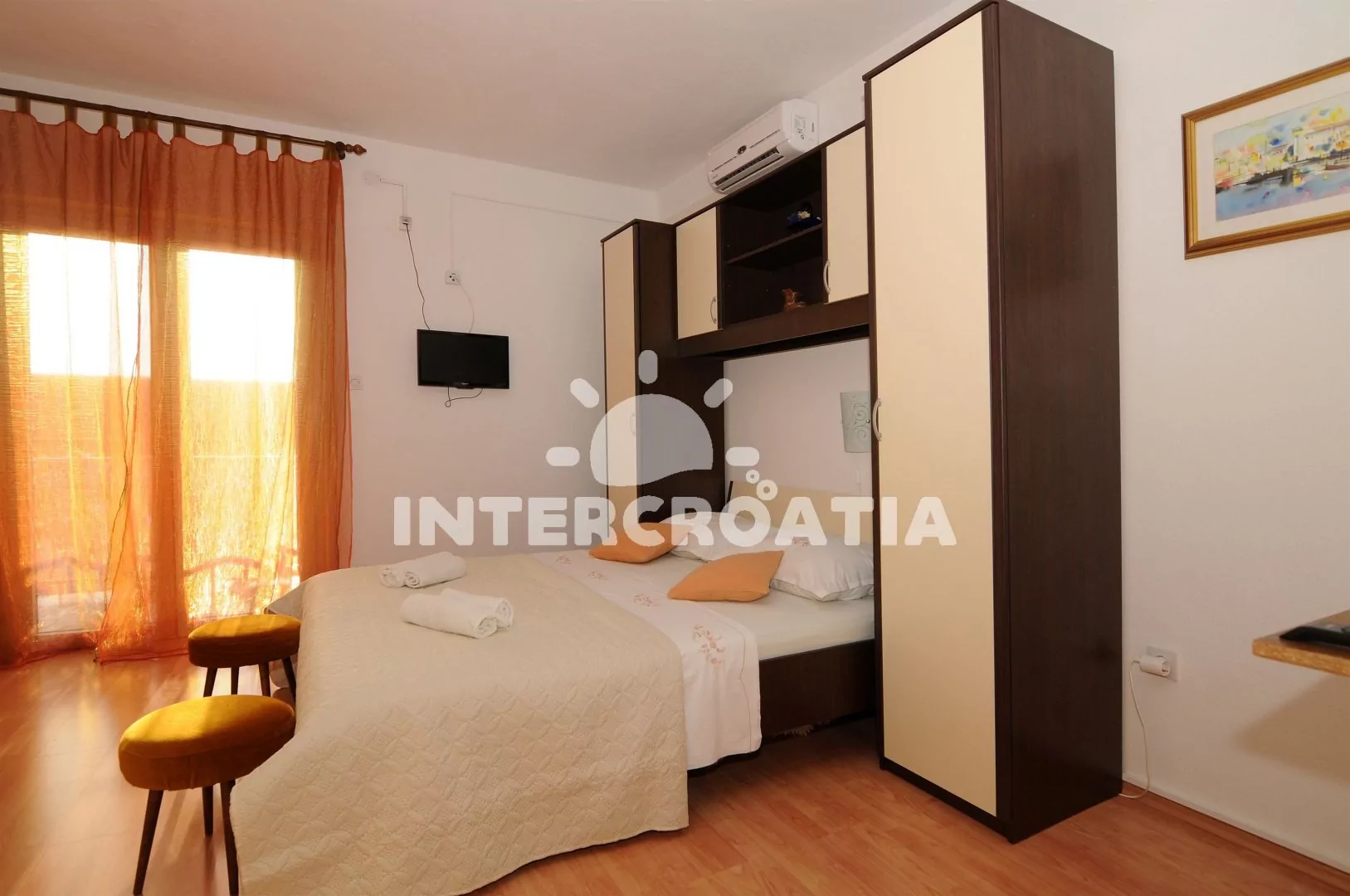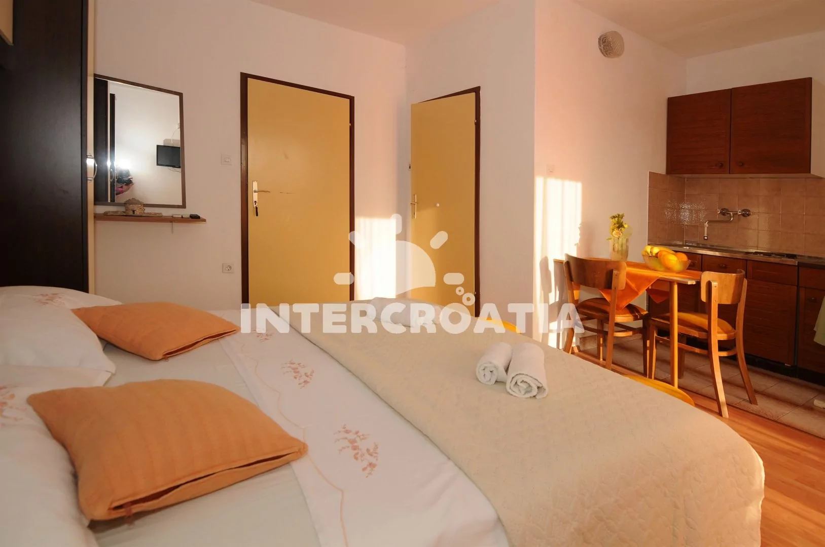 Apartmán (25 m2) typu studio s balkonem a venkovním posezením se nachází v 1. patře domu. Obývací místnost je spojena s kuchyní. Kuchyňská linka je vybavena dvouplotýnkovým vařičem, rychlovarnou konvicí, nádobím a lednicí s mrazákem. Obývací místnost s jídelním stolem, dvoulůžkem, televizí se satelitním programem, klimatizací a vstupem na balkon. Koupelna se sprchovým koutem, umyvadlem, fénem a wc. Hostům je k dispozici parkování u objektu zdarma.