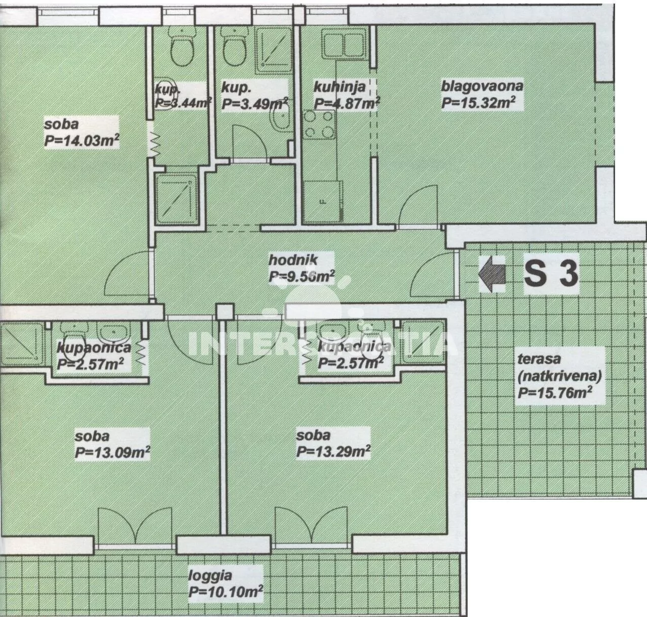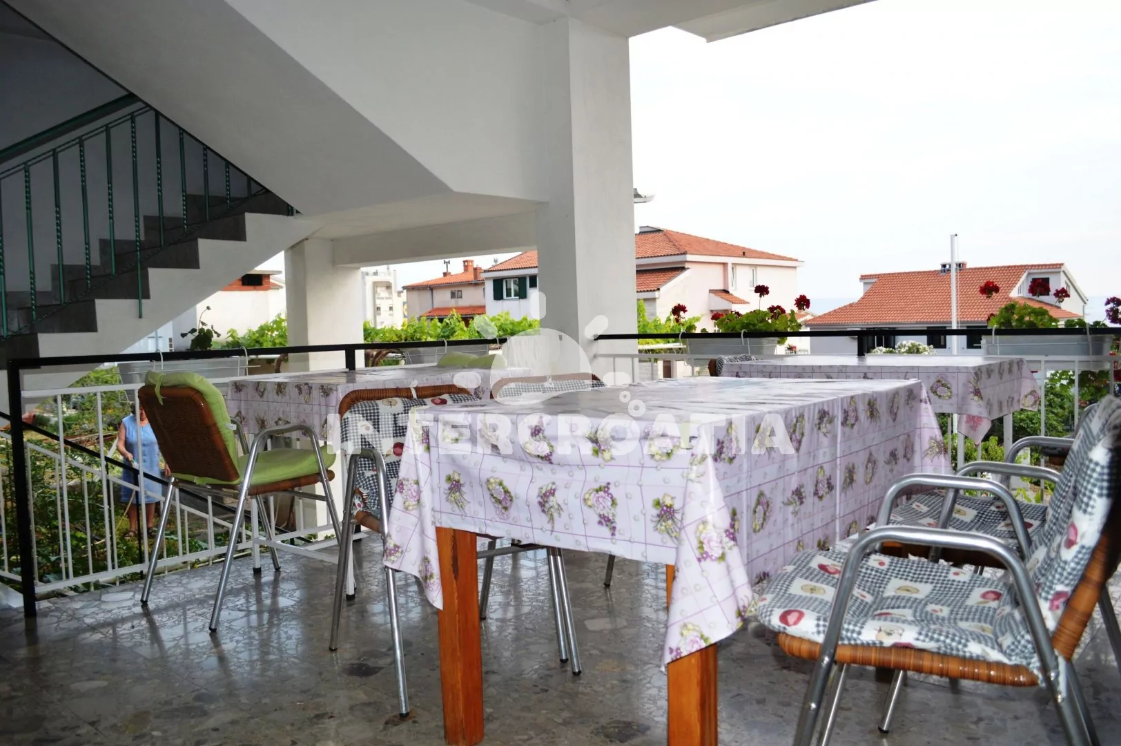 Apartmán (100 m2) s terasou a venkovním posezením se nachází v 1. patře domu. Apartmán má 3 ložnice, 3 koupelny a je vhodný pro 7 až 9 osob. Obývací pokoj je spojený s kuchyní. Kuchyňská linka je vybavena varnou deskou, vestavěnou troubou, rychlovarnou konvicí, kávovarem, mikrovlnnou troubou, toustovačem, nádobím a lednicí s mrazákem. Obývací pokoj s jídelním stolem, pohovkou (rozložitelná na extra lůžko pro 2 osoby), televizí a klimatizací. První a druhá ložnice je vybavena vždy s jedním dvoulůžkem a klimatizací. Třetí ložnice s dvoulůžkem, jedním jednolůžkem a klimatizací. První koupelna se sprchovým koutem, umyvadlem, pračkou, fénem a wc. Druhá a třetí koupelna se sprchovým koutem, umyvadlem a wc. Hostům je k dispozici parkování u objektu zdarma.