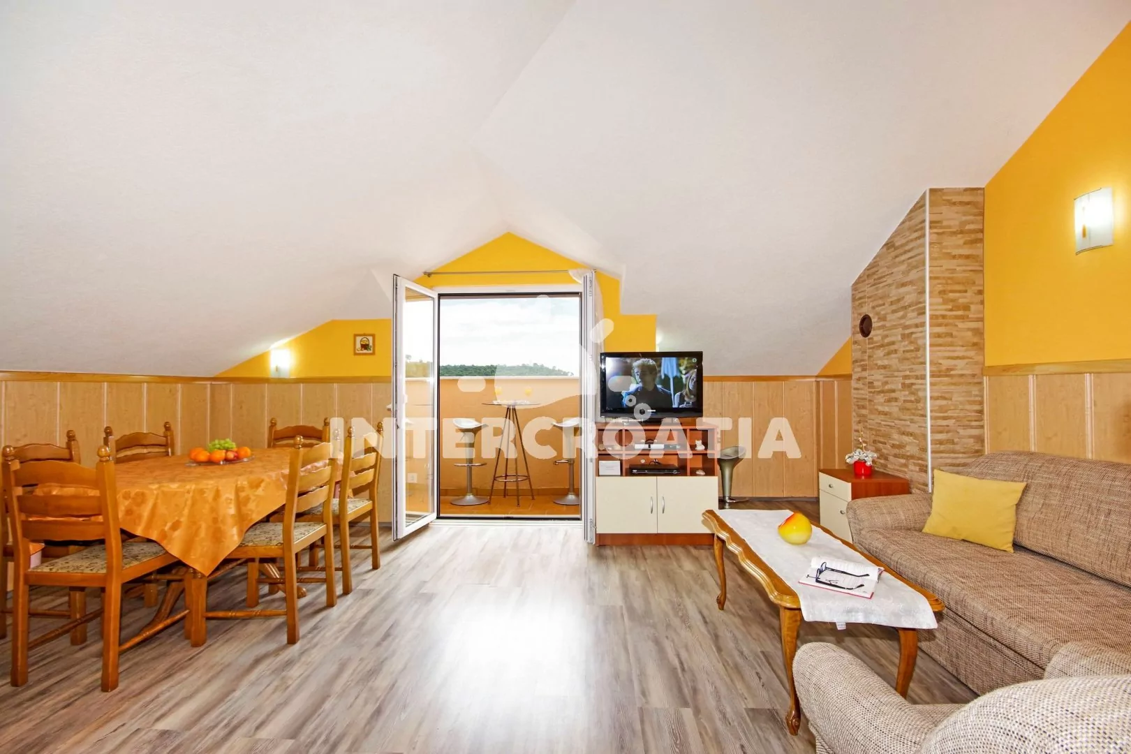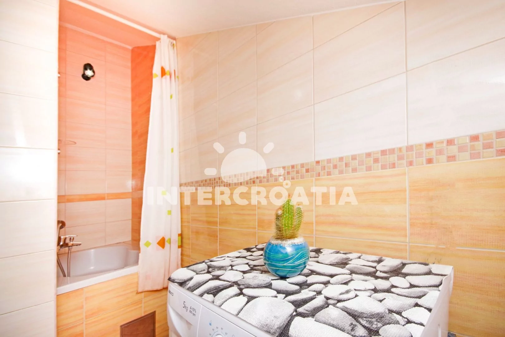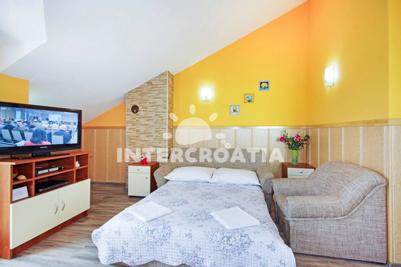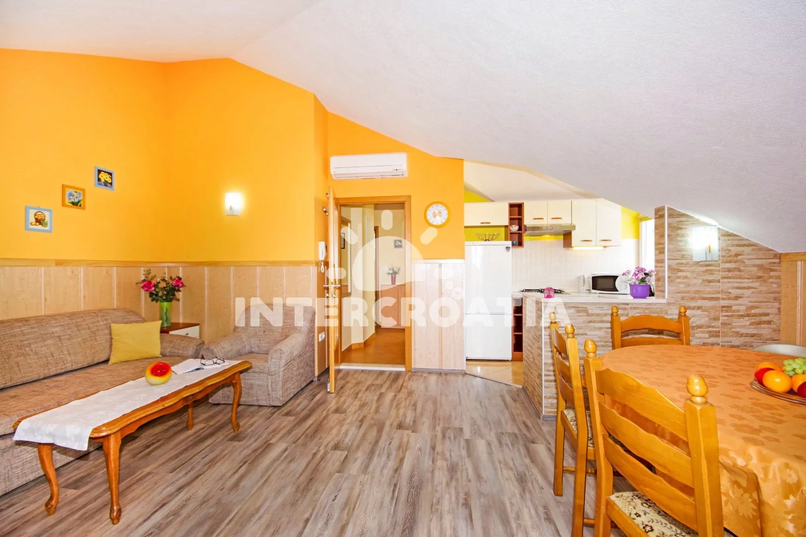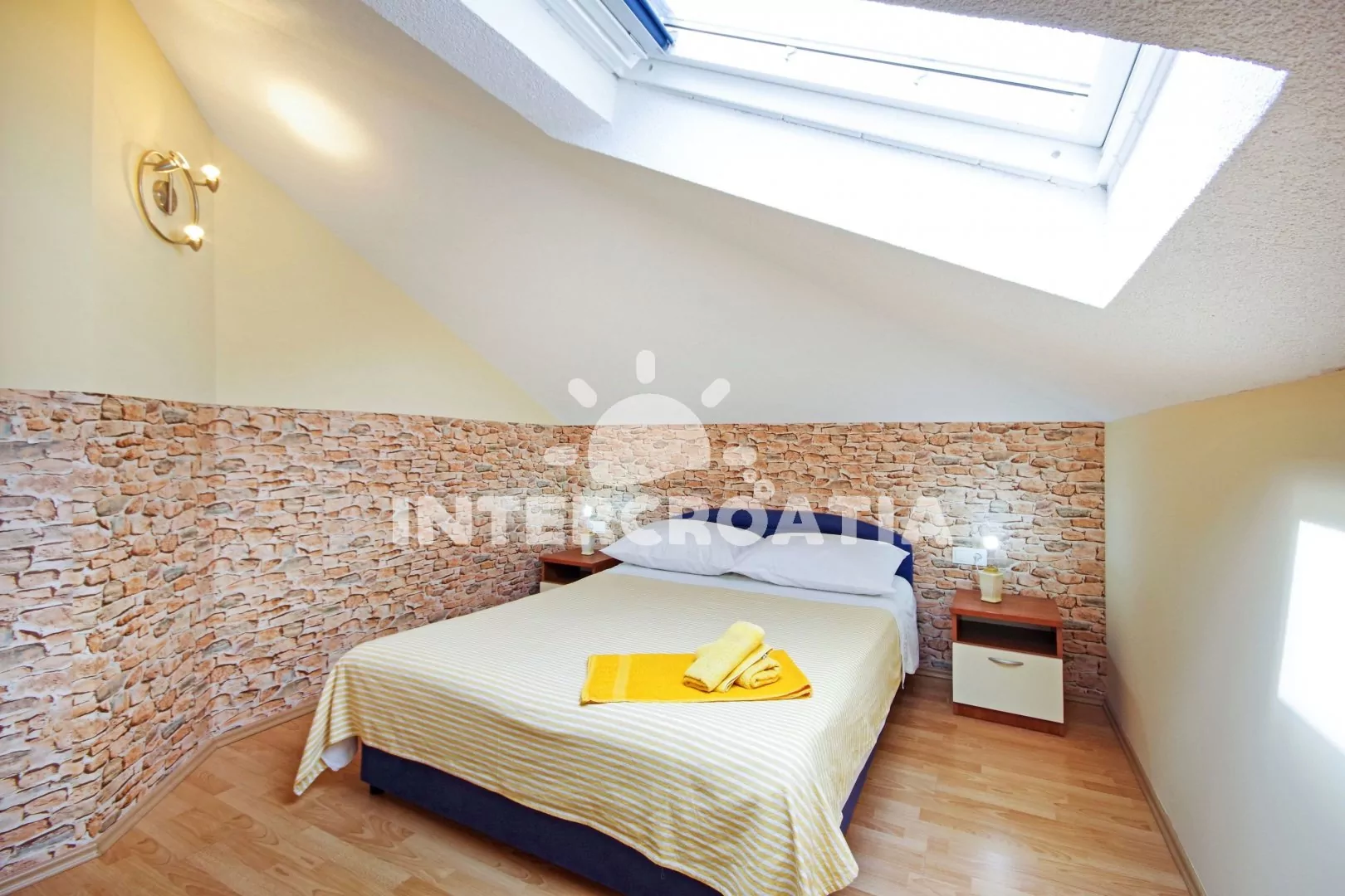 Apartmán (52 m2) s balkonem, venkovním posezením a výhledem na moře se nachází ve 3. patře domu. Apartmán má 1 ložnici a je vhodný pro 2 až 4 osoby. Obývací pokoj je spojený s kuchyní. Kuchyňská linka je vybavena varnou deskou, digestoří, vestavěnou troubou, myčkou na nádobí, rychlovarnou konvicí, kávovarem, mikrovlnnou troubou, nádobím a lednicí s mrazákem. Obývací pokoj s jídelním stolem, pohovkou (rozložitelná na extra lůžko pro 2 osoby), televizí se satelitním programem, DVD přehrávačem, klimatizací a vstupem na balkon. Ložnice s dvoulůžkem a klimatizací. Koupelna se sprchovou vanou, umyvadlem, pračkou, fénem a wc. Hostům je k dispozici parkování 50-150 m od objektu zdarma.
