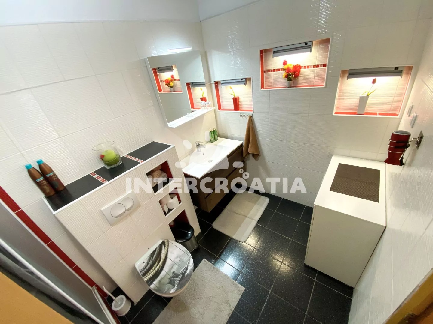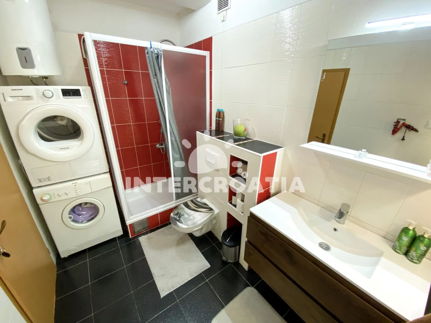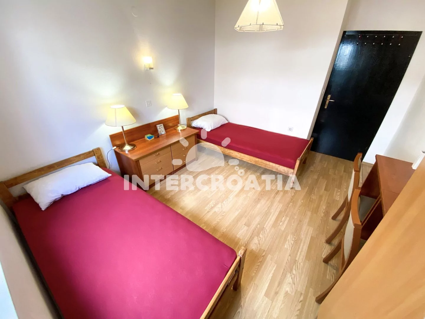 Apartmán (85 m2) s balkonem, posezením a výhledem na moře se nachází v 1. patře domu. Apartmán má 3 ložnice, 2 koupelny a je vhodný pro 6 až 7 osob. Obývací pokoj je spojený s kuchyní. Kuchyňská linka je vybavena varnou deskou, digestoří, vestavěnou troubou, rychlovarnou konvicí, kávovarem, toustovačem, nádobím a lednicí s mrazákem. Obývací pokoj s jídelním stolem, pohovkou (rozložitelná na extra lůžko pro 1 osobu), televizí, klimatizací a vstupy na balkon. První a druhá ložnice je vybavena vždy s jedním dvoulůžkem a vstupem na balkon. Třetí ložnice se dvěma jednolůžky. První koupelna se sprchovým koutem, umyvadlem, pračkou, žehličkou, fénem a wc. Druhá koupelna se sprchovým koutem, umyvadlem a wc.