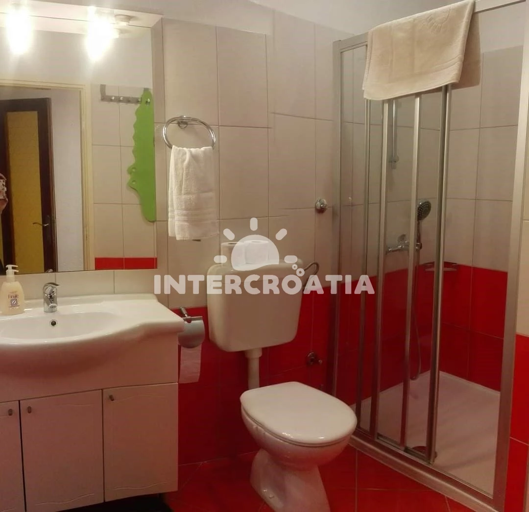 Apartmán (83 m2) s balkonem, a výhledem na moře. Nachází se v 1. patře objektu. Apartmán má 3 ložnice a je vhodný pro až 6 osob. Kuchyňská linka je vybavena varnou deskou, troubou, rychlovarnou konvicí, nádobím, lednicí, mrazákem. K dispozici televize. První ložnice s dvoulůžkem. Druhá ložnice s dvoulůžkem. Třetí ložnice s dvoulůžkem. První koupelna se sprchovým koutem, umyvadlem, fénem a WC. Druhá koupelna se sprchovým koutem, umyvadlem, fénem a WC. Hostům je k dispozici parkování u objektu zdarma.