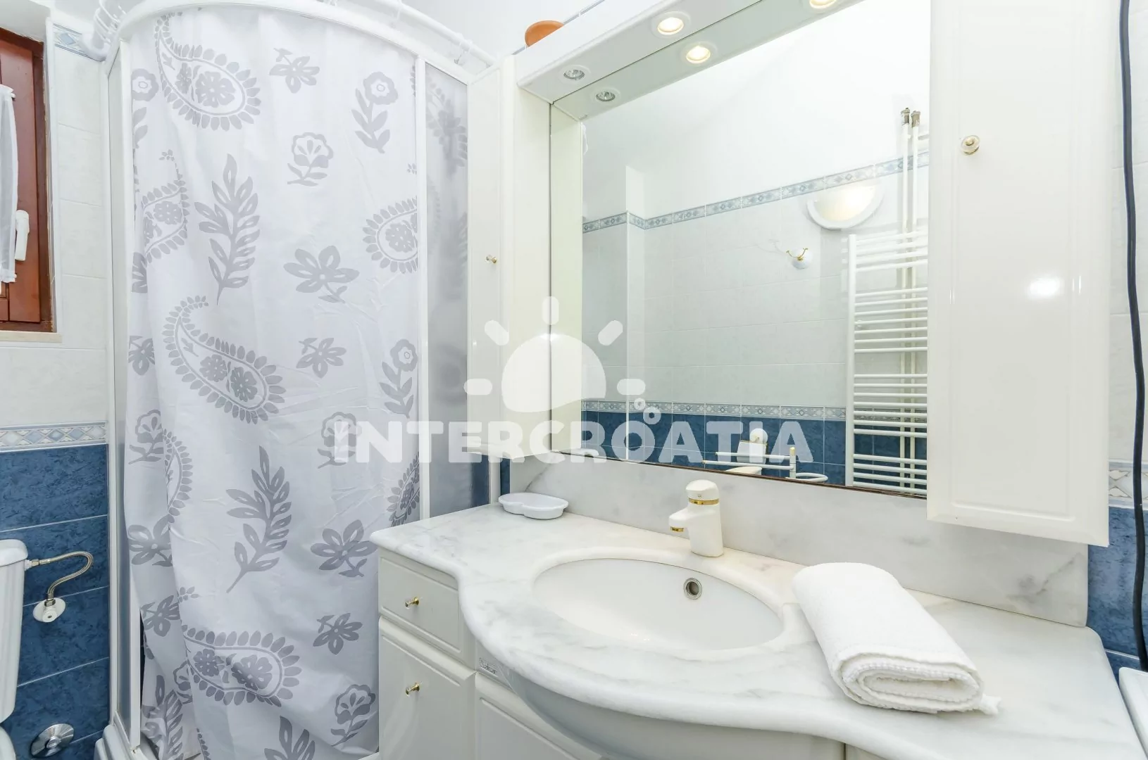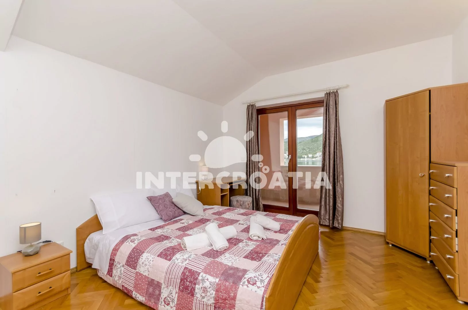 Apartmán (100 m2) v prvním patře vily s výhledem na moře a terasou s venkovním posezením je vhodný pro 7 osob. Obývací místnost je spojena s kuchyní. Kuchyňská linka je vybavena dvouplotýnkovým sporákem, mikrovlnnou troubou, myčkou na nádobí, rychlovarnou konvicí, kávovarem, toustovačem, nádobím a lednicí s mrazákem. Obývací místnost s jídelním stolem pro 6 osob, televizí se satelitním programem, radiem a vstupem na terasu. Tři samostatné ložnice vybaveny vždy klimatizací a vstupem na balkon. První ložnice s dvoulůžkem. Druhá ložnice s dvoulůžkem a jedním jednolůžkem. Třetí ložnice s dvěma jednolůžky. Koupelna se sprchovým koutem, umyvadlem a wc. Dále k dispozici pračka, žehlička a fén. Hostům je k dispozici parkování u objektu zdarma.