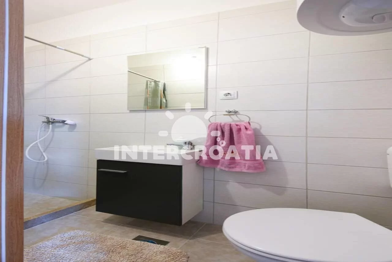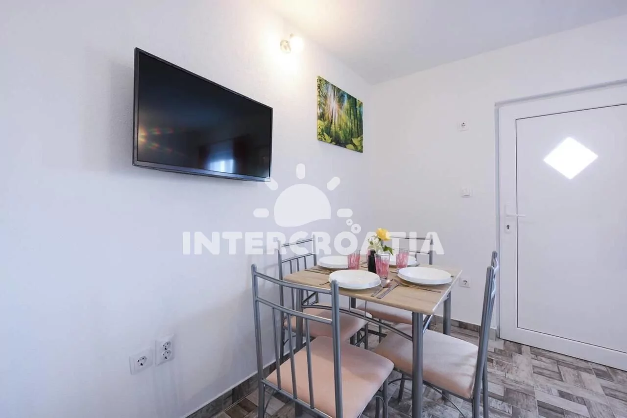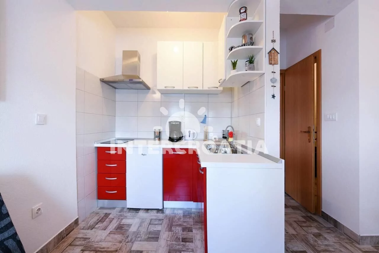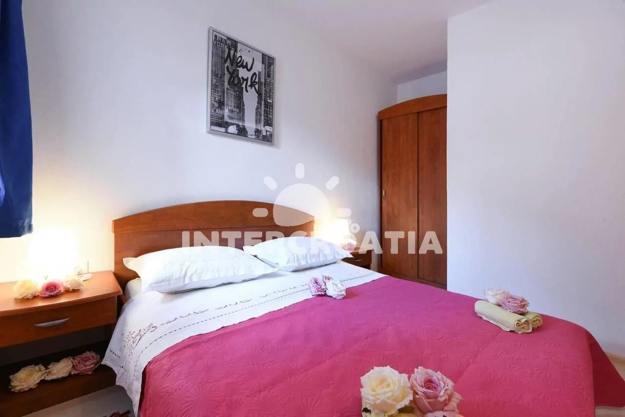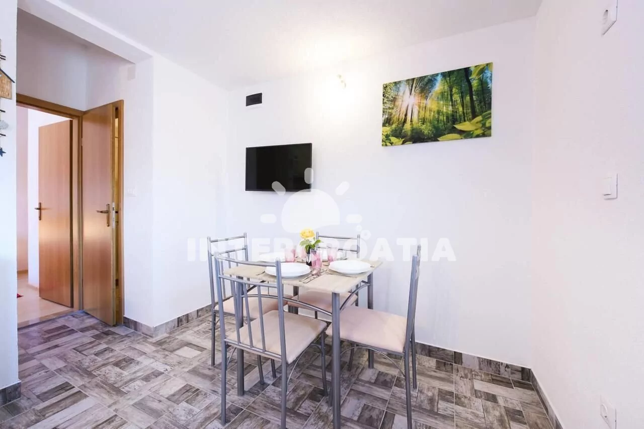 Apartmán (38 m2) s terasou, venkovním posezením a částečným výhledem na moře. Apartmán se nachází v 1. patře domu a je vhodný pro 2 až 4 osoby. Obývací pokoj je spojený s kuchyní. Kuchyňská linka je vybavena dvouplotýnkovou varnou deskou, digestoří, rychlovarnou konvicí, kávovarem, toustovačem, nádobím a lednicí s mrazákem. Obývací pokoj s jídelním stolem pro 4 osoby, pohovkou (rozložitelná na extra lůžko pro 2 osoby), televizí, klimatizací a vstupem na terasu. Ložnice s jedním dvoulůžkem. Koupelna se sprchovým koutem, umyvadlem, fénem a wc. Hostům je k dispozici parkování u objektu zdarma.