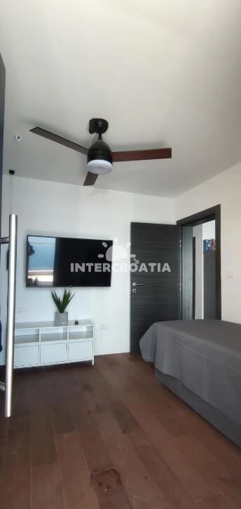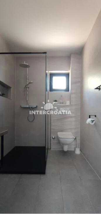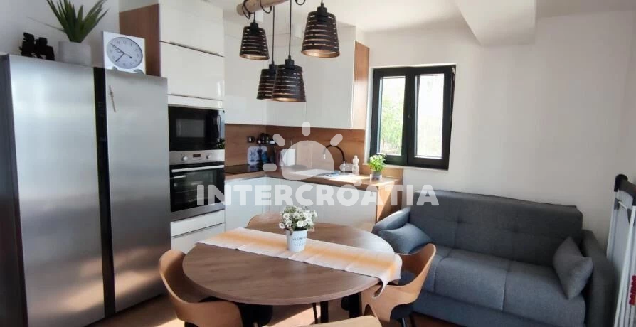 Apartmán (50 m2) s balkonem, s terasou, a výhledem na moře. Nachází se v 1. patře objektu. Apartmán má 2 ložnice a je vhodný pro až 5 osob. Kuchyňská linka je vybavena varnou deskou, troubou, toustovačem, kávovarem, myčkou na nádobí, mikrovlnnou troubou, rychlovarnou konvicí, nádobím, lednicí, mrazákem. V obývací místnosti je rozložitelná pohovka (extra lůžko pro 1 osobu). K dispozici televize, žehlička. První ložnice s dvoulůžkem. Druhá ložnice se 2 jednolůžky. Koupelna se sprchovým koutem, umyvadlem, fénem a WC. Hostům je k dispozici parkování u objektu zdarma.