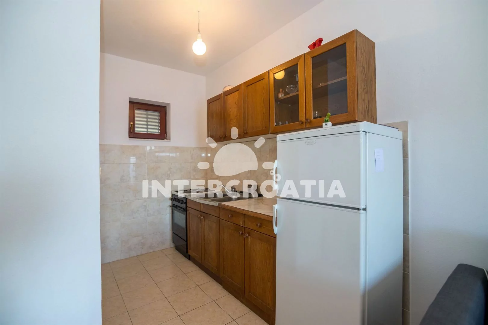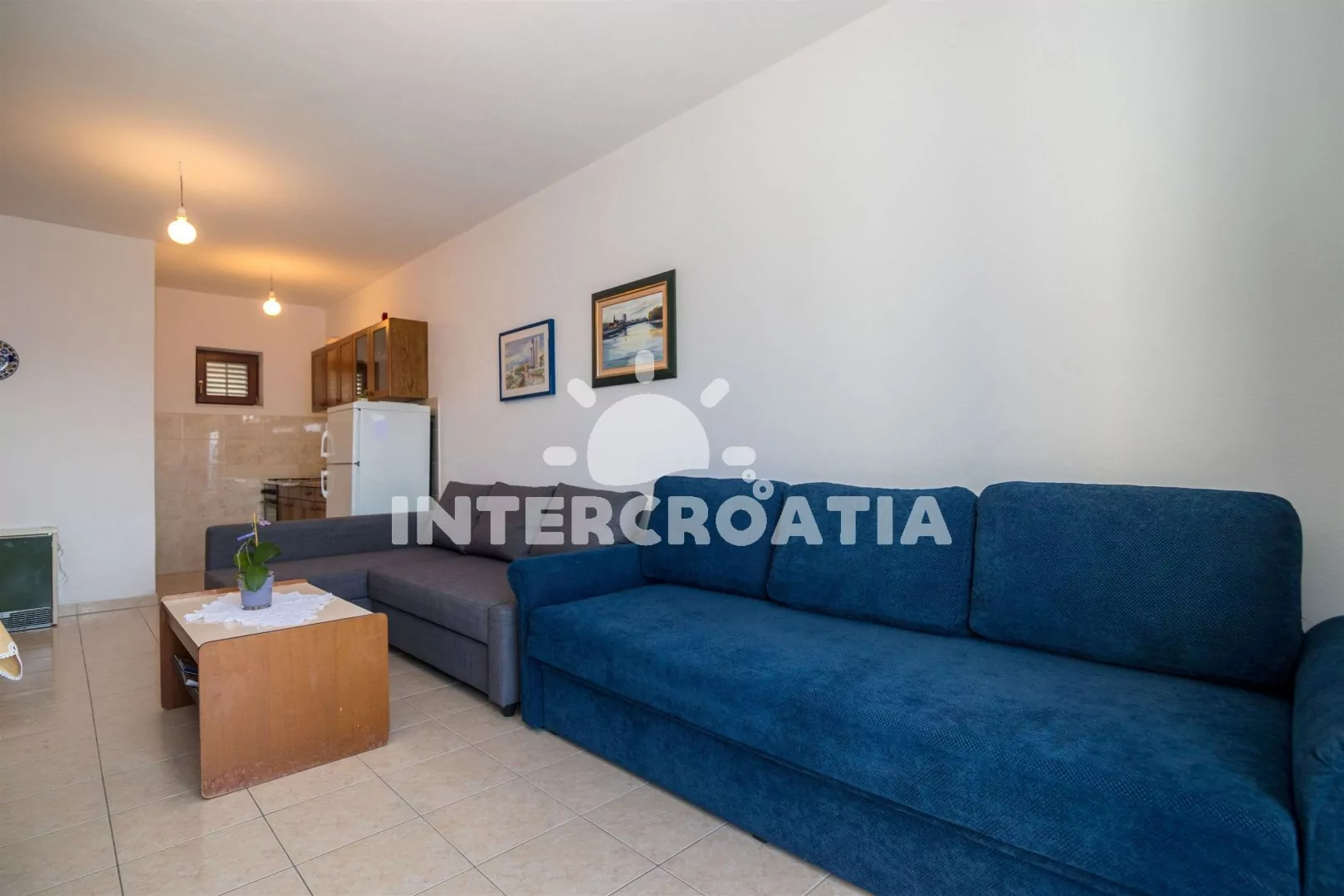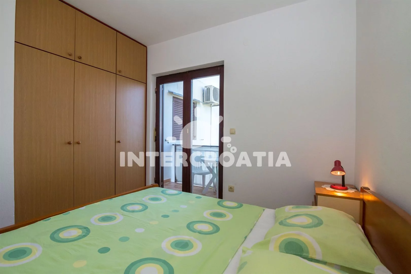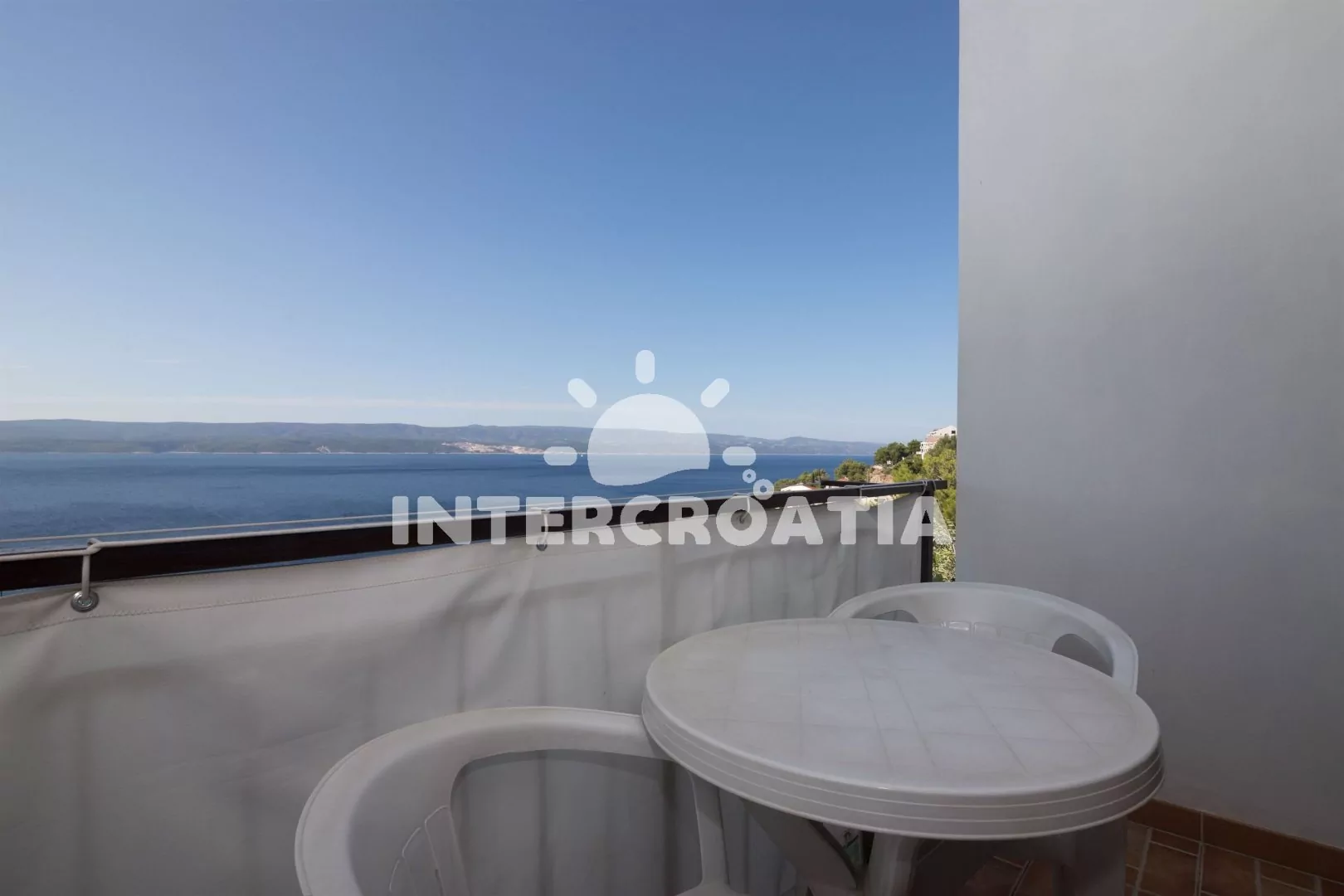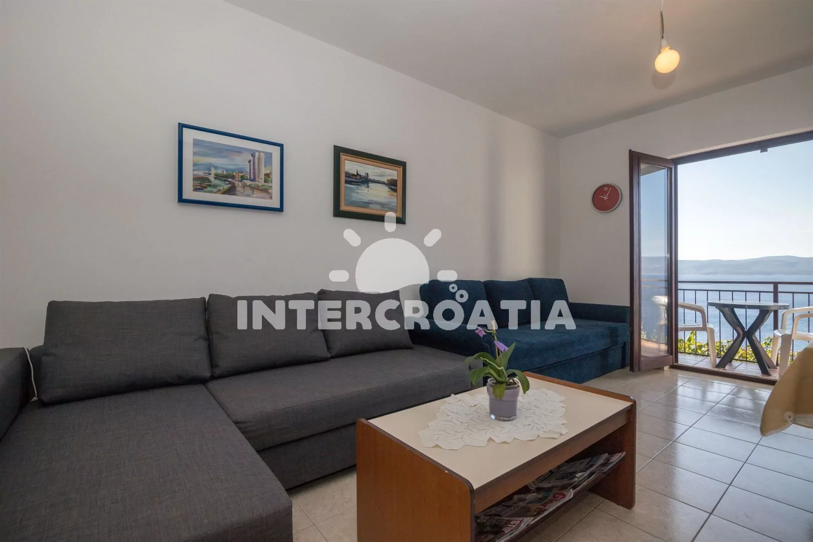 Apartmán s výhledem na moře a balkonem se nachází v prvním patře domu a je vhodný pro 2 až 4 osoby. Obývací pokoj je spojený s kuchyní. Kuchyňská linka je vybavena sporákem, troubou, nádobím a lednicí s mrazákem. Obývací pokoj s jídelním stolem pro 4 osoby, dvěma pohovkami (rozložitelné na extra lůžka pro 2 osoby), televizí se satelitním programem, klimatizací a vstupem na balkon. Ložnice s jedním dvoulůžkem a vstupem na balkon. Koupelna se sprchovým koutem, umyvadlem a wc. Hostům je k dispozici parkování u objektu zdarma.