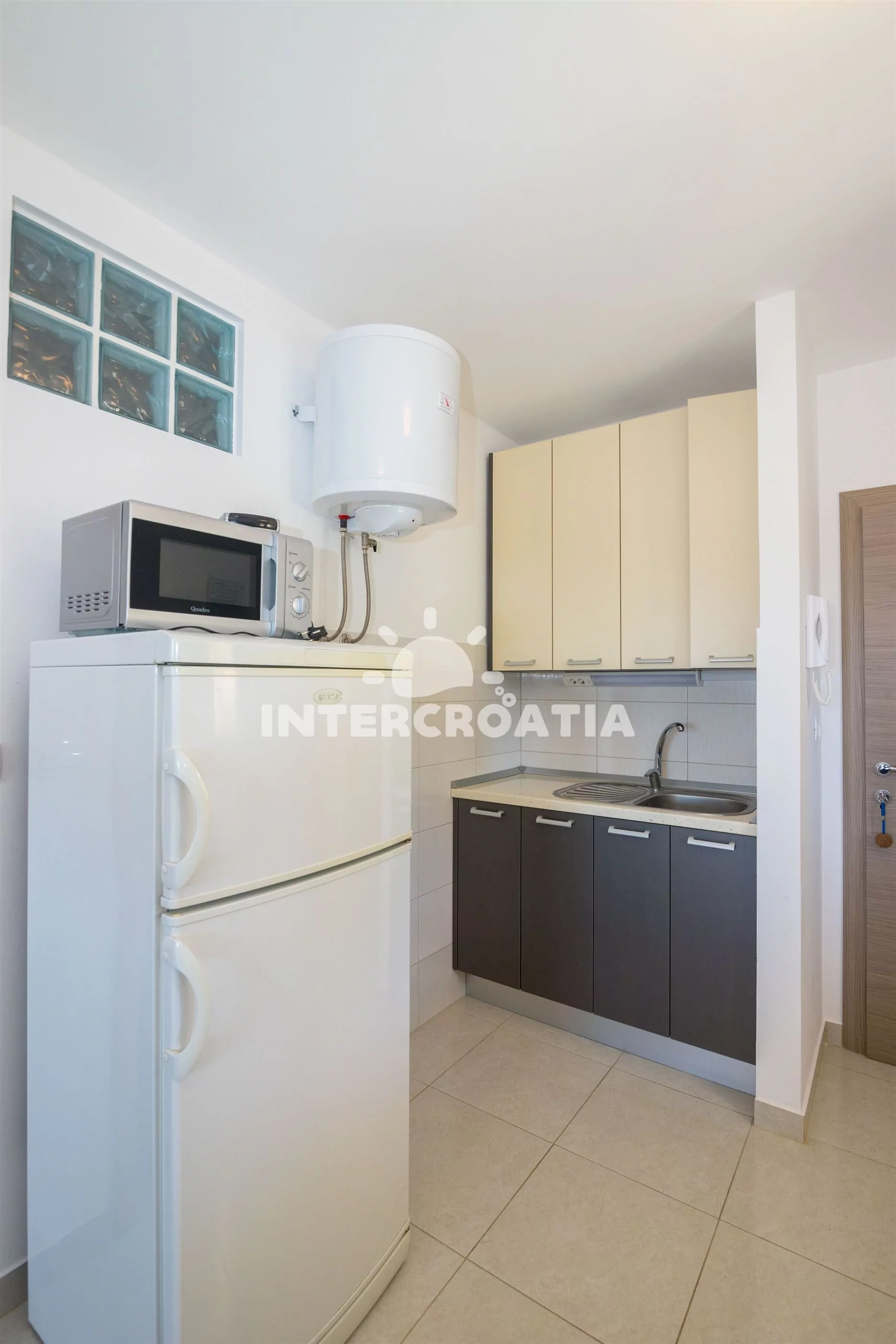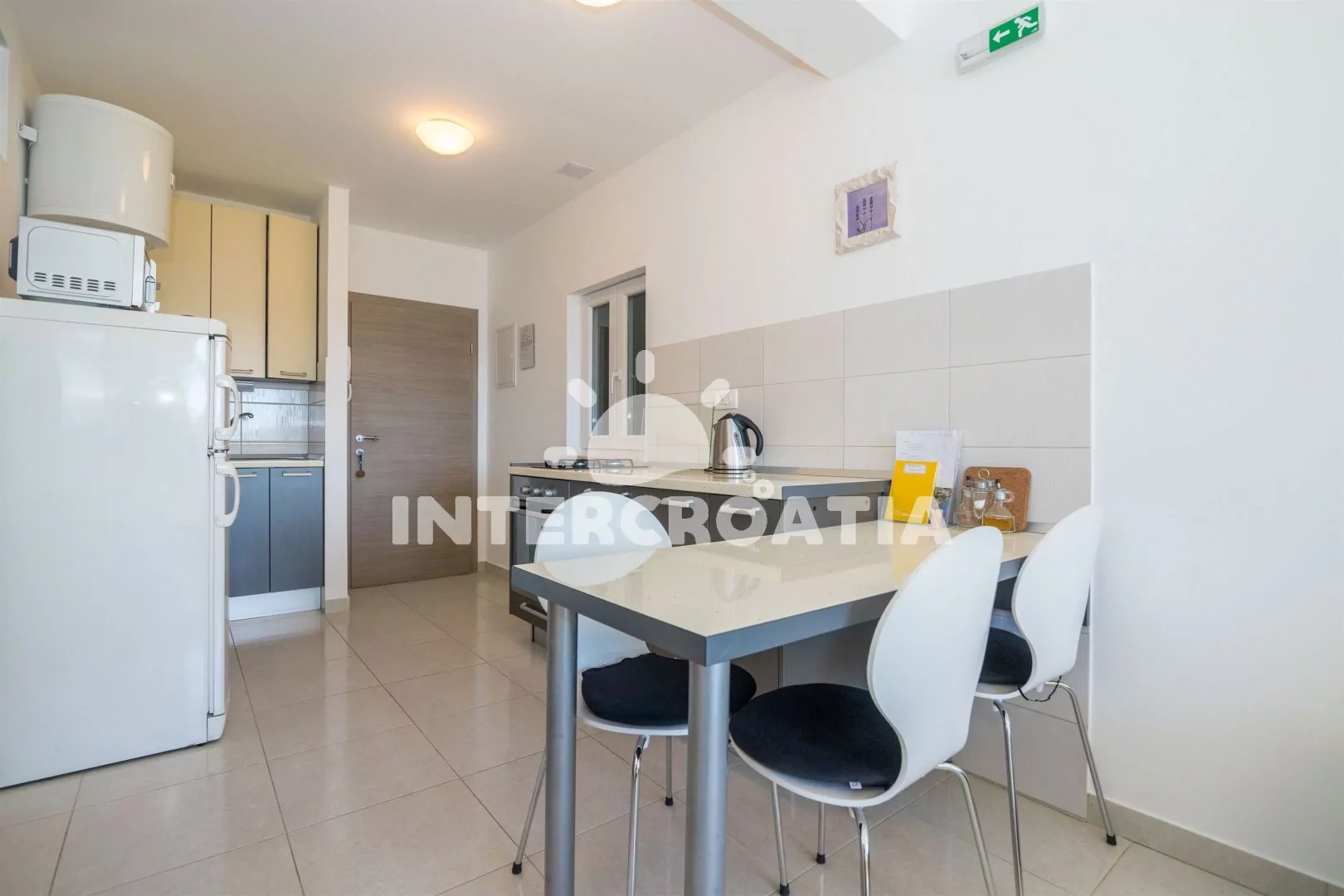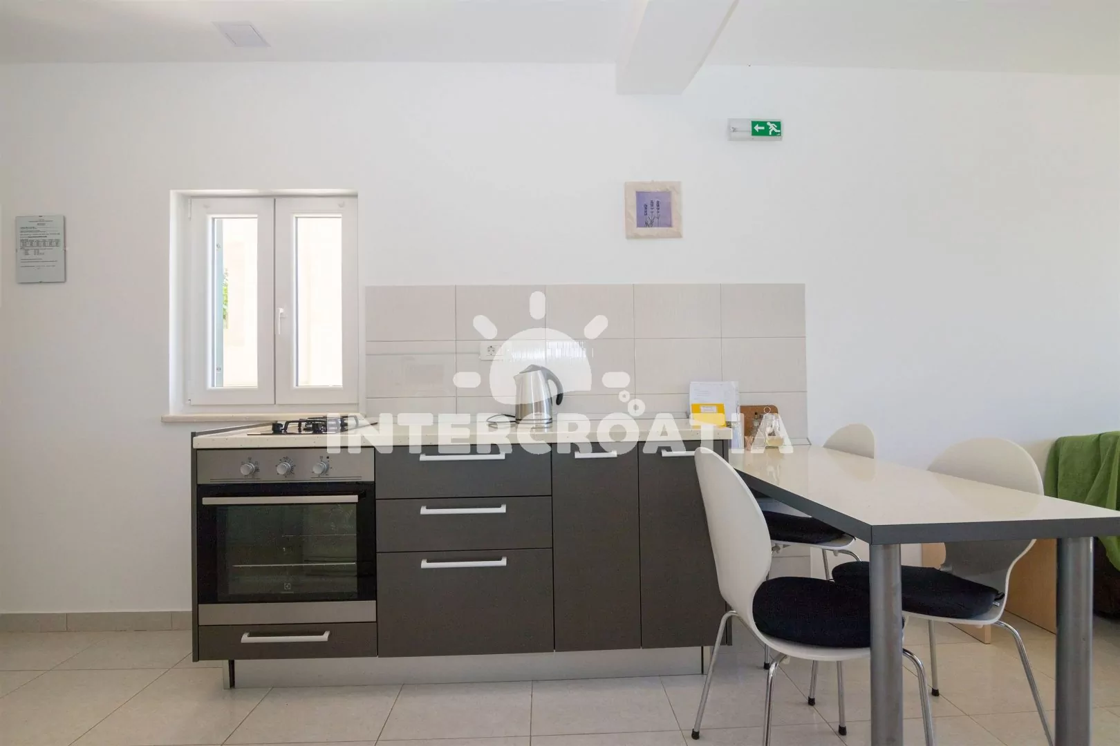 Apartmán (35 m2) s balkonem a výhledem na moře se nachází v přízemí domu a je vhodný pro 2 až 4 osoby. Obývací pokoj je spojený s kuchyní. Kuchyňská linka je vybavena dvouplotýnkovým vařičem, troubou, rychlovarnou konvicí, mikrovlnnou troubou, nádobím a lednicí s mrazákem. Obývací pokoj s jídelním stolem pro 4 osoby, pohovkou (rozložitelná na extra lůžko pro 2 osoby), televizí se satelitním programem, radiem a klimatizací. Ložnice s dvoulůžkem a vstupem na balkon. Koupelna se sprchovým koutem, umyvadlem, fénem a wc. Hostům je k dispozici parkování u objektu zdarma.
