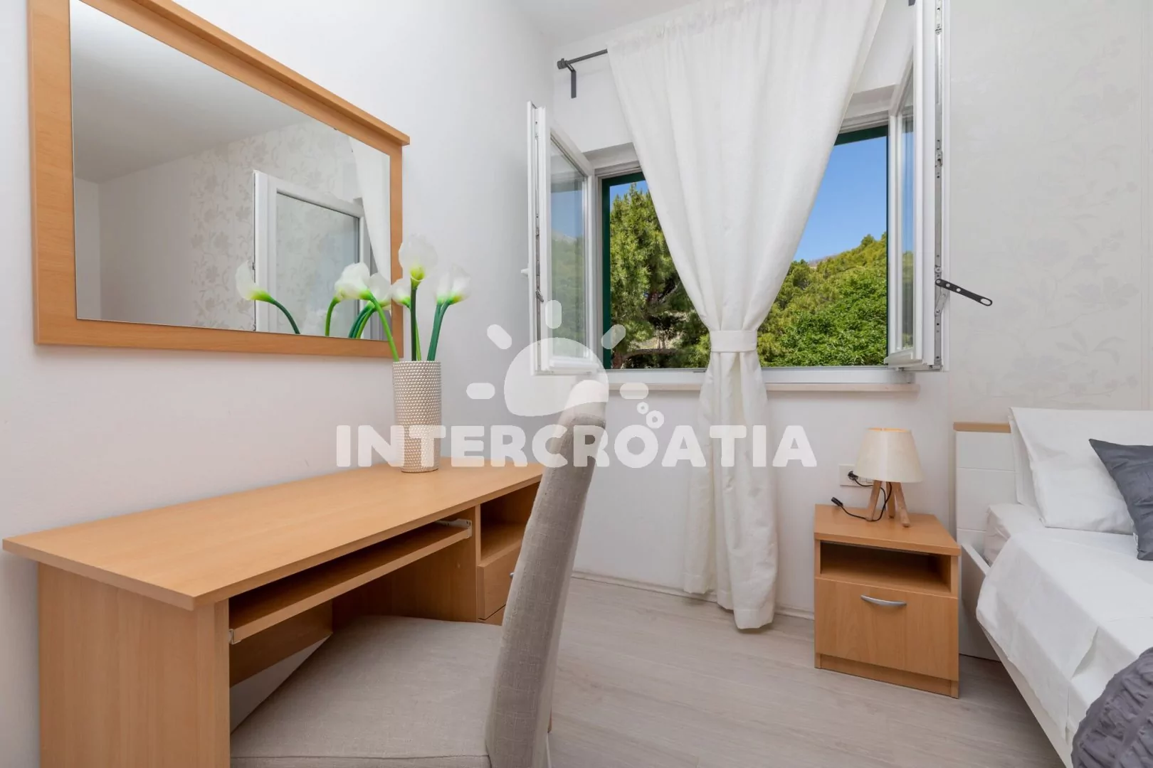 Apartmán (65 m2) s balkonem, posezením a výhledem na moře se nachází ve 2. patře vily. Apartmán má 1 ložnici a je vhodný pro 2 až 4 osoby. Obývací pokoj je spojený s kuchyní. Kuchyňská linka je vybavena sklokeramickou varnou deskou, digestoří, vestavěnou troubou, myčkou na nádobí, mikrovlnnou troubou, rychlovarnou konvicí, kávovarem, toustovačem, nádobím a lednicí s mrazákem. Obývací pokoj s jídelním stolem pro 4 osoby, pohovkou (rozložitelná na extra lůžko pro 2 osoby), televizí se satelitním programem, klimatizací a vstupem na terasu. Ložnice s jedním dvoulůžkem a sejfem. Koupelna se sprchovým koutem, umyvadlem, fénem a wc. Hostům je k dispozici parkování u vily zdarma.