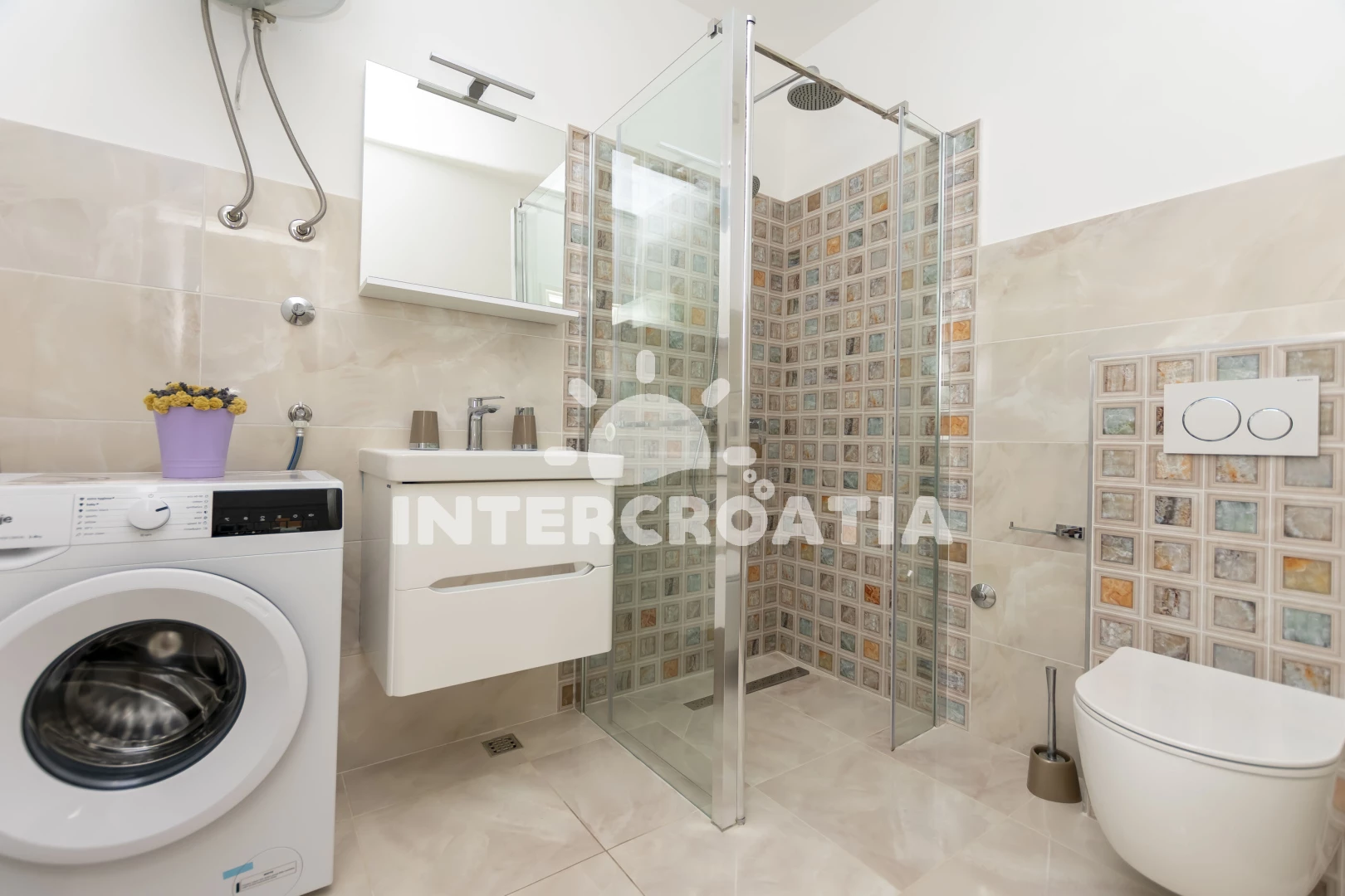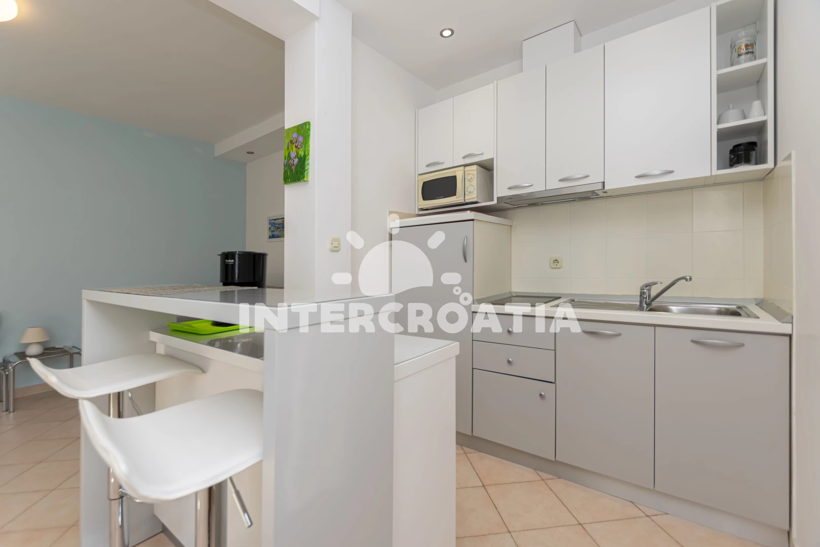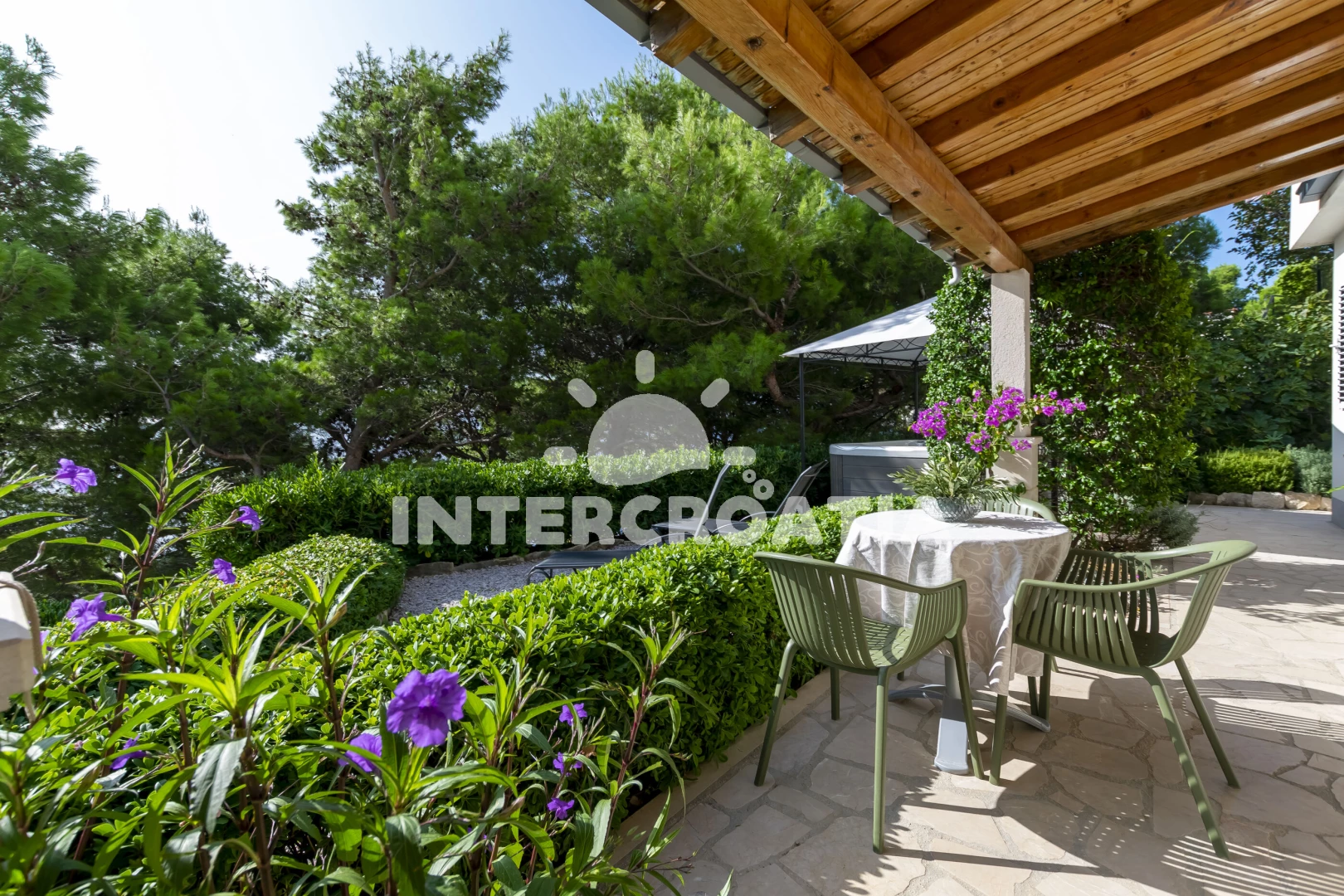 Apartmán (55 m2) s terasou, venkovním posezením a výhledem na moře se nachází v přízemí vily. Apartmán má 1 ložnici a je vhodný pro 2 až 4 osoby. Obývací pokoj je spojený s kuchyní. Kuchyňská linka je vybavena dvouplotýnkovým vařičem, digestoří, kávovarem, nádobím a lednicí s mrazákem. Obývací pokoj s jídelním stolem, pohovkou (rozložitelná na extra lůžko pro 1 osobu), televizí, klimatizací a vstupem na terasu. Ložnice s dvoulůžkem a přistýlkou. Koupelna se sprchovým koutem, umyvadlem, fénem, pračkou a wc. Hostům je k dispozici parkování u vily zdarma.